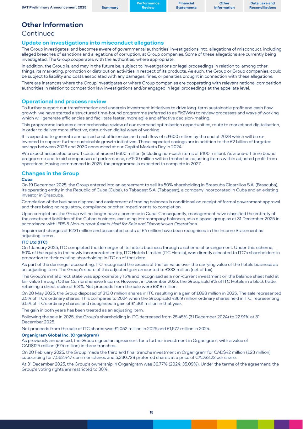 Other Information Continued Update on investigations into misconduct allegations The Group investigates, and becomes aware of governmental authorities’ investigations into, allegations of misconduct, including alleged breaches of sanctions and allegations of corruption, at Group companies. Some of these allegations are currently being investigated. The Group cooperates with the authorities, where appropriate. In addition, the Group is, and may in the future be, subject to investigations or legal proceedings in relation to, among other things, its marketing, promotion or distribution activities in respect of its products. As such, the Group or Group companies, could be subject to liability and costs associated with any damages, fines, or penalties brought in connection with these allegations. There are instances where the Group investigates or where Group companies are cooperating with relevant national competition authorities in relation to competition law investigations and/or engaged in legal proceedings at the appellate level. Operational and process review To further support our transformation and underpin investment initiatives to drive long-term sustainable profit and cash flow growth, we have started a structured time-bound programme (referred to as Fit2Win) to review processes and ways of working which will generate efficiencies and facilitate faster, more agile and effective decision-making. This programme includes a comprehensive review of our overhead optimisation opportunities, route to market and digitalisation, in order to deliver more effective, data-driven digital ways of working. It is expected to generate annualised cost efficiencies and cash flow of c.£600 million by the end of 2028 which will be re- invested to support further sustainable growth initiatives. These expected savings are in addition to the £2 billion of targeted savings between 2026 and 2030 announced at our Capital Markets Day in 2024. We expect associated one-off costs of around £600 million (including non-cash items of £100 million). As a one-off time bound programme and to aid comparison of performance, c.£500 million will be treated as adjusting items within adjusted profit from operations. Having commenced in 2025, the programme is expected to complete in 2027. Changes in the Group Cuba On 19 December 2025, the Group entered into an agreement to sell its 50% shareholding in Brascuba Cigarrillos S.A. (Brascuba), its operating entity in the Republic of Cuba (Cuba), to Tabagest S.A. (Tabagest), a company incorporated in Cuba and an existing investor in Brascuba. Completion of the business disposal and assignment of trading balances is conditional on receipt of formal government approval and there being no regulatory, compliance or other impediments to completion. Upon completion, the Group will no longer have a presence in Cuba. Consequently, management have classified the entirety of the assets and liabilities of the Cuban business, excluding intercompany balances, as a disposal group as at 31 December 2025 in accordance with IFRS 5 Non-current Assets Held for Sale and Discontinued Operations. Impairment charges of £231 million and associated costs of £4 million have been recognised in the Income Statement as adjusting items. ITC Ltd (ITC) On 1 January 2025, ITC completed the demerger of its hotels business through a scheme of arrangement. Under this scheme, 60% of the equity in the newly incorporated entity, ITC Hotels Limited (ITC Hotels), was directly allocated to ITC’s shareholders in proportion to their existing shareholding in ITC as of that date. As part of the demerger accounting, ITC recognised the excess of the fair value over the carrying value of the hotels business as an adjusting item. The Group’s share of this adjusted gain amounted to £333 million (net of tax). The Group’s initial direct stake was approximately 15% and recognised as a non-current investment on the balance sheet held at fair value through Other Comprehensive Income. However, in December 2025, the Group sold 9% of ITC Hotels in a block trade, retaining a direct stake of 6.3%. Net proceeds from the sale were £318 million. On 28 May 2025, the Group disposed of 313.0 million shares in ITC resulting in a gain of £898 million in 2025. The sale represented 2.5% of ITC's ordinary shares. This compares to 2024 when the Group sold 436.9 million ordinary shares held in ITC, representing 3.5% of ITC's ordinary shares, and recognised a gain of £1,361 million in that year. The gain in both years has been treated as an adjusting item. Following the sale in 2025, the Group's shareholding in ITC decreased from 25.45% (31 December 2024) to 22.91% at 31 December 2025. Net proceeds from the sale of ITC shares was £1,052 million in 2025 and £1,577 million in 2024. Organigram Global Inc. (Organigram) As previously announced, the Group signed an agreement for a further investment in Organigram, with a value of CAD$125 million (£74 million) in three tranches. On 28 February 2025, the Group made the third and final tranche investment in Organigram for CAD$42 million (£23 million), subscribing for 7,562,447 common shares and 5,330,728 preferred shares at a price of CAD$3.22 per share. At 31 December 2025, the Group's ownership in Organigram was 36.77% (2024: 35.09%). Under the terms of the agreement, the Group's voting rights are restricted to 30%. BAT Preliminary Announcement 2025 Summary Performance Review Financial Statements Other Information Data Lake and Reconciliations 15