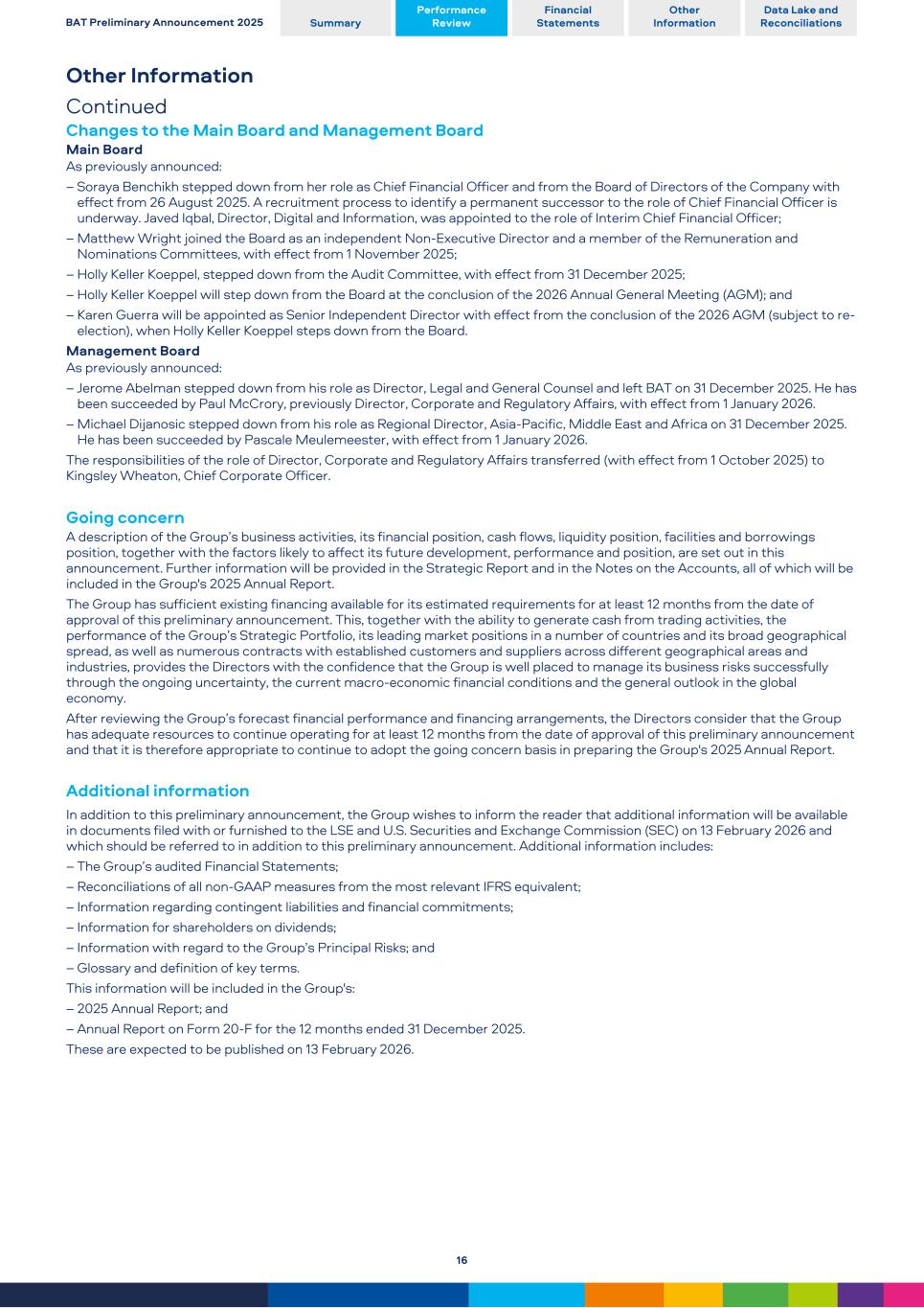 Other Information Continued Changes to the Main Board and Management Board Main Board As previously announced: – Soraya Benchikh stepped down from her role as Chief Financial Officer and from the Board of Directors of the Company with effect from 26 August 2025. A recruitment process to identify a permanent successor to the role of Chief Financial Officer is underway. Javed Iqbal, Director, Digital and Information, was appointed to the role of Interim Chief Financial Officer; – Matthew Wright joined the Board as an independent Non-Executive Director and a member of the Remuneration and Nominations Committees, with effect from 1 November 2025; – Holly Keller Koeppel, stepped down from the Audit Committee, with effect from 31 December 2025; – Holly Keller Koeppel will step down from the Board at the conclusion of the 2026 Annual General Meeting (AGM); and – Karen Guerra will be appointed as Senior Independent Director with effect from the conclusion of the 2026 AGM (subject to re- election), when Holly Keller Koeppel steps down from the Board. Management Board As previously announced: – Jerome Abelman stepped down from his role as Director, Legal and General Counsel and left BAT on 31 December 2025. He has been succeeded by Paul McCrory, previously Director, Corporate and Regulatory Affairs, with effect from 1 January 2026. – Michael Dijanosic stepped down from his role as Regional Director, Asia-Pacific, Middle East and Africa on 31 December 2025. He has been succeeded by Pascale Meulemeester, with effect from 1 January 2026. The responsibilities of the role of Director, Corporate and Regulatory Affairs transferred (with effect from 1 October 2025) to Kingsley Wheaton, Chief Corporate Officer. Going concern A description of the Group’s business activities, its financial position, cash flows, liquidity position, facilities and borrowings position, together with the factors likely to affect its future development, performance and position, are set out in this announcement. Further information will be provided in the Strategic Report and in the Notes on the Accounts, all of which will be included in the Group's 2025 Annual Report. The Group has sufficient existing financing available for its estimated requirements for at least 12 months from the date of approval of this preliminary announcement. This, together with the ability to generate cash from trading activities, the performance of the Group’s Strategic Portfolio, its leading market positions in a number of countries and its broad geographical spread, as well as numerous contracts with established customers and suppliers across different geographical areas and industries, provides the Directors with the confidence that the Group is well placed to manage its business risks successfully through the ongoing uncertainty, the current macro-economic financial conditions and the general outlook in the global economy. After reviewing the Group’s forecast financial performance and financing arrangements, the Directors consider that the Group has adequate resources to continue operating for at least 12 months from the date of approval of this preliminary announcement and that it is therefore appropriate to continue to adopt the going concern basis in preparing the Group's 2025 Annual Report. Additional information In addition to this preliminary announcement, the Group wishes to inform the reader that additional information will be available in documents filed with or furnished to the LSE and U.S. Securities and Exchange Commission (SEC) on 13 February 2026 and which should be referred to in addition to this preliminary announcement. Additional information includes: – The Group’s audited Financial Statements; – Reconciliations of all non-GAAP measures from the most relevant IFRS equivalent; – Information regarding contingent liabilities and financial commitments; – Information for shareholders on dividends; – Information with regard to the Group’s Principal Risks; and – Glossary and definition of key terms. This information will be included in the Group's: – 2025 Annual Report; and – Annual Report on Form 20-F for the 12 months ended 31 December 2025. These are expected to be published on 13 February 2026. BAT Preliminary Announcement 2025 Summary Performance Review Financial Statements Other Information Data Lake and Reconciliations 16
