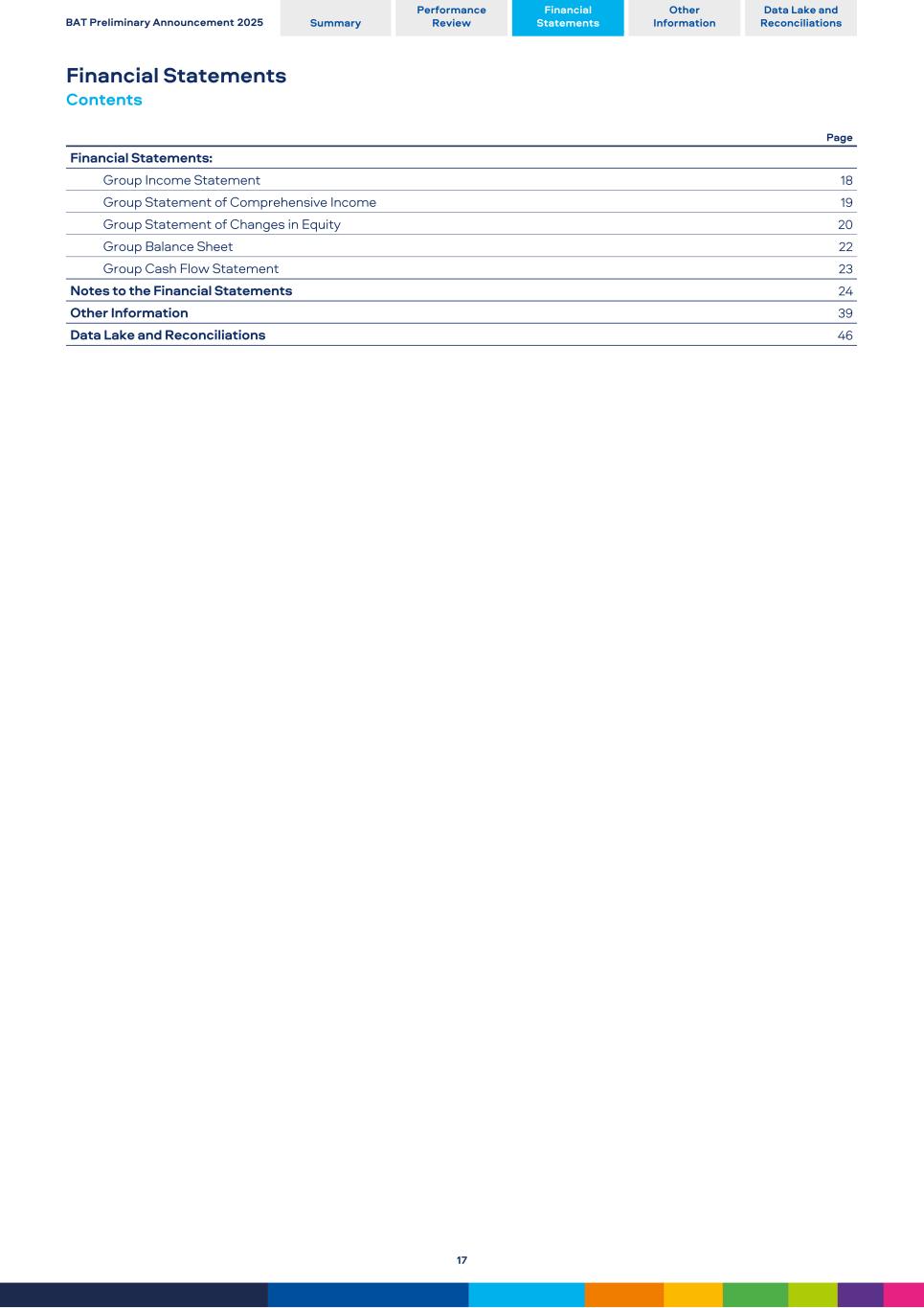 Financial Statements Contents Page Financial Statements: Group Income Statement 18 Group Statement of Comprehensive Income 19 Group Statement of Changes in Equity 20 Group Balance Sheet 22 Group Cash Flow Statement 23 Notes to the Financial Statements 24 Other Information 39 Data Lake and Reconciliations 46 BAT Preliminary Announcement 2025 Summary Performance Review Financial Statements Other Information Data Lake and Reconciliations 17