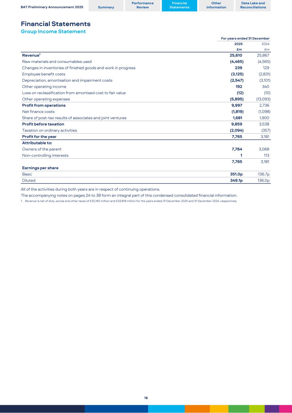 Financial Statements Group Income Statement For years ended 31 December 2025 2024 £m  £m Revenue1 25,610 25,867 Raw materials and consumables used (4,465) (4,565) Changes in inventories of finished goods and work in progress 239 129 Employee benefit costs (3,125) (2,831) Depreciation, amortisation and impairment costs (2,547) (3,101) Other operating income 192 340 Loss on reclassification from amortised cost to fair value (12) (10) Other operating expenses (5,895) (13,093) Profit from operations 9,997 2,736 Net finance costs (1,819) (1,098) Share of post-tax results of associates and joint ventures 1,681 1,900 Profit before taxation 9,859 3,538 Taxation on ordinary activities (2,094) (357) Profit for the year 7,765 3,181 Attributable to: Owners of the parent 7,764 3,068 Non-controlling interests 1 113 7,765 3,181 Earnings per share Basic 351.0p 136.7p Diluted 349.1p 136.0p All of the activities during both years are in respect of continuing operations. The accompanying notes on pages 24 to 38 form an integral part of this condensed consolidated financial information. 1. Revenue is net of duty, excise and other taxes of £32,160 million and £33,818 million for the years ended 31 December 2025 and 31 December 2024, respectively. BAT Preliminary Announcement 2025 Summary Performance Review Financial Statements Other Information Data Lake and Reconciliations 18
