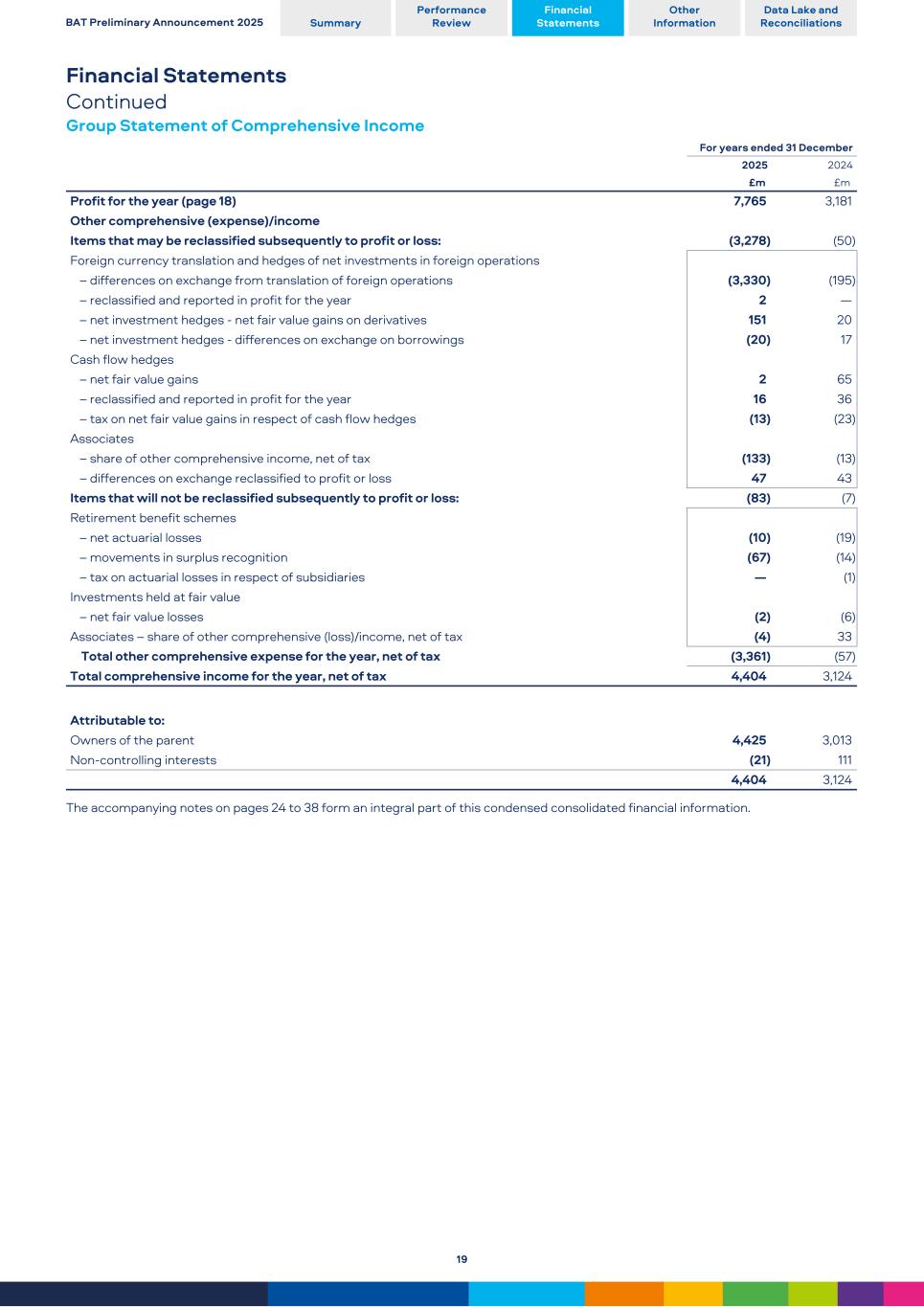 Financial Statements Continued Group Statement of Comprehensive Income For years ended 31 December 2025 2024 £m  £m  Profit for the year (page 18) 7,765 3,181 Other comprehensive (expense)/income Items that may be reclassified subsequently to profit or loss: (3,278) (50) Foreign currency translation and hedges of net investments in foreign operations – differences on exchange from translation of foreign operations (3,330) (195) – reclassified and reported in profit for the year 2 — – net investment hedges - net fair value gains on derivatives 151 20 – net investment hedges - differences on exchange on borrowings (20) 17 Cash flow hedges – net fair value gains 2 65 – reclassified and reported in profit for the year 16 36 – tax on net fair value gains in respect of cash flow hedges (13) (23) Associates – share of other comprehensive income, net of tax (133) (13) – differences on exchange reclassified to profit or loss 47 43 Items that will not be reclassified subsequently to profit or loss: (83) (7) Retirement benefit schemes – net actuarial losses (10) (19) – movements in surplus recognition (67) (14) – tax on actuarial losses in respect of subsidiaries — (1) Investments held at fair value – net fair value losses (2) (6) Associates – share of other comprehensive (loss)/income, net of tax (4) 33 Total other comprehensive expense for the year, net of tax (3,361) (57) Total comprehensive income for the year, net of tax 4,404 3,124 Attributable to: Owners of the parent 4,425 3,013 Non-controlling interests (21) 111 4,404 3,124 The accompanying notes on pages 24 to 38 form an integral part of this condensed consolidated financial information. BAT Preliminary Announcement 2025 Summary Performance Review Financial Statements Other Information Data Lake and Reconciliations 19