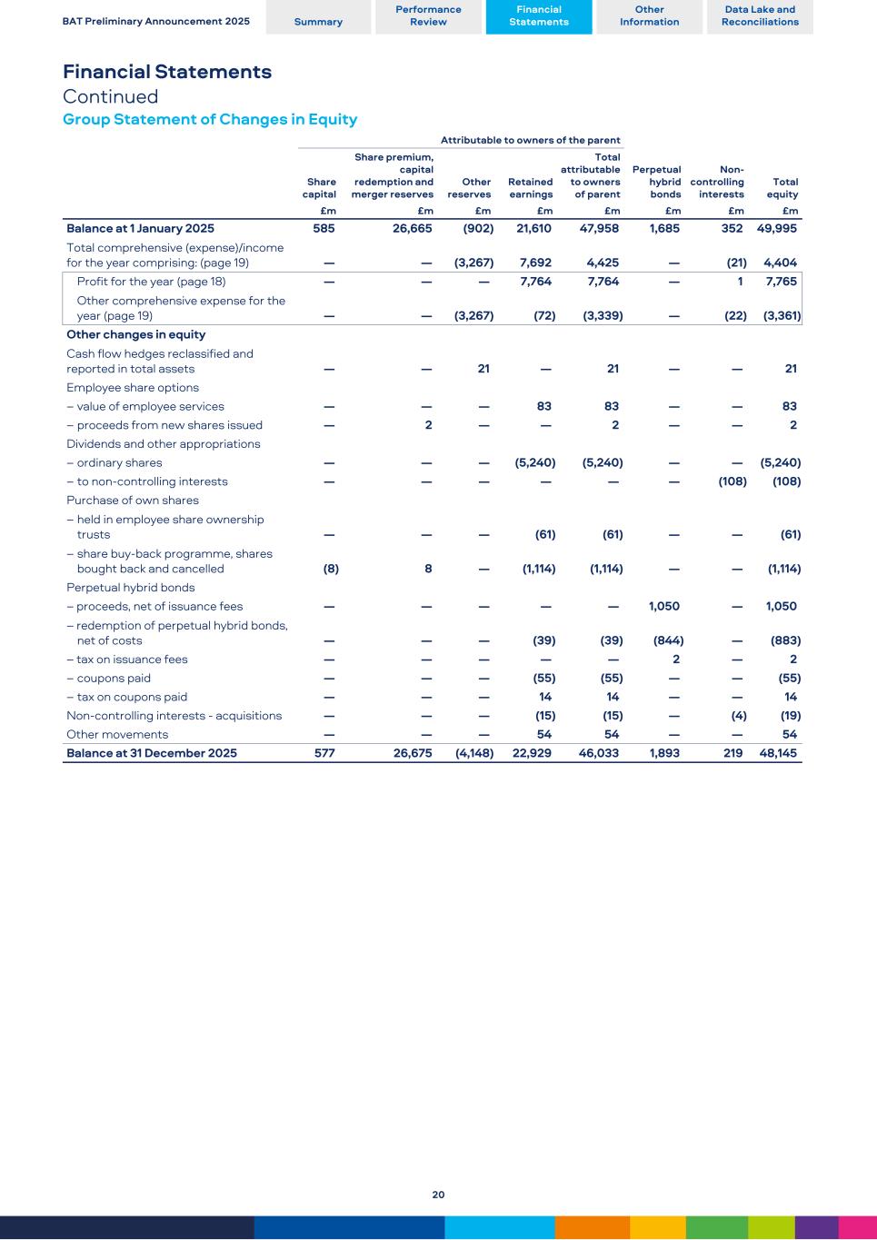 Financial Statements Continued Group Statement of Changes in Equity Attributable to owners of the parent Share capital Share premium, capital redemption and merger reserves Other reserves Retained earnings Total attributable to owners of parent Perpetual hybrid bonds Non- controlling interests Total equity £m £m £m £m £m £m £m £m Balance at 1 January 2025 585 26,665 (902) 21,610 47,958 1,685 352 49,995 Total comprehensive (expense)/income for the year comprising: (page 19) — — (3,267) 7,692 4,425 — (21) 4,404 Profit for the year (page 18) — — — 7,764 7,764 — 1 7,765 Other comprehensive expense for the year (page 19) — — (3,267) (72) (3,339) — (22) (3,361) Other changes in equity Cash flow hedges reclassified and reported in total assets — — 21 — 21 — — 21 Employee share options – value of employee services — — — 83 83 — — 83 – proceeds from new shares issued — 2 — — 2 — — 2 Dividends and other appropriations – ordinary shares — — — (5,240) (5,240) — — (5,240) – to non-controlling interests — — — — — — (108) (108) Purchase of own shares – held in employee share ownership trusts — — — (61) (61) — — (61) – share buy-back programme, shares bought back and cancelled (8) 8 — (1,114) (1,114) — — (1,114) Perpetual hybrid bonds – proceeds, net of issuance fees — — — — — 1,050 — 1,050 – redemption of perpetual hybrid bonds, net of costs — — — (39) (39) (844) — (883) – tax on issuance fees — — — — — 2 — 2 – coupons paid — — — (55) (55) — — (55) – tax on coupons paid — — — 14 14 — — 14 Non-controlling interests - acquisitions — — — (15) (15) — (4) (19) Other movements — — — 54 54 — — 54 Balance at 31 December 2025 577 26,675 (4,148) 22,929 46,033 1,893 219 48,145 BAT Preliminary Announcement 2025 Summary Performance Review Financial Statements Other Information Data Lake and Reconciliations 20