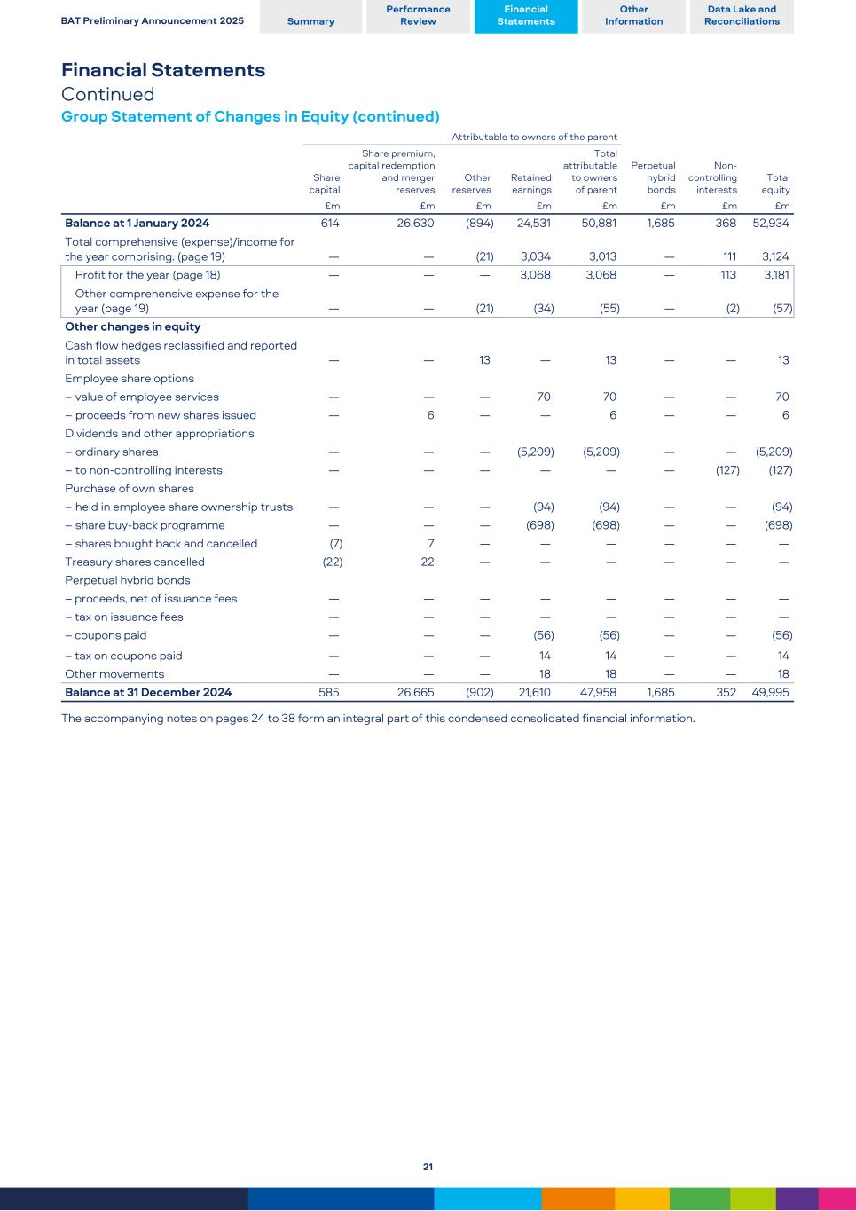 Financial Statements Continued Group Statement of Changes in Equity (continued) Attributable to owners of the parent Share capital Share premium, capital redemption and merger reserves Other reserves Retained earnings Total attributable to owners of parent Perpetual hybrid bonds Non- controlling interests Total equity £m £m £m £m £m £m £m £m Balance at 1 January 2024 614 26,630 (894) 24,531 50,881 1,685 368 52,934 Total comprehensive (expense)/income for the year comprising: (page 19) — — (21) 3,034 3,013 — 111 3,124 Profit for the year (page 18) — — — 3,068 3,068 — 113 3,181 Other comprehensive expense for the year (page 19) — — (21) (34) (55) — (2) (57) Other changes in equity Cash flow hedges reclassified and reported in total assets — — 13 — 13 — — 13 Employee share options – value of employee services — — — 70 70 — — 70 – proceeds from new shares issued — 6 — — 6 — — 6 Dividends and other appropriations – ordinary shares — — — (5,209) (5,209) — — (5,209) – to non-controlling interests — — — — — — (127) (127) Purchase of own shares – held in employee share ownership trusts — — — (94) (94) — — (94) – share buy-back programme — — — (698) (698) — — (698) – shares bought back and cancelled (7) 7 — — — — — — Treasury shares cancelled (22) 22 — — — — — — Perpetual hybrid bonds – proceeds, net of issuance fees — — — — — — — — – tax on issuance fees — — — — — — — — – coupons paid — — — (56) (56) — — (56) – tax on coupons paid — — — 14 14 — — 14 Other movements — — — 18 18 — — 18 Balance at 31 December 2024 585 26,665 (902) 21,610 47,958 1,685 352 49,995 The accompanying notes on pages 24 to 38 form an integral part of this condensed consolidated financial information. BAT Preliminary Announcement 2025 Summary Performance Review Financial Statements Other Information Data Lake and Reconciliations 21