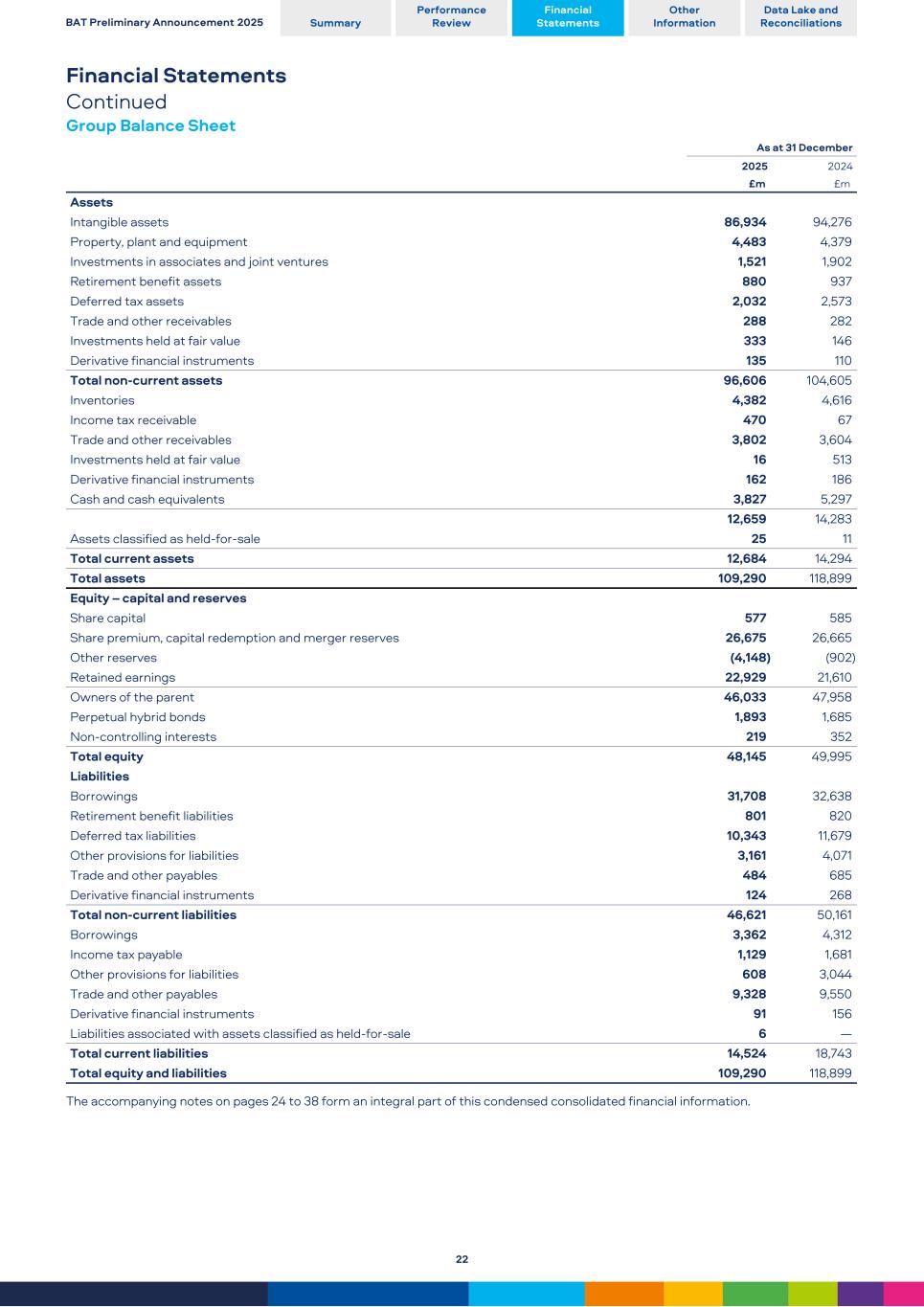 Financial Statements Continued Group Balance Sheet As at 31 December 2025 2024 £m  £m  Assets Intangible assets 86,934 94,276 Property, plant and equipment 4,483 4,379 Investments in associates and joint ventures 1,521 1,902 Retirement benefit assets 880 937 Deferred tax assets 2,032 2,573 Trade and other receivables 288 282 Investments held at fair value 333 146 Derivative financial instruments 135 110 Total non-current assets 96,606 104,605 Inventories 4,382 4,616 Income tax receivable 470 67 Trade and other receivables 3,802 3,604 Investments held at fair value 16 513 Derivative financial instruments 162 186 Cash and cash equivalents 3,827 5,297 12,659 14,283 Assets classified as held-for-sale 25 11 Total current assets 12,684 14,294 Total assets 109,290 118,899 Equity – capital and reserves Share capital 577 585 Share premium, capital redemption and merger reserves 26,675 26,665 Other reserves (4,148) (902) Retained earnings 22,929 21,610 Owners of the parent 46,033 47,958 Perpetual hybrid bonds 1,893 1,685 Non-controlling interests 219 352 Total equity 48,145 49,995 Liabilities Borrowings 31,708 32,638 Retirement benefit liabilities 801 820 Deferred tax liabilities 10,343 11,679 Other provisions for liabilities 3,161 4,071 Trade and other payables 484 685 Derivative financial instruments 124 268 Total non-current liabilities 46,621 50,161 Borrowings 3,362 4,312 Income tax payable 1,129 1,681 Other provisions for liabilities 608 3,044 Trade and other payables 9,328 9,550 Derivative financial instruments 91 156 Liabilities associated with assets classified as held-for-sale 6 — Total current liabilities 14,524 18,743 Total equity and liabilities 109,290 118,899 The accompanying notes on pages 24 to 38 form an integral part of this condensed consolidated financial information. BAT Preliminary Announcement 2025 Summary Performance Review Financial Statements Other Information Data Lake and Reconciliations 22