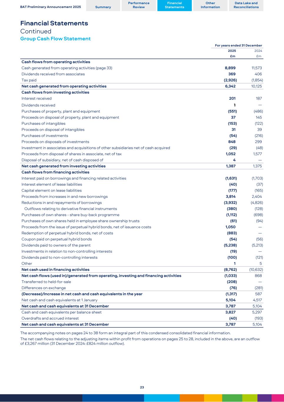 Financial Statements Continued Group Cash Flow Statement For years ended 31 December 2025 2024 £m  £m  Cash flows from operating activities Cash generated from operating activities (page 33) 8,899 11,573 Dividends received from associates 369 406 Tax paid (2,926) (1,854) Net cash generated from operating activities 6,342 10,125 Cash flows from investing activities Interest received 201 187 Dividends received 1 — Purchases of property, plant and equipment (551) (486) Proceeds on disposal of property, plant and equipment 37 145 Purchases of intangibles (153) (122) Proceeds on disposal of intangibles 31 39 Purchases of investments (54) (216) Proceeds on disposals of investments 848 299 Investment in associates and acquisitions of other subsidiaries net of cash acquired (29) (48) Proceeds from disposal of shares in associate, net of tax 1,052 1,577 Disposal of subsidiary, net of cash disposed of 4 — Net cash generated from investing activities 1,387 1,375 Cash flows from financing activities Interest paid on borrowings and financing related activities (1,631) (1,703) Interest element of lease liabilities (40) (37) Capital element on lease liabilities (177) (165) Proceeds from increases in and new borrowings 3,814 2,404 Reductions in and repayments of borrowings (3,932) (4,826) Outflows relating to derivative financial instruments (380) (128) Purchases of own shares - share buy-back programme (1,112) (698) Purchases of own shares held in employee share ownership trusts (61) (94) Proceeds from the issue of perpetual hybrid bonds, net of issuance costs 1,050 — Redemption of perpetual hybrid bonds, net of costs (883) — Coupon paid on perpetual hybrid bonds (54) (56) Dividends paid to owners of the parent (5,238) (5,213) Investments in relation to non-controlling interests (19) — Dividends paid to non-controlling interests (100) (121) Other 1 5 Net cash used in financing activities (8,762) (10,632) Net cash flows (used in)/generated from operating, investing and financing activities (1,033) 868 Transferred to held-for-sale (208) — Differences on exchange (76) (281) (Decrease)/Increase in net cash and cash equivalents in the year (1,317) 587 Net cash and cash equivalents at 1 January 5,104 4,517 Net cash and cash equivalents at 31 December 3,787 5,104 Cash and cash equivalents per balance sheet 3,827 5,297 Overdrafts and accrued interest (40) (193) Net cash and cash equivalents at 31 December 3,787 5,104 The accompanying notes on pages 24 to 38 form an integral part of this condensed consolidated financial information. The net cash flows relating to the adjusting items within profit from operations on pages 25 to 28, included in the above, are an outflow of £3,267 million (31 December 2024: £824 million outflow). BAT Preliminary Announcement 2025 Summary Performance Review Financial Statements Other Information Data Lake and Reconciliations 23