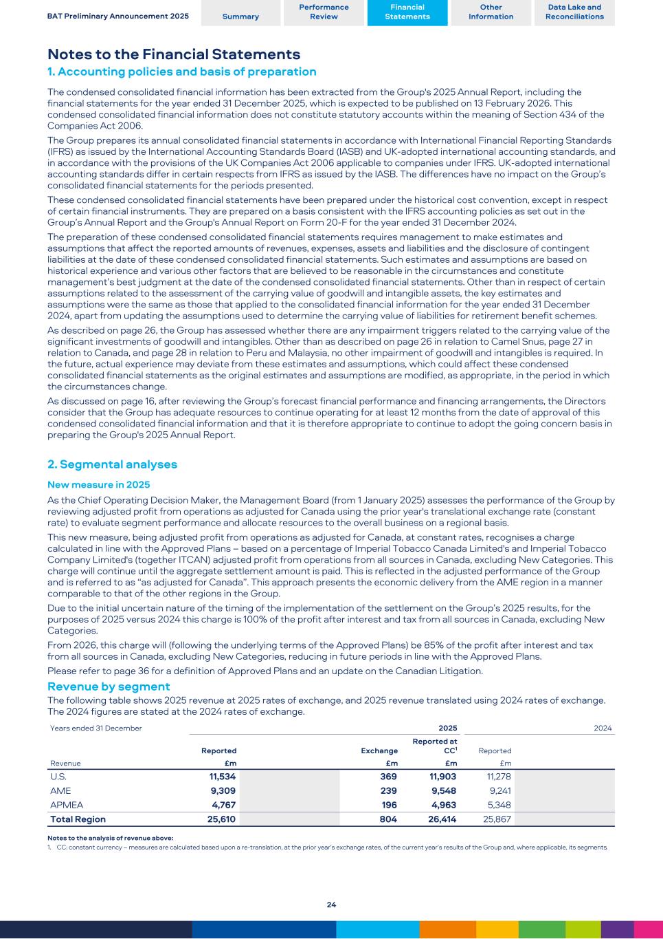 Notes to the Financial Statements 1. Accounting policies and basis of preparation The condensed consolidated financial information has been extracted from the Group's 2025 Annual Report, including the financial statements for the year ended 31 December 2025, which is expected to be published on 13 February 2026. This condensed consolidated financial information does not constitute statutory accounts within the meaning of Section 434 of the Companies Act 2006. The Group prepares its annual consolidated financial statements in accordance with International Financial Reporting Standards (IFRS) as issued by the International Accounting Standards Board (IASB) and UK-adopted international accounting standards, and in accordance with the provisions of the UK Companies Act 2006 applicable to companies under IFRS. UK-adopted international accounting standards differ in certain respects from IFRS as issued by the IASB. The differences have no impact on the Group’s consolidated financial statements for the periods presented. These condensed consolidated financial statements have been prepared under the historical cost convention, except in respect of certain financial instruments. They are prepared on a basis consistent with the IFRS accounting policies as set out in the Group’s Annual Report and the Group's Annual Report on Form 20-F for the year ended 31 December 2024. The preparation of these condensed consolidated financial statements requires management to make estimates and assumptions that affect the reported amounts of revenues, expenses, assets and liabilities and the disclosure of contingent liabilities at the date of these condensed consolidated financial statements. Such estimates and assumptions are based on historical experience and various other factors that are believed to be reasonable in the circumstances and constitute management’s best judgment at the date of the condensed consolidated financial statements. Other than in respect of certain assumptions related to the assessment of the carrying value of goodwill and intangible assets, the key estimates and assumptions were the same as those that applied to the consolidated financial information for the year ended 31 December 2024, apart from updating the assumptions used to determine the carrying value of liabilities for retirement benefit schemes. As described on page 26, the Group has assessed whether there are any impairment triggers related to the carrying value of the significant investments of goodwill and intangibles. Other than as described on page 26 in relation to Camel Snus, page 27 in relation to Canada, and page 28 in relation to Peru and Malaysia, no other impairment of goodwill and intangibles is required. In the future, actual experience may deviate from these estimates and assumptions, which could affect these condensed consolidated financial statements as the original estimates and assumptions are modified, as appropriate, in the period in which the circumstances change. As discussed on page 16, after reviewing the Group’s forecast financial performance and financing arrangements, the Directors consider that the Group has adequate resources to continue operating for at least 12 months from the date of approval of this condensed consolidated financial information and that it is therefore appropriate to continue to adopt the going concern basis in preparing the Group's 2025 Annual Report. 2. Segmental analyses New measure in 2025 As the Chief Operating Decision Maker, the Management Board (from 1 January 2025) assesses the performance of the Group by reviewing adjusted profit from operations as adjusted for Canada using the prior year's translational exchange rate (constant rate) to evaluate segment performance and allocate resources to the overall business on a regional basis. This new measure, being adjusted profit from operations as adjusted for Canada, at constant rates, recognises a charge calculated in line with the Approved Plans – based on a percentage of Imperial Tobacco Canada Limited's and Imperial Tobacco Company Limited's (together ITCAN) adjusted profit from operations from all sources in Canada, excluding New Categories. This charge will continue until the aggregate settlement amount is paid. This is reflected in the adjusted performance of the Group and is referred to as “as adjusted for Canada”. This approach presents the economic delivery from the AME region in a manner comparable to that of the other regions in the Group. Due to the initial uncertain nature of the timing of the implementation of the settlement on the Group’s 2025 results, for the purposes of 2025 versus 2024 this charge is 100% of the profit after interest and tax from all sources in Canada, excluding New Categories. From 2026, this charge will (following the underlying terms of the Approved Plans) be 85% of the profit after interest and tax from all sources in Canada, excluding New Categories, reducing in future periods in line with the Approved Plans. Please refer to page 36 for a definition of Approved Plans and an update on the Canadian Litigation. Revenue by segment The following table shows 2025 revenue at 2025 rates of exchange, and 2025 revenue translated using 2024 rates of exchange. The 2024 figures are stated at the 2024 rates of exchange. Years ended 31 December 2025 2024 Reported Exchange Reported at CC1 Reported Revenue £m £m £m £m U.S. 11,534 369 11,903 11,278 AME 9,309 239 9,548 9,241 APMEA 4,767 196 4,963 5,348 Total Region 25,610 804 26,414 25,867 Notes to the analysis of revenue above: 1. CC: constant currency – measures are calculated based upon a re-translation, at the prior year’s exchange rates, of the current year’s results of the Group and, where applicable, its segments. BAT Preliminary Announcement 2025 Summary Performance Review Financial Statements Other Information Data Lake and Reconciliations 24