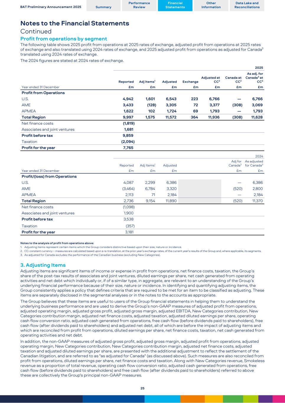 Notes to the Financial Statements Continued Profit from operations by segment The following table shows 2025 profit from operations at 2025 rates of exchange, adjusted profit from operations at 2025 rates of exchange and also translated using 2024 rates of exchange, and 2025 adjusted profit from operations as adjusted for Canada3 translated using 2024 rates of exchange. The 2024 figures are stated at 2024 rates of exchange. Year ended 31 December 2025 Reported Adj Items1 Adjusted Exchange Adjusted at CC2 Canada at CC2 As adj. for Canada3 at CC2 £m £m £m £m £m £m £m Profit from Operations U.S. 4,942 1,601 6,543 223 6,766 — 6,766 AME 3,433 (128) 3,305 72 3,377 (308) 3,069 APMEA 1,622 102 1,724 69 1,793 — 1,793 Total Region 9,997 1,575 11,572 364 11,936 (308) 11,628 Net finance costs (1,819) Associates and joint ventures 1,681 Profit before tax 9,859 Taxation (2,094) Profit for the year 7,765 Year ended 31 December 2024 Reported Adj Items1 Adjusted Adj for Canada3 As adjusted for Canada3 £m £m £m £m £m Profit/(loss) from Operations U.S. 4,087 2,299 6,386 — 6,386 AME (3,464) 6,784 3,320 (520) 2,800 APMEA 2,113 71 2,184 — 2,184 Total Region 2,736 9,154 11,890 (520) 11,370 Net finance costs (1,098) Associates and joint ventures 1,900 Profit before tax 3,538 Taxation (357) Profit for the year 3,181 Notes to the analysis of profit from operations above: 1. Adjusting items represent certain items which the Group considers distinctive based upon their size, nature or incidence. 2. CC: constant currency – measures are calculated based upon a re-translation, at the prior year’s exchange rates, of the current year’s results of the Group and, where applicable, its segments. 3. As adjusted for Canada excludes the performance of the Canadian business (excluding New Categories). 3. Adjusting Items Adjusting items are significant items of income or expense in profit from operations, net finance costs, taxation, the Group’s share of the post-tax results of associates and joint ventures, diluted earnings per share, net cash generated from operating activities and net debt which individually or, if of a similar type, in aggregate, are relevant to an understanding of the Group’s underlying financial performance because of their size, nature or incidence. In identifying and quantifying adjusting items, the Group consistently applies a policy that defines criteria that are required to be met for an item to be classified as adjusting. These items are separately disclosed in the segmental analyses or in the notes to the accounts as appropriate. The Group believes that these items are useful to users of the Group financial statements in helping them to understand the underlying business performance and are used to derive the Group’s non-GAAP measures of adjusted profit from operations, adjusted operating margin, adjusted gross profit, adjusted gross margin, adjusted EBITDA, New Categories contribution, New Categories contribution margin, adjusted net finance costs, adjusted taxation, adjusted diluted earnings per share, operating cash flow conversion ratio, adjusted cash generated from operations, free cash flow (before dividends paid to shareholders), free cash flow (after dividends paid to shareholders) and adjusted net debt, all of which are before the impact of adjusting items and which are reconciled from profit from operations, diluted earnings per share, net finance costs, taxation, net cash generated from operating activities and net debt. In addition, the non-GAAP measures of adjusted gross profit, adjusted gross margin, adjusted profit from operations, adjusted operating margin, New Categories contribution, New Categories contribution margin, adjusted net finance costs, adjusted taxation and adjusted diluted earnings per share, are presented with the additional adjustment to reflect the settlement of the Canadian litigation, and are referred to as "as adjusted for Canada" (as discussed above). Such measures are also reconciled from profit from operations, diluted earnings per share, net finance costs and taxation. Along with New Categories revenue, Smokeless revenue as a proportion of total revenue, operating cash flow conversion ratio, adjusted cash generated from operations, free cash flow (before dividends paid to shareholders) and free cash flow (after dividends paid to shareholders) referred to above these are collectively the Group's principal non-GAAP measures. BAT Preliminary Announcement 2025 Summary Performance Review Financial Statements Other Information Data Lake and Reconciliations 25