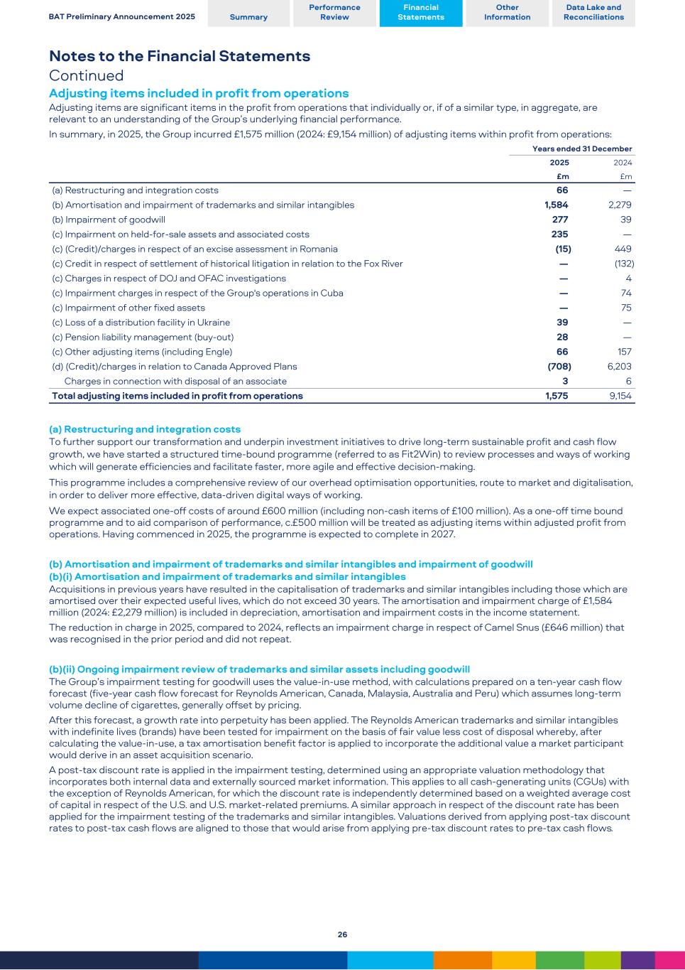 Notes to the Financial Statements Continued Adjusting items included in profit from operations Adjusting items are significant items in the profit from operations that individually or, if of a similar type, in aggregate, are relevant to an understanding of the Group’s underlying financial performance. In summary, in 2025, the Group incurred £1,575 million (2024: £9,154 million) of adjusting items within profit from operations: Years ended 31 December 2025 2024 £m £m (a) Restructuring and integration costs 66 — (b) Amortisation and impairment of trademarks and similar intangibles 1,584 2,279 (b) Impairment of goodwill 277 39 (c) Impairment on held-for-sale assets and associated costs 235 — (c) (Credit)/charges in respect of an excise assessment in Romania (15) 449 (c) Credit in respect of settlement of historical litigation in relation to the Fox River — (132) (c) Charges in respect of DOJ and OFAC investigations — 4 (c) Impairment charges in respect of the Group's operations in Cuba — 74 (c) Impairment of other fixed assets — 75 (c) Loss of a distribution facility in Ukraine 39 — (c) Pension liability management (buy-out) 28 — (c) Other adjusting items (including Engle) 66 157 (d) (Credit)/charges in relation to Canada Approved Plans (708) 6,203 Charges in connection with disposal of an associate 3 6 Total adjusting items included in profit from operations 1,575 9,154 (a) Restructuring and integration costs To further support our transformation and underpin investment initiatives to drive long-term sustainable profit and cash flow growth, we have started a structured time-bound programme (referred to as Fit2Win) to review processes and ways of working which will generate efficiencies and facilitate faster, more agile and effective decision-making. This programme includes a comprehensive review of our overhead optimisation opportunities, route to market and digitalisation, in order to deliver more effective, data-driven digital ways of working. We expect associated one-off costs of around £600 million (including non-cash items of £100 million). As a one-off time bound programme and to aid comparison of performance, c.£500 million will be treated as adjusting items within adjusted profit from operations. Having commenced in 2025, the programme is expected to complete in 2027. (b) Amortisation and impairment of trademarks and similar intangibles and impairment of goodwill (b)(i) Amortisation and impairment of trademarks and similar intangibles Acquisitions in previous years have resulted in the capitalisation of trademarks and similar intangibles including those which are amortised over their expected useful lives, which do not exceed 30 years. The amortisation and impairment charge of £1,584 million (2024: £2,279 million) is included in depreciation, amortisation and impairment costs in the income statement. The reduction in charge in 2025, compared to 2024, reflects an impairment charge in respect of Camel Snus (£646 million) that was recognised in the prior period and did not repeat. (b)(ii) Ongoing impairment review of trademarks and similar assets including goodwill The Group’s impairment testing for goodwill uses the value-in-use method, with calculations prepared on a ten-year cash flow forecast (five-year cash flow forecast for Reynolds American, Canada, Malaysia, Australia and Peru) which assumes long-term volume decline of cigarettes, generally offset by pricing. After this forecast, a growth rate into perpetuity has been applied. The Reynolds American trademarks and similar intangibles with indefinite lives (brands) have been tested for impairment on the basis of fair value less cost of disposal whereby, after calculating the value-in-use, a tax amortisation benefit factor is applied to incorporate the additional value a market participant would derive in an asset acquisition scenario. A post-tax discount rate is applied in the impairment testing, determined using an appropriate valuation methodology that incorporates both internal data and externally sourced market information. This applies to all cash-generating units (CGUs) with the exception of Reynolds American, for which the discount rate is independently determined based on a weighted average cost of capital in respect of the U.S. and U.S. market-related premiums. A similar approach in respect of the discount rate has been applied for the impairment testing of the trademarks and similar intangibles. Valuations derived from applying post-tax discount rates to post-tax cash flows are aligned to those that would arise from applying pre-tax discount rates to pre-tax cash flows. BAT Preliminary Announcement 2025 Summary Performance Review Financial Statements Other Information Data Lake and Reconciliations 26