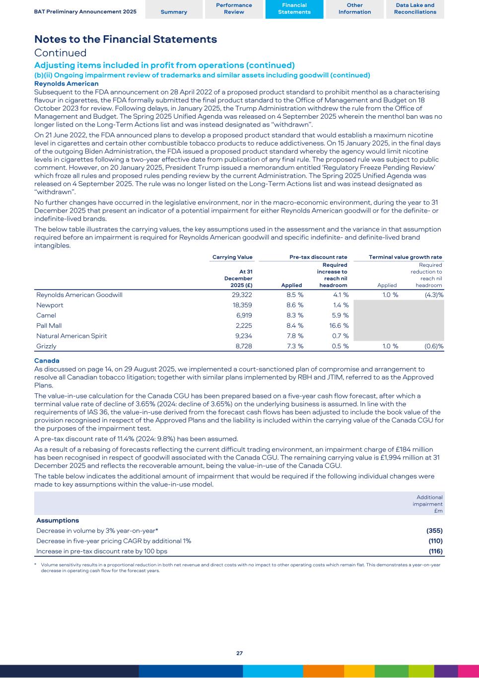 Notes to the Financial Statements Continued Adjusting items included in profit from operations (continued) (b)(ii) Ongoing impairment review of trademarks and similar assets including goodwill (continued) Reynolds American Subsequent to the FDA announcement on 28 April 2022 of a proposed product standard to prohibit menthol as a characterising flavour in cigarettes, the FDA formally submitted the final product standard to the Office of Management and Budget on 18 October 2023 for review. Following delays, in January 2025, the Trump Administration withdrew the rule from the Office of Management and Budget. The Spring 2025 Unified Agenda was released on 4 September 2025 wherein the menthol ban was no longer listed on the Long-Term Actions list and was instead designated as “withdrawn”. On 21 June 2022, the FDA announced plans to develop a proposed product standard that would establish a maximum nicotine level in cigarettes and certain other combustible tobacco products to reduce addictiveness. On 15 January 2025, in the final days of the outgoing Biden Administration, the FDA issued a proposed product standard whereby the agency would limit nicotine levels in cigarettes following a two-year effective date from publication of any final rule. The proposed rule was subject to public comment. However, on 20 January 2025, President Trump issued a memorandum entitled ‘Regulatory Freeze Pending Review’ which froze all rules and proposed rules pending review by the current Administration. The Spring 2025 Unified Agenda was released on 4 September 2025. The rule was no longer listed on the Long-Term Actions list and was instead designated as “withdrawn”. No further changes have occurred in the legislative environment, nor in the macro-economic environment, during the year to 31 December 2025 that present an indicator of a potential impairment for either Reynolds American goodwill or for the definite- or indefinite-lived brands. The below table illustrates the carrying values, the key assumptions used in the assessment and the variance in that assumption required before an impairment is required for Reynolds American goodwill and specific indefinite- and definite-lived brand intangibles. Carrying Value Pre-tax discount rate Terminal value growth rate At 31 December 2025 (£) Applied Required increase to reach nil headroom Applied Required reduction to reach nil headroom Reynolds American Goodwill 29,322 8.5 % 4.1 % 1.0 % (4.3) % Newport 18,359 8.6 % 1.4 % Camel 6,919 8.3 % 5.9 % Pall Mall 2,225 8.4 % 16.6 % Natural American Spirit 9,234 7.8 % 0.7 % Grizzly 8,728 7.3 % 0.5 % 1.0 % (0.6) % Canada As discussed on page 14, on 29 August 2025, we implemented a court-sanctioned plan of compromise and arrangement to resolve all Canadian tobacco litigation; together with similar plans implemented by RBH and JTIM, referred to as the Approved Plans. The value-in-use calculation for the Canada CGU has been prepared based on a five-year cash flow forecast, after which a terminal value rate of decline of 3.65% (2024: decline of 3.65%) on the underlying business is assumed. In line with the requirements of IAS 36, the value-in-use derived from the forecast cash flows has been adjusted to include the book value of the provision recognised in respect of the Approved Plans and the liability is included within the carrying value of the Canada CGU for the purposes of the impairment test. A pre-tax discount rate of 11.4% (2024: 9.8%) has been assumed. As a result of a rebasing of forecasts reflecting the current difficult trading environment, an impairment charge of £184 million has been recognised in respect of goodwill associated with the Canada CGU. The remaining carrying value is £1,994 million at 31 December 2025 and reflects the recoverable amount, being the value-in-use of the Canada CGU. The table below indicates the additional amount of impairment that would be required if the following individual changes were made to key assumptions within the value-in-use model. Additional impairment £m Assumptions Decrease in volume by 3% year-on-year* (355) Decrease in five-year pricing CAGR by additional 1% (110) Increase in pre-tax discount rate by 100 bps (116) * Volume sensitivity results in a proportional reduction in both net revenue and direct costs with no impact to other operating costs which remain flat. This demonstrates a year-on-year decrease in operating cash flow for the forecast years. BAT Preliminary Announcement 2025 Summary Performance Review Financial Statements Other Information Data Lake and Reconciliations 27