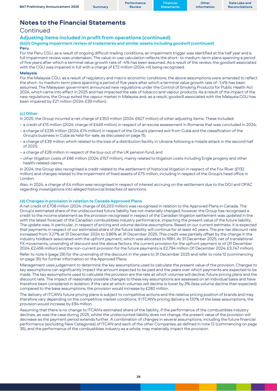 Notes to the Financial Statements Continued Adjusting items included in profit from operations (continued) (b)(ii) Ongoing impairment review of trademarks and similar assets including goodwill (continued) Peru For the Peru CGU, as a result of ongoing difficult trading conditions, an impairment trigger was identified at the half year and a full impairment review was undertaken. The value-in-use calculation reflects the short- to medium-term plans spanning a period of five years after which a terminal value growth rate of -4% has been assumed. As a result of the review, the goodwill associated with the CGU was impaired in full with a charge of £72 million (2024: nil) being recognised. Malaysia For the Malaysia CGU, as a result of regulatory and macro-economic conditions, the above assumptions were amended to reflect the short- to medium-term plans spanning a period of five years after which a terminal value growth rate of -1.4% has been assumed. The Malaysian government announced new regulations under the Control of Smoking Products for Public Health Act 2024, which came into effect in 2025 and has impacted the sale of tobacco and vapour products. As a result of the impact of the new regulations, the Group exited the vapour market in Malaysia and, as a result, goodwill associated with the Malaysia CGU has been impaired by £21 million (2024: £39 million). (c) Other In 2025, the Group incurred a net charge of £353 million (2024: £627 million) of other adjusting items. These included: – a credit of £15 million (2024: charge of £449 million) in respect of an excise assessment in Romania that was concluded in 2024; – a charge of £235 million (2024: £74 million) in respect of the Group's planned exit from Cuba and the classification of the Group's business in Cuba as held-for-sale, as discussed on page 15; – a charge of £39 million which related to the loss of a distribution facility in Ukraine following a missile attack in the second half of 2025; – a charge of £28 million in respect of the buy-out of the UK pension fund; and – other litigation costs of £66 million (2024: £157 million), mainly related to litigation costs including Engle progeny and other health-related claims. In 2024, the Group also recognised a credit related to the settlement of historical litigation in respect of the Fox River (£132 million) and charges related to the impairment of fixed assets of £75 million, including in respect of the Group's head office in London. Also, in 2024, a charge of £4 million was recognised in respect of interest accruing on the settlement due to the DOJ and OFAC regarding investigations into alleged historical breaches of sanctions. (d) Changes in provision in relation to Canada Approved Plans A net credit of £708 million (2024: charge of £6,203 million) was recognised in relation to the Approved Plans in Canada. The Group's estimated share of the undiscounted future liability has not materially changed, however the Group has recognised a credit to the income statement as the provision recognised in respect of the Canadian litigation settlement was updated in line with the latest forecast of the Canadian combustibles industry performance, impacting the present value of the future liability. The update was, in particular, in respect of pricing and volume decline assumptions. Based on our current estimate, it is expected that payments in respect of our estimated share of the future liability will continue for at least 40 years. The pre-tax discount rate increased from 3.27% at 31 December 2024 to 3.86% at 31 December 2025. This credit was partially offset by the change in the industry holdback associated with the upfront payment, which was allocated to RBH. At 31 December 2025, net of translational FX movements, unwinding of discount and the above factors, the current provision for the upfront payment is nil (31 December 2024: £2,456 million) and the non-current provision for the future payments is £2,794 million (31 December 2024: £3,747 million). Refer to note 4 (page 29) for the unwinding of the discount in the years to 31 December 2025 and refer to note 12 (commencing on page 35) for further information on the Approved Plans. Management uses judgement to determine the key assumptions used to calculate the present value of the provision. Changes to key assumptions can significantly impact the amount expected to be paid and the years over which payments are expected to be made. The key assumptions used to calculate the provision are the rate at which volumes will decline, future pricing plans and the discount rate. The impact of reasonably possible changes to these key assumptions are assessed on an individual basis and have therefore been considered in isolation. If the rate at which volumes will decline is lower by 3% (less volume decline than expected) compared to the base assumptions, the provision would increase by £282 million. The delivery of ITCAN's future pricing plans is subject to competitive actions and the relative pricing position of brands and may therefore vary depending on the competitive market conditions. If ITCAN's pricing delivery is 120% of the base assumptions, the provision would increase by £94 million. Assuming that there is no change to ITCAN's estimated share of the liability, if the performance of the combustibles industry declines, as was the case during 2025, whilst the undiscounted liability does not change, the present value of the provision will decrease as the payment period extends further. A combination of changes in several assumptions, including the future financial performance (excluding New Categories) of ITCAN and each of the other Companies, as defined in note 12 (commencing on page 35), and the performance of the combustibles industry as a whole, may materially impact the provision. BAT Preliminary Announcement 2025 Summary Performance Review Financial Statements Other Information Data Lake and Reconciliati