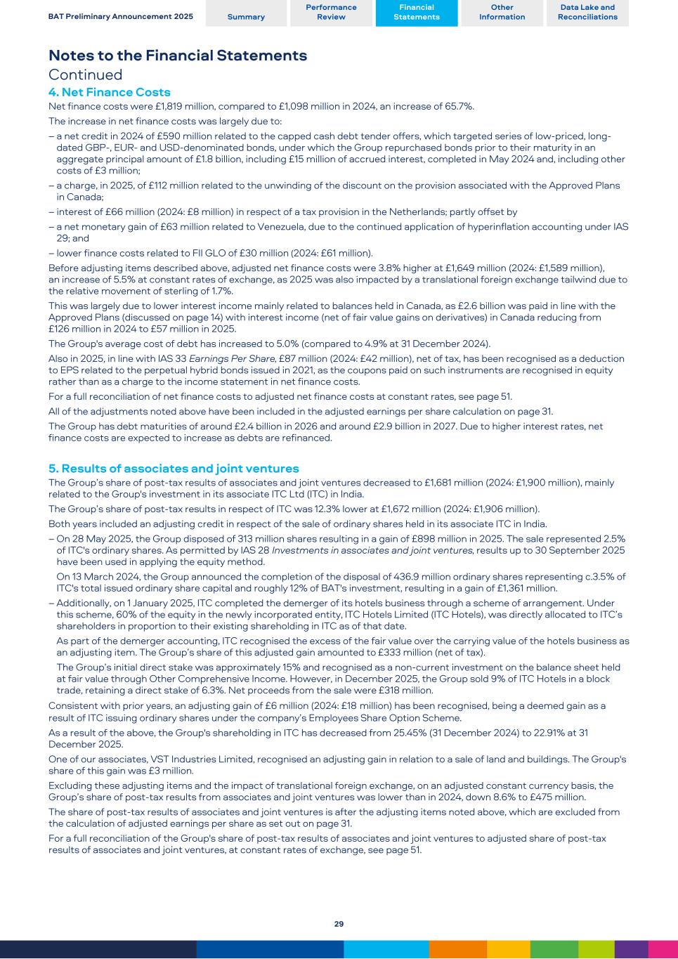 Notes to the Financial Statements Continued 4. Net Finance Costs Net finance costs were £1,819 million, compared to £1,098 million in 2024, an increase of 65.7%. The increase in net finance costs was largely due to: – a net credit in 2024 of £590 million related to the capped cash debt tender offers, which targeted series of low-priced, long- dated GBP-, EUR- and USD-denominated bonds, under which the Group repurchased bonds prior to their maturity in an aggregate principal amount of £1.8 billion, including £15 million of accrued interest, completed in May 2024 and, including other costs of £3 million; – a charge, in 2025, of £112 million related to the unwinding of the discount on the provision associated with the Approved Plans in Canada; – interest of £66 million (2024: £8 million) in respect of a tax provision in the Netherlands; partly offset by – a net monetary gain of £63 million related to Venezuela, due to the continued application of hyperinflation accounting under IAS 29; and – lower finance costs related to FII GLO of £30 million (2024: £61 million). Before adjusting items described above, adjusted net finance costs were 3.8% higher at £1,649 million (2024: £1,589 million), an increase of 5.5% at constant rates of exchange, as 2025 was also impacted by a translational foreign exchange tailwind due to the relative movement of sterling of 1.7%. This was largely due to lower interest income mainly related to balances held in Canada, as £2.6 billion was paid in line with the Approved Plans (discussed on page 14) with interest income (net of fair value gains on derivatives) in Canada reducing from £126 million in 2024 to £57 million in 2025. The Group's average cost of debt has increased to 5.0% (compared to 4.9% at 31 December 2024). Also in 2025, in line with IAS 33 Earnings Per Share, £87 million (2024: £42 million), net of tax, has been recognised as a deduction to EPS related to the perpetual hybrid bonds issued in 2021, as the coupons paid on such instruments are recognised in equity rather than as a charge to the income statement in net finance costs. For a full reconciliation of net finance costs to adjusted net finance costs at constant rates, see page 51. All of the adjustments noted above have been included in the adjusted earnings per share calculation on page 31. The Group has debt maturities of around £2.4 billion in 2026 and around £2.9 billion in 2027. Due to higher interest rates, net finance costs are expected to increase as debts are refinanced. 5. Results of associates and joint ventures The Group’s share of post-tax results of associates and joint ventures decreased to £1,681 million (2024: £1,900 million), mainly related to the Group's investment in its associate ITC Ltd (ITC) in India. The Group’s share of post-tax results in respect of ITC was 12.3% lower at £1,672 million (2024: £1,906 million). Both years included an adjusting credit in respect of the sale of ordinary shares held in its associate ITC in India. – On 28 May 2025, the Group disposed of 313 million shares resulting in a gain of £898 million in 2025. The sale represented 2.5% of ITC's ordinary shares. As permitted by IAS 28 Investments in associates and joint ventures, results up to 30 September 2025 have been used in applying the equity method. On 13 March 2024, the Group announced the completion of the disposal of 436.9 million ordinary shares representing c.3.5% of ITC's total issued ordinary share capital and roughly 12% of BAT's investment, resulting in a gain of £1,361 million. – Additionally, on 1 January 2025, ITC completed the demerger of its hotels business through a scheme of arrangement. Under this scheme, 60% of the equity in the newly incorporated entity, ITC Hotels Limited (ITC Hotels), was directly allocated to ITC’s shareholders in proportion to their existing shareholding in ITC as of that date. As part of the demerger accounting, ITC recognised the excess of the fair value over the carrying value of the hotels business as an adjusting item. The Group’s share of this adjusted gain amounted to £333 million (net of tax). The Group’s initial direct stake was approximately 15% and recognised as a non-current investment on the balance sheet held at fair value through Other Comprehensive Income. However, in December 2025, the Group sold 9% of ITC Hotels in a block trade, retaining a direct stake of 6.3%. Net proceeds from the sale were £318 million. Consistent with prior years, an adjusting gain of £6 million (2024: £18 million) has been recognised, being a deemed gain as a result of ITC issuing ordinary shares under the company’s Employees Share Option Scheme. As a result of the above, the Group's shareholding in ITC has decreased from 25.45% (31 December 2024) to 22.91% at 31 December 2025. One of our associates, VST Industries Limited, recognised an adjusting gain in relation to a sale of land and buildings. The Group's share of this gain was £3 million. Excluding these adjusting items and the impact of translational foreign exchange, on an adjusted constant currency basis, the Group’s share of post-tax results from associates and joint ventures was lower than in 2024, down 8.6% to £475 million. The share of post-tax results of associates and joint ventures is after the adjusting items noted above, which are excluded from the calculation of adjusted earnings per share as set out on page 31. For a full reconciliation of the Group's share of post-tax results of associates and joint ventures to adjusted share of post-tax results of associates and joint ventures, at constant rates of exchange, see page 51. BAT Preliminary Announcement 2025 Summary Performance Review Financial Statements Other Information Data Lake and Reconciliations 29