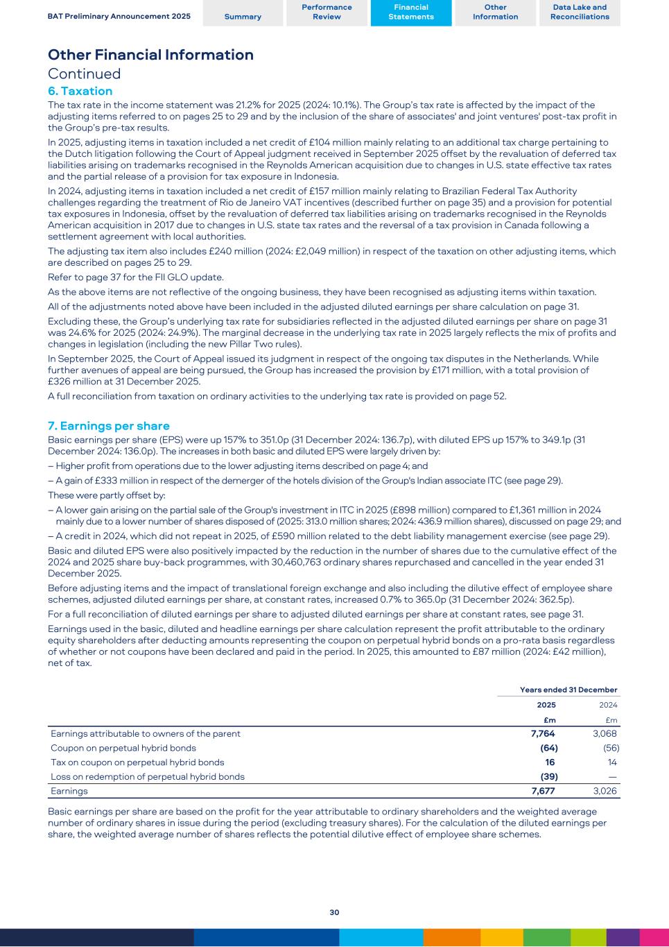 Other Financial Information Continued 6. Taxation The tax rate in the income statement was 21.2% for 2025 (2024: 10.1%). The Group’s tax rate is affected by the impact of the adjusting items referred to on pages 25 to 29 and by the inclusion of the share of associates' and joint ventures' post-tax profit in the Group’s pre-tax results. In 2025, adjusting items in taxation included a net credit of £104 million mainly relating to an additional tax charge pertaining to the Dutch litigation following the Court of Appeal judgment received in September 2025 offset by the revaluation of deferred tax liabilities arising on trademarks recognised in the Reynolds American acquisition due to changes in U.S. state effective tax rates and the partial release of a provision for tax exposure in Indonesia. In 2024, adjusting items in taxation included a net credit of £157 million mainly relating to Brazilian Federal Tax Authority challenges regarding the treatment of Rio de Janeiro VAT incentives (described further on page 35) and a provision for potential tax exposures in Indonesia, offset by the revaluation of deferred tax liabilities arising on trademarks recognised in the Reynolds American acquisition in 2017 due to changes in U.S. state tax rates and the reversal of a tax provision in Canada following a settlement agreement with local authorities. The adjusting tax item also includes £240 million (2024: £2,049 million) in respect of the taxation on other adjusting items, which are described on pages 25 to 29. Refer to page 37 for the FII GLO update. As the above items are not reflective of the ongoing business, they have been recognised as adjusting items within taxation. All of the adjustments noted above have been included in the adjusted diluted earnings per share calculation on page 31. Excluding these, the Group’s underlying tax rate for subsidiaries reflected in the adjusted diluted earnings per share on page 31 was 24.6% for 2025 (2024: 24.9%). The marginal decrease in the underlying tax rate in 2025 largely reflects the mix of profits and changes in legislation (including the new Pillar Two rules). In September 2025, the Court of Appeal issued its judgment in respect of the ongoing tax disputes in the Netherlands. While further avenues of appeal are being pursued, the Group has increased the provision by £171 million, with a total provision of £326 million at 31 December 2025. A full reconciliation from taxation on ordinary activities to the underlying tax rate is provided on page 52. 7. Earnings per share Basic earnings per share (EPS) were up 157% to 351.0p (31 December 2024: 136.7p), with diluted EPS up 157% to 349.1p (31 December 2024: 136.0p). The increases in both basic and diluted EPS were largely driven by: – Higher profit from operations due to the lower adjusting items described on page 4; and – A gain of £333 million in respect of the demerger of the hotels division of the Group's Indian associate ITC (see page 29). These were partly offset by: – A lower gain arising on the partial sale of the Group's investment in ITC in 2025 (£898 million) compared to £1,361 million in 2024 mainly due to a lower number of shares disposed of (2025: 313.0 million shares; 2024: 436.9 million shares), discussed on page 29; and – A credit in 2024, which did not repeat in 2025, of £590 million related to the debt liability management exercise (see page 29). Basic and diluted EPS were also positively impacted by the reduction in the number of shares due to the cumulative effect of the 2024 and 2025 share buy-back programmes, with 30,460,763 ordinary shares repurchased and cancelled in the year ended 31 December 2025. Before adjusting items and the impact of translational foreign exchange and also including the dilutive effect of employee share schemes, adjusted diluted earnings per share, at constant rates, increased 0.7% to 365.0p (31 December 2024: 362.5p). For a full reconciliation of diluted earnings per share to adjusted diluted earnings per share at constant rates, see page 31. Earnings used in the basic, diluted and headline earnings per share calculation represent the profit attributable to the ordinary equity shareholders after deducting amounts representing the coupon on perpetual hybrid bonds on a pro-rata basis regardless of whether or not coupons have been declared and paid in the period. In 2025, this amounted to £87 million (2024: £42 million), net of tax. Years ended 31 December 2025 2024 £m £m Earnings attributable to owners of the parent 7,764 3,068 Coupon on perpetual hybrid bonds (64) (56) Tax on coupon on perpetual hybrid bonds 16 14 Loss on redemption of perpetual hybrid bonds (39) — Earnings 7,677 3,026 Basic earnings per share are based on the profit for the year attributable to ordinary shareholders and the weighted average number of ordinary shares in issue during the period (excluding treasury shares). For the calculation of the diluted earnings per share, the weighted average number of shares reflects the potential dilutive effect of employee share schemes. BAT Preliminary Announcement 2025 Summary Performance Review Financial Statements Other Information Data Lake and Reconciliations 30