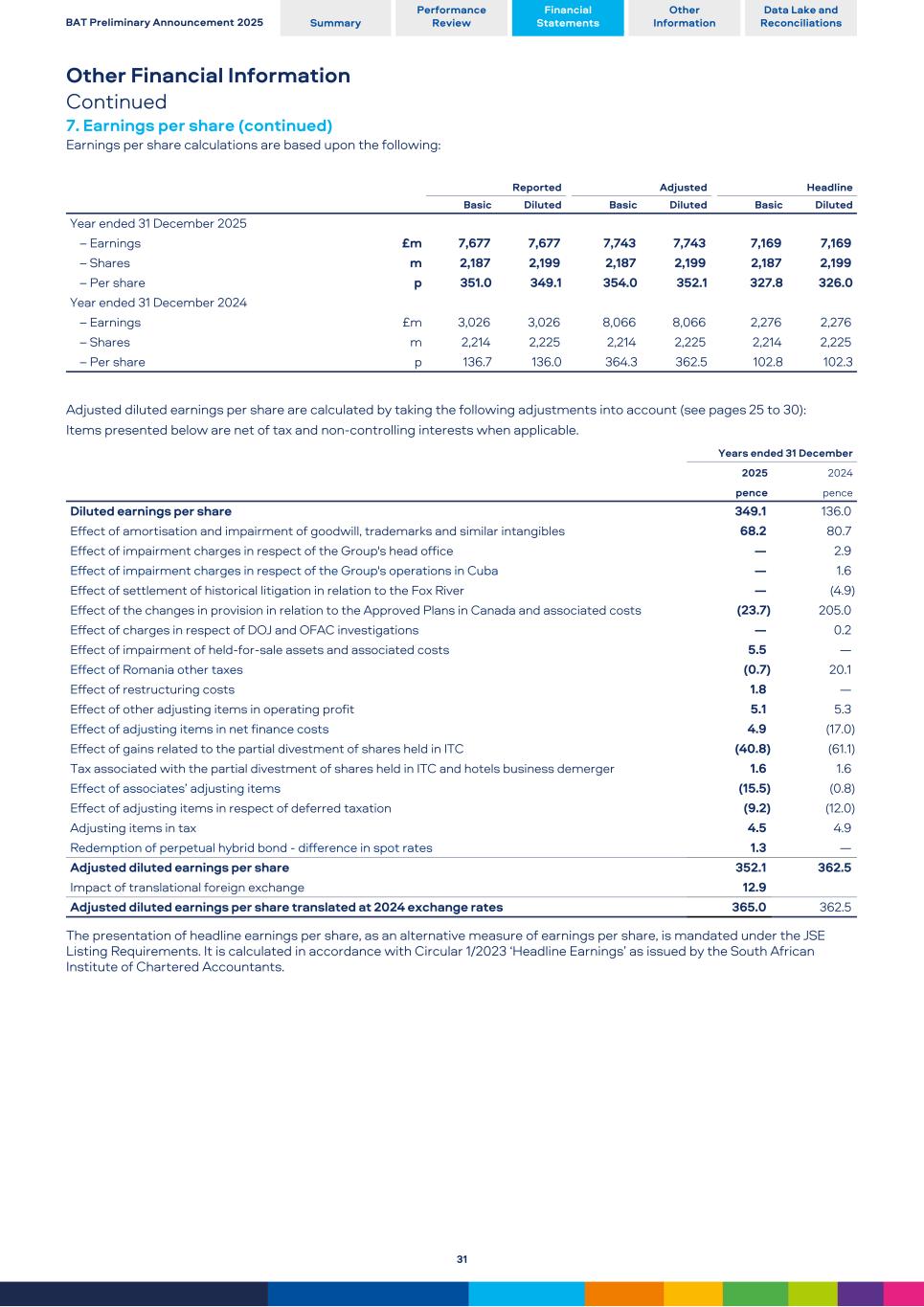 Other Financial Information Continued 7. Earnings per share (continued) Earnings per share calculations are based upon the following: Reported Adjusted Headline Basic Diluted Basic Diluted Basic Diluted Year ended 31 December 2025 – Earnings £m 7,677 7,677 7,743 7,743 7,169 7,169 – Shares m 2,187 2,199 2,187 2,199 2,187 2,199 – Per share p 351.0 349.1 354.0 352.1 327.8 326.0 Year ended 31 December 2024 – Earnings £m 3,026 3,026 8,066 8,066 2,276 2,276 – Shares m 2,214 2,225 2,214 2,225 2,214 2,225 – Per share p 136.7 136.0 364.3 362.5 102.8 102.3 Adjusted diluted earnings per share are calculated by taking the following adjustments into account (see pages 25 to 30): Items presented below are net of tax and non-controlling interests when applicable. Years ended 31 December 2025 2024 pence pence Diluted earnings per share 349.1 136.0 Effect of amortisation and impairment of goodwill, trademarks and similar intangibles 68.2 80.7 Effect of impairment charges in respect of the Group's head office — 2.9 Effect of impairment charges in respect of the Group's operations in Cuba — 1.6 Effect of settlement of historical litigation in relation to the Fox River — (4.9) Effect of the changes in provision in relation to the Approved Plans in Canada and associated costs (23.7) 205.0 Effect of charges in respect of DOJ and OFAC investigations — 0.2 Effect of impairment of held-for-sale assets and associated costs 5.5 — Effect of Romania other taxes (0.7) 20.1 Effect of restructuring costs 1.8 — Effect of other adjusting items in operating profit 5.1 5.3 Effect of adjusting items in net finance costs 4.9 (17.0) Effect of gains related to the partial divestment of shares held in ITC (40.8) (61.1) Tax associated with the partial divestment of shares held in ITC and hotels business demerger 1.6 1.6 Effect of associates’ adjusting items (15.5) (0.8) Effect of adjusting items in respect of deferred taxation (9.2) (12.0) Adjusting items in tax 4.5 4.9 Redemption of perpetual hybrid bond - difference in spot rates 1.3 — Adjusted diluted earnings per share 352.1 362.5 Impact of translational foreign exchange 12.9 Adjusted diluted earnings per share translated at 2024 exchange rates 365.0 362.5 The presentation of headline earnings per share, as an alternative measure of earnings per share, is mandated under the JSE Listing Requirements. It is calculated in accordance with Circular 1/2023 ‘Headline Earnings’ as issued by the South African Institute of Chartered Accountants. BAT Preliminary Announcement 2025 Summary Performance Review Financial Statements Other Information Data Lake and Reconciliations 31
