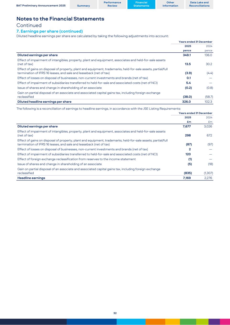 Notes to the Financial Statements Continued 7. Earnings per share (continued) Diluted headline earnings per share are calculated by taking the following adjustments into account: Years ended 31 December 2025 2024 pence pence Diluted earnings per share 349.1 136.0 Effect of impairment of intangibles, property, plant and equipment, associates and held-for-sale assets (net of tax) 13.5 30.2 Effect of gains on disposal of property, plant and equipment, trademarks, held-for-sale assets, partial/full termination of IFRS 16 leases, and sale and leaseback (net of tax) (3.9) (4.4) Effect of losses on disposal of businesses, non-current investments and brands (net of tax) 0.1 — Effect of impairment of subsidiaries transferred to held-for-sale and associated costs (net of NCI) 5.4 — Issue of shares and change in shareholding of an associate (0.2) (0.8) Gain on partial disposal of an associate and associated capital gains tax, including foreign exchange reclassified (38.0) (58.7) Diluted headline earnings per share 326.0 102.3 The following is a reconciliation of earnings to headline earnings, in accordance with the JSE Listing Requirements: Years ended 31 December 2025 2024 £m £m Diluted earnings per share 7,677 3,026 Effect of impairment of intangibles, property, plant and equipment, associates and held-for-sale assets (net of tax) 298 672 Effect of gains on disposal of property, plant and equipment, trademarks, held-for-sale assets, partial/full termination of IFRS 16 leases, and sale and leaseback (net of tax) (87) (97) Effect of losses on disposal of businesses, non-current investments and brands (net of tax) 2 — Effect of impairment of subsidiaries transferred to held-for-sale and associated costs (net of NCI) 120 — Effect of foreign exchange reclassification from reserves to the income statement (1) — Issue of shares and change in shareholding of an associate (5) (18) Gain on partial disposal of an associate and associated capital gains tax, including foreign exchange reclassified (835) (1,307) Headline earnings 7,169 2,276 BAT Preliminary Announcement 2025 Summary Performance Review Financial Statements Other Information Data Lake and Reconciliations 32