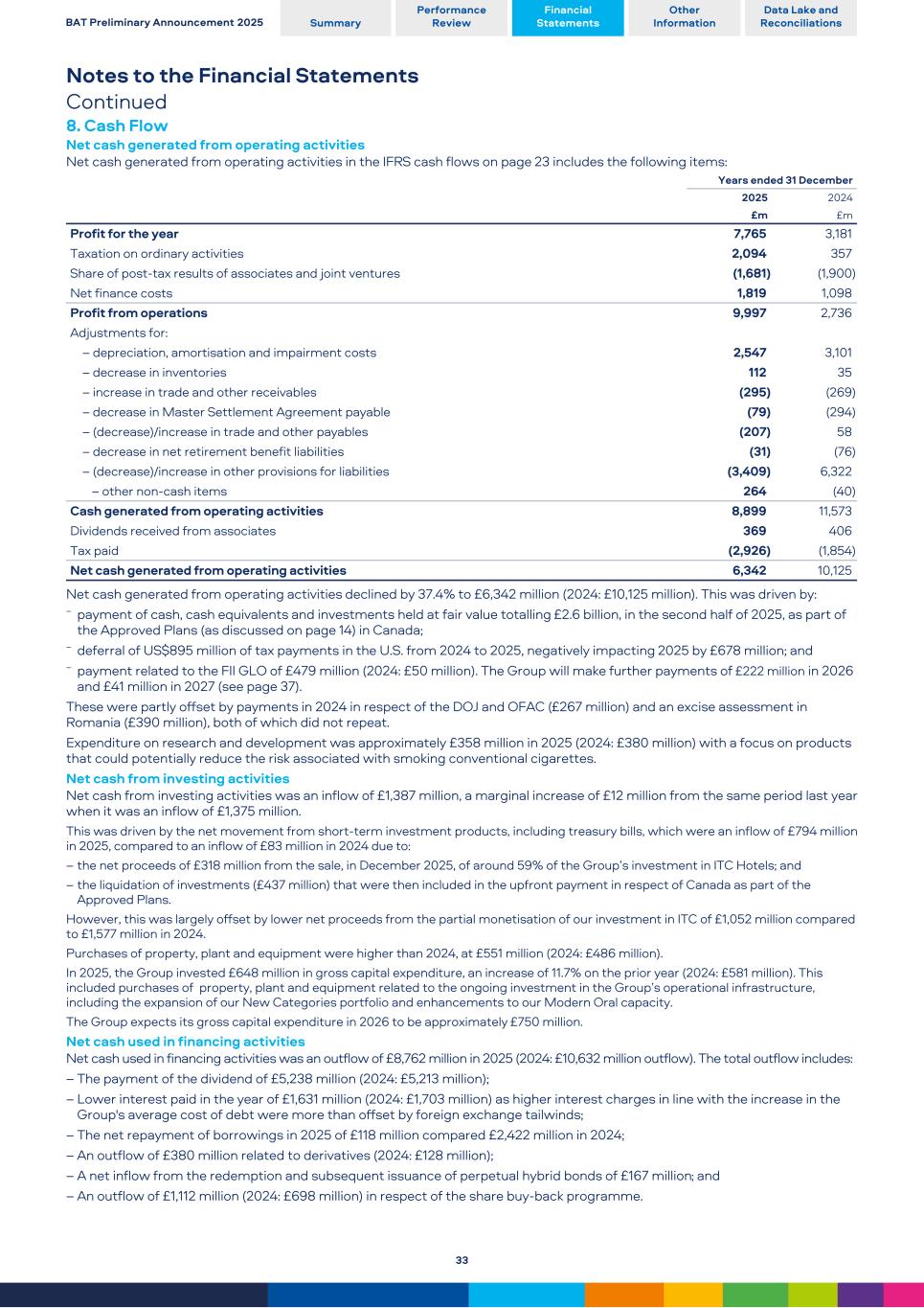 Notes to the Financial Statements Continued 8. Cash Flow Net cash generated from operating activities Net cash generated from operating activities in the IFRS cash flows on page 23 includes the following items: Years ended 31 December 2025 2024 £m £m Profit for the year 7,765 3,181 Taxation on ordinary activities 2,094 357 Share of post-tax results of associates and joint ventures (1,681) (1,900) Net finance costs 1,819 1,098 Profit from operations 9,997 2,736 Adjustments for:  – depreciation, amortisation and impairment costs 2,547 3,101  – decrease in inventories 112 35  – increase in trade and other receivables (295) (269)  – decrease in Master Settlement Agreement payable (79) (294)  – (decrease)/increase in trade and other payables (207) 58  – decrease in net retirement benefit liabilities (31) (76) – (decrease)/increase in other provisions for liabilities (3,409) 6,322  – other non-cash items 264 (40) Cash generated from operating activities 8,899 11,573 Dividends received from associates 369 406 Tax paid (2,926) (1,854) Net cash generated from operating activities 6,342 10,125 Net cash generated from operating activities declined by 37.4% to £6,342 million (2024: £10,125 million). This was driven by: – payment of cash, cash equivalents and investments held at fair value totalling £2.6 billion, in the second half of 2025, as part of the Approved Plans (as discussed on page 14) in Canada; – deferral of US$895 million of tax payments in the U.S. from 2024 to 2025, negatively impacting 2025 by £678 million; and – payment related to the FII GLO of £479 million (2024: £50 million). The Group will make further payments of £222 million in 2026 and £41 million in 2027 (see page 37). These were partly offset by payments in 2024 in respect of the DOJ and OFAC (£267 million) and an excise assessment in Romania (£390 million), both of which did not repeat. Expenditure on research and development was approximately £358 million in 2025 (2024: £380 million) with a focus on products that could potentially reduce the risk associated with smoking conventional cigarettes. Net cash from investing activities Net cash from investing activities was an inflow of £1,387 million, a marginal increase of £12 million from the same period last year when it was an inflow of £1,375 million. This was driven by the net movement from short-term investment products, including treasury bills, which were an inflow of £794 million in 2025, compared to an inflow of £83 million in 2024 due to: – the net proceeds of £318 million from the sale, in December 2025, of around 59% of the Group’s investment in ITC Hotels; and – the liquidation of investments (£437 million) that were then included in the upfront payment in respect of Canada as part of the Approved Plans. However, this was largely offset by lower net proceeds from the partial monetisation of our investment in ITC of £1,052 million compared to £1,577 million in 2024. Purchases of property, plant and equipment were higher than 2024, at £551 million (2024: £486 million). In 2025, the Group invested £648 million in gross capital expenditure, an increase of 11.7% on the prior year (2024: £581 million). This included purchases of property, plant and equipment related to the ongoing investment in the Group’s operational infrastructure, including the expansion of our New Categories portfolio and enhancements to our Modern Oral capacity. The Group expects its gross capital expenditure in 2026 to be approximately £750 million. Net cash used in financing activities Net cash used in financing activities was an outflow of £8,762 million in 2025 (2024: £10,632 million outflow). The total outflow includes: – The payment of the dividend of £5,238 million (2024: £5,213 million); – Lower interest paid in the year of £1,631 million (2024: £1,703 million) as higher interest charges in line with the increase in the Group's average cost of debt were more than offset by foreign exchange tailwinds; – The net repayment of borrowings in 2025 of £118 million compared £2,422 million in 2024; – An outflow of £380 million related to derivatives (2024: £128 million); – A net inflow from the redemption and subsequent issuance of perpetual hybrid bonds of £167 million; and – An outflow of £1,112 million (2024: £698 million) in respect of the share buy-back programme. BAT Preliminary Announcement 2025 Summary Performance Review Financial Statements Other Information Data Lake and Reconciliations 33
