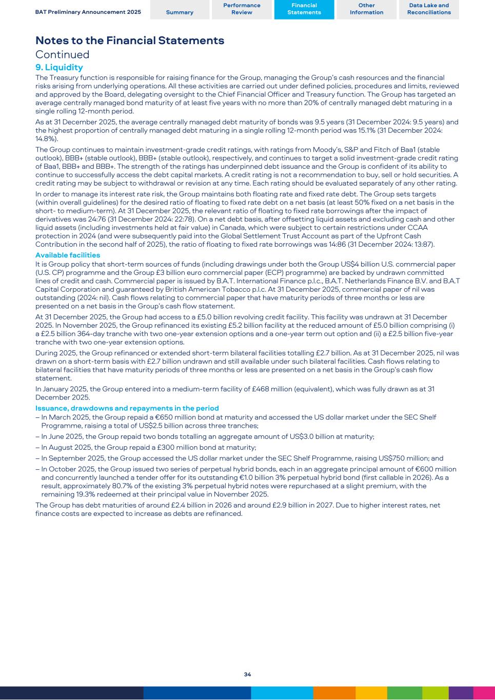 Notes to the Financial Statements Continued 9. Liquidity The Treasury function is responsible for raising finance for the Group, managing the Group’s cash resources and the financial risks arising from underlying operations. All these activities are carried out under defined policies, procedures and limits, reviewed and approved by the Board, delegating oversight to the Chief Financial Officer and Treasury function. The Group has targeted an average centrally managed bond maturity of at least five years with no more than 20% of centrally managed debt maturing in a single rolling 12-month period. As at 31 December 2025, the average centrally managed debt maturity of bonds was 9.5 years (31 December 2024: 9.5 years) and the highest proportion of centrally managed debt maturing in a single rolling 12-month period was 15.1% (31 December 2024: 14.8%). The Group continues to maintain investment-grade credit ratings, with ratings from Moody’s, S&P and Fitch of Baa1 (stable outlook), BBB+ (stable outlook), BBB+ (stable outlook), respectively, and continues to target a solid investment-grade credit rating of Baa1, BBB+ and BBB+. The strength of the ratings has underpinned debt issuance and the Group is confident of its ability to continue to successfully access the debt capital markets. A credit rating is not a recommendation to buy, sell or hold securities. A credit rating may be subject to withdrawal or revision at any time. Each rating should be evaluated separately of any other rating. In order to manage its interest rate risk, the Group maintains both floating rate and fixed rate debt. The Group sets targets (within overall guidelines) for the desired ratio of floating to fixed rate debt on a net basis (at least 50% fixed on a net basis in the short- to medium-term). At 31 December 2025, the relevant ratio of floating to fixed rate borrowings after the impact of derivatives was 24:76 (31 December 2024: 22:78). On a net debt basis, after offsetting liquid assets and excluding cash and other liquid assets (including investments held at fair value) in Canada, which were subject to certain restrictions under CCAA protection in 2024 (and were subsequently paid into the Global Settlement Trust Account as part of the Upfront Cash Contribution in the second half of 2025), the ratio of floating to fixed rate borrowings was 14:86 (31 December 2024: 13:87). Available facilities It is Group policy that short-term sources of funds (including drawings under both the Group US$4 billion U.S. commercial paper (U.S. CP) programme and the Group £3 billion euro commercial paper (ECP) programme) are backed by undrawn committed lines of credit and cash. Commercial paper is issued by B.A.T. International Finance p.l.c., B.A.T. Netherlands Finance B.V. and B.A.T Capital Corporation and guaranteed by British American Tobacco p.l.c. At 31 December 2025, commercial paper of nil was outstanding (2024: nil). Cash flows relating to commercial paper that have maturity periods of three months or less are presented on a net basis in the Group’s cash flow statement. At 31 December 2025, the Group had access to a £5.0 billion revolving credit facility. This facility was undrawn at 31 December 2025. In November 2025, the Group refinanced its existing £5.2 billion facility at the reduced amount of £5.0 billion comprising (i) a £2.5 billion 364-day tranche with two one-year extension options and a one-year term out option and (ii) a £2.5 billion five-year tranche with two one-year extension options. During 2025, the Group refinanced or extended short-term bilateral facilities totalling £2.7 billion. As at 31 December 2025, nil was drawn on a short-term basis with £2.7 billion undrawn and still available under such bilateral facilities. Cash flows relating to bilateral facilities that have maturity periods of three months or less are presented on a net basis in the Group’s cash flow statement. In January 2025, the Group entered into a medium-term facility of £468 million (equivalent), which was fully drawn as at 31 December 2025. Issuance, drawdowns and repayments in the period – In March 2025, the Group repaid a €650 million bond at maturity and accessed the US dollar market under the SEC Shelf Programme, raising a total of US$2.5 billion across three tranches; – In June 2025, the Group repaid two bonds totalling an aggregate amount of US$3.0 billion at maturity; – In August 2025, the Group repaid a £300 million bond at maturity; – In September 2025, the Group accessed the US dollar market under the SEC Shelf Programme, raising US$750 million; and – In October 2025, the Group issued two series of perpetual hybrid bonds, each in an aggregate principal amount of €600 million and concurrently launched a tender offer for its outstanding €1.0 billion 3% perpetual hybrid bond (first callable in 2026). As a result, approximately 80.7% of the existing 3% perpetual hybrid notes were repurchased at a slight premium, with the remaining 19.3% redeemed at their principal value in November 2025. The Group has debt maturities of around £2.4 billion in 2026 and around £2.9 billion in 2027. Due to higher interest rates, net finance costs are expected to increase as debts are refinanced. BAT Preliminary Announcement 2025 Summary Performance Review Financial Statements Other Information Data Lake and Reconciliations 34