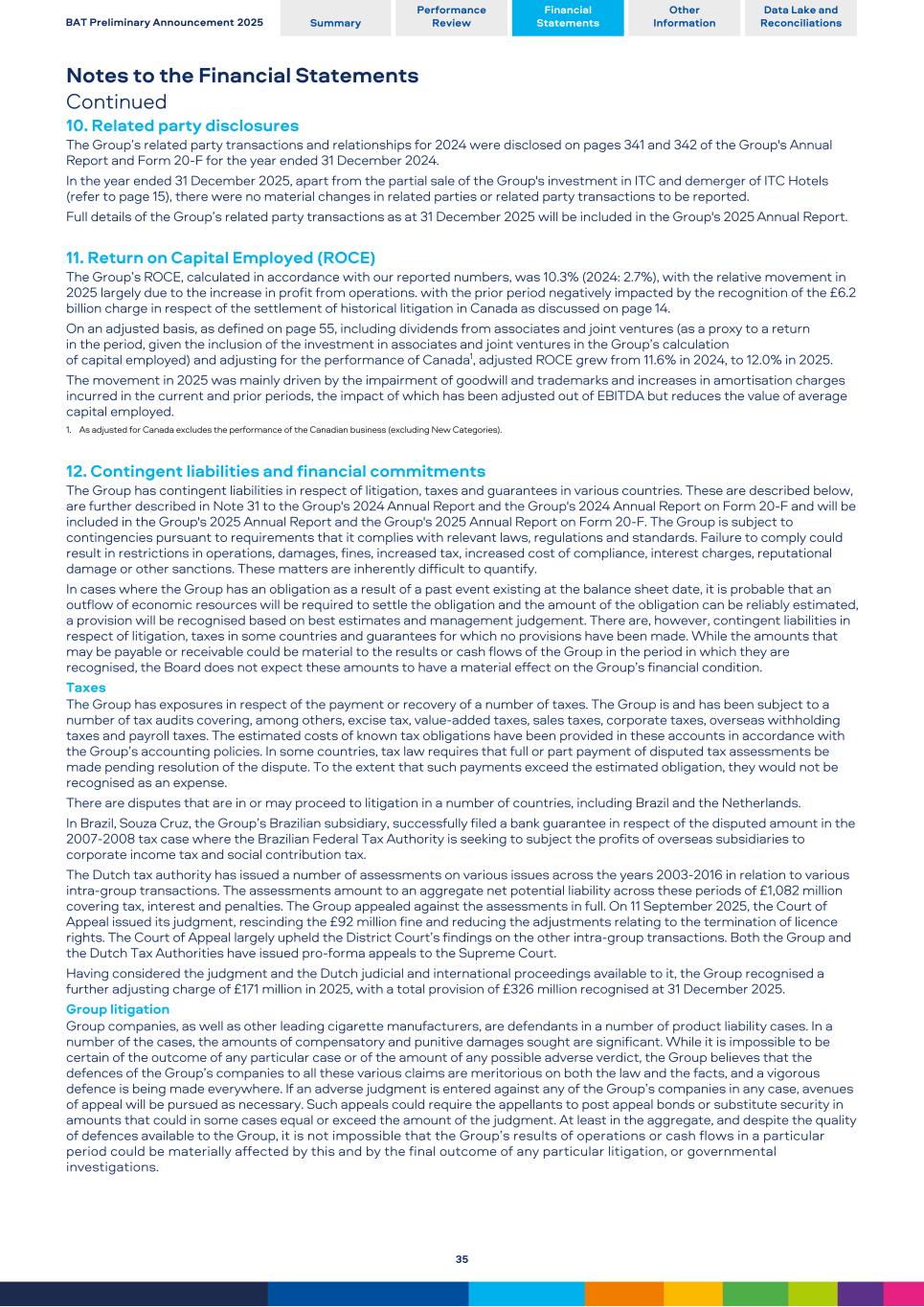 Notes to the Financial Statements Continued 10. Related party disclosures The Group’s related party transactions and relationships for 2024 were disclosed on pages 341 and 342 of the Group's Annual Report and Form 20-F for the year ended 31 December 2024. In the year ended 31 December 2025, apart from the partial sale of the Group's investment in ITC and demerger of ITC Hotels (refer to page 15), there were no material changes in related parties or related party transactions to be reported. Full details of the Group’s related party transactions as at 31 December 2025 will be included in the Group's 2025 Annual Report. 11. Return on Capital Employed (ROCE) The Group’s ROCE, calculated in accordance with our reported numbers, was 10.3% (2024: 2.7%), with the relative movement in 2025 largely due to the increase in profit from operations. with the prior period negatively impacted by the recognition of the £6.2 billion charge in respect of the settlement of historical litigation in Canada as discussed on page 14. On an adjusted basis, as defined on page 55, including dividends from associates and joint ventures (as a proxy to a return in the period, given the inclusion of the investment in associates and joint ventures in the Group’s calculation of capital employed) and adjusting for the performance of Canada1, adjusted ROCE grew from 11.6% in 2024, to 12.0% in 2025. The movement in 2025 was mainly driven by the impairment of goodwill and trademarks and increases in amortisation charges incurred in the current and prior periods, the impact of which has been adjusted out of EBITDA but reduces the value of average capital employed. 1. As adjusted for Canada excludes the performance of the Canadian business (excluding New Categories). 12. Contingent liabilities and financial commitments The Group has contingent liabilities in respect of litigation, taxes and guarantees in various countries. These are described below, are further described in Note 31 to the Group's 2024 Annual Report and the Group's 2024 Annual Report on Form 20-F and will be included in the Group's 2025 Annual Report and the Group's 2025 Annual Report on Form 20-F. The Group is subject to contingencies pursuant to requirements that it complies with relevant laws, regulations and standards. Failure to comply could result in restrictions in operations, damages, fines, increased tax, increased cost of compliance, interest charges, reputational damage or other sanctions. These matters are inherently difficult to quantify. In cases where the Group has an obligation as a result of a past event existing at the balance sheet date, it is probable that an outflow of economic resources will be required to settle the obligation and the amount of the obligation can be reliably estimated, a provision will be recognised based on best estimates and management judgement. There are, however, contingent liabilities in respect of litigation, taxes in some countries and guarantees for which no provisions have been made. While the amounts that may be payable or receivable could be material to the results or cash flows of the Group in the period in which they are recognised, the Board does not expect these amounts to have a material effect on the Group’s financial condition. Taxes The Group has exposures in respect of the payment or recovery of a number of taxes. The Group is and has been subject to a number of tax audits covering, among others, excise tax, value-added taxes, sales taxes, corporate taxes, overseas withholding taxes and payroll taxes. The estimated costs of known tax obligations have been provided in these accounts in accordance with the Group’s accounting policies. In some countries, tax law requires that full or part payment of disputed tax assessments be made pending resolution of the dispute. To the extent that such payments exceed the estimated obligation, they would not be recognised as an expense. There are disputes that are in or may proceed to litigation in a number of countries, including Brazil and the Netherlands. In Brazil, Souza Cruz, the Group’s Brazilian subsidiary, successfully filed a bank guarantee in respect of the disputed amount in the 2007-2008 tax case where the Brazilian Federal Tax Authority is seeking to subject the profits of overseas subsidiaries to corporate income tax and social contribution tax. The Dutch tax authority has issued a number of assessments on various issues across the years 2003-2016 in relation to various intra-group transactions. The assessments amount to an aggregate net potential liability across these periods of £1,082 million covering tax, interest and penalties. The Group appealed against the assessments in full. On 11 September 2025, the Court of Appeal issued its judgment, rescinding the £92 million fine and reducing the adjustments relating to the termination of licence rights. The Court of Appeal largely upheld the District Court’s findings on the other intra-group transactions. Both the Group and the Dutch Tax Authorities have issued pro-forma appeals to the Supreme Court. Having considered the judgment and the Dutch judicial and international proceedings available to it, the Group recognised a further adjusting charge of £171 million in 2025, with a total provision of £326 million recognised at 31 December 2025. Group litigation Group companies, as well as other leading cigarette manufacturers, are defendants in a number of product liability cases. In a number of the cases, the amounts of compensatory and punitive damages sought are significant. While it is impossible to be certain of the outcome of any particular case or of the amount of any possible adverse verdict, the Group believes that the defences of the Group’s companies to all these various claims are meritorious on both the law and the facts, and a vigorous defence is being made everywhere. If an adverse judgment is entered against any of the Group’s companies in any case, avenues of appe