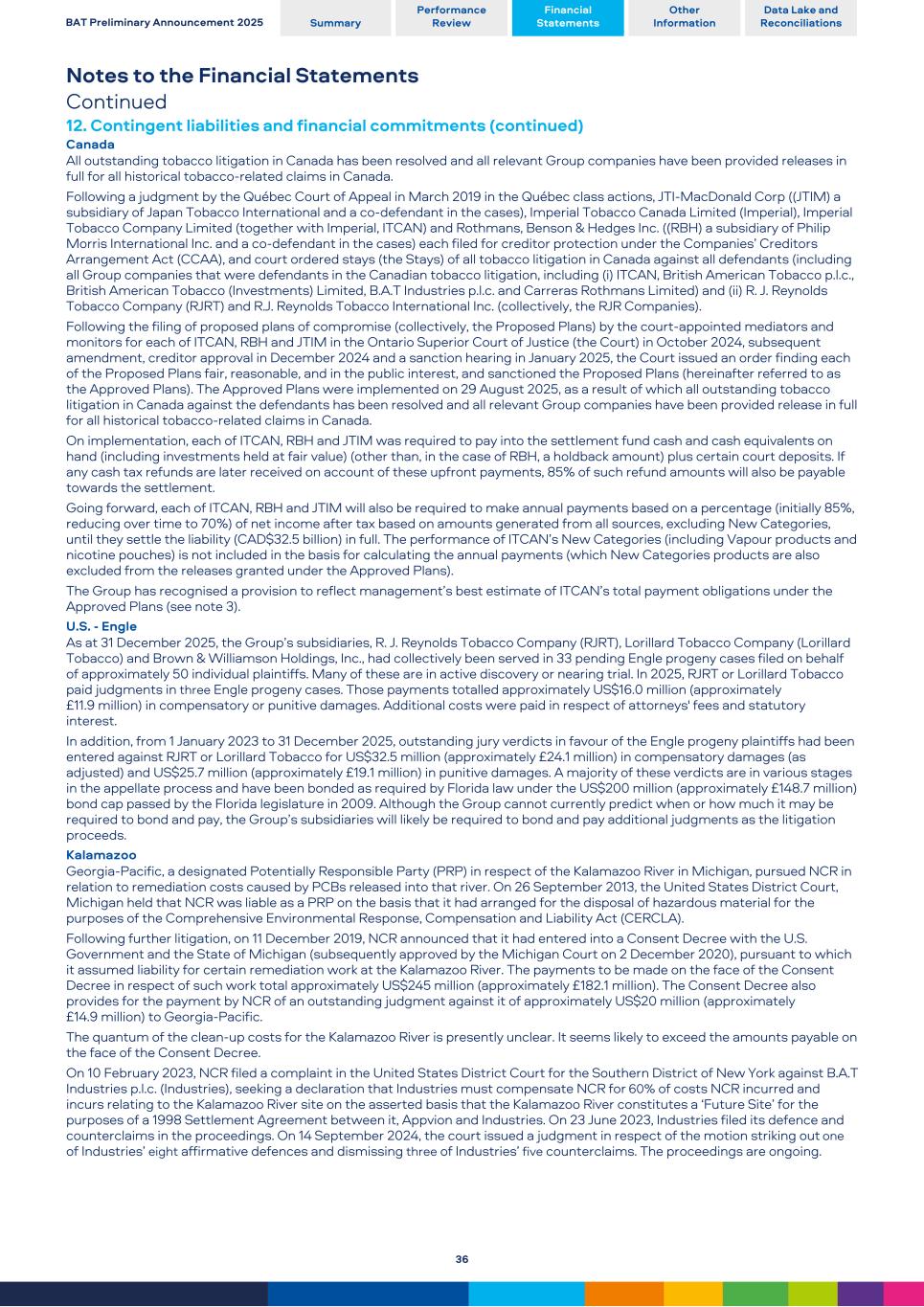 Notes to the Financial Statements Continued 12. Contingent liabilities and financial commitments (continued) Canada All outstanding tobacco litigation in Canada has been resolved and all relevant Group companies have been provided releases in full for all historical tobacco-related claims in Canada. Following a judgment by the Québec Court of Appeal in March 2019 in the Québec class actions, JTI-MacDonald Corp ((JTIM) a subsidiary of Japan Tobacco International and a co-defendant in the cases), Imperial Tobacco Canada Limited (Imperial), Imperial Tobacco Company Limited (together with Imperial, ITCAN) and Rothmans, Benson & Hedges Inc. ((RBH) a subsidiary of Philip Morris International Inc. and a co-defendant in the cases) each filed for creditor protection under the Companies’ Creditors Arrangement Act (CCAA), and court ordered stays (the Stays) of all tobacco litigation in Canada against all defendants (including all Group companies that were defendants in the Canadian tobacco litigation, including (i) ITCAN, British American Tobacco p.l.c., British American Tobacco (Investments) Limited, B.A.T Industries p.l.c. and Carreras Rothmans Limited) and (ii) R. J. Reynolds Tobacco Company (RJRT) and R.J. Reynolds Tobacco International Inc. (collectively, the RJR Companies). Following the filing of proposed plans of compromise (collectively, the Proposed Plans) by the court-appointed mediators and monitors for each of ITCAN, RBH and JTIM in the Ontario Superior Court of Justice (the Court) in October 2024, subsequent amendment, creditor approval in December 2024 and a sanction hearing in January 2025, the Court issued an order finding each of the Proposed Plans fair, reasonable, and in the public interest, and sanctioned the Proposed Plans (hereinafter referred to as the Approved Plans). The Approved Plans were implemented on 29 August 2025, as a result of which all outstanding tobacco litigation in Canada against the defendants has been resolved and all relevant Group companies have been provided release in full for all historical tobacco-related claims in Canada. On implementation, each of ITCAN, RBH and JTIM was required to pay into the settlement fund cash and cash equivalents on hand (including investments held at fair value) (other than, in the case of RBH, a holdback amount) plus certain court deposits. If any cash tax refunds are later received on account of these upfront payments, 85% of such refund amounts will also be payable towards the settlement. Going forward, each of ITCAN, RBH and JTIM will also be required to make annual payments based on a percentage (initially 85%, reducing over time to 70%) of net income after tax based on amounts generated from all sources, excluding New Categories, until they settle the liability (CAD$32.5 billion) in full. The performance of ITCAN’s New Categories (including Vapour products and nicotine pouches) is not included in the basis for calculating the annual payments (which New Categories products are also excluded from the releases granted under the Approved Plans). The Group has recognised a provision to reflect management’s best estimate of ITCAN’s total payment obligations under the Approved Plans (see note 3). U.S. - Engle As at 31 December 2025, the Group’s subsidiaries, R. J. Reynolds Tobacco Company (RJRT), Lorillard Tobacco Company (Lorillard Tobacco) and Brown & Williamson Holdings, Inc., had collectively been served in 33 pending Engle progeny cases filed on behalf of approximately 50 individual plaintiffs. Many of these are in active discovery or nearing trial. In 2025, RJRT or Lorillard Tobacco paid judgments in three Engle progeny cases. Those payments totalled approximately US$16.0 million (approximately £11.9 million) in compensatory or punitive damages. Additional costs were paid in respect of attorneys' fees and statutory interest. In addition, from 1 January 2023 to 31 December 2025, outstanding jury verdicts in favour of the Engle progeny plaintiffs had been entered against RJRT or Lorillard Tobacco for US$32.5 million (approximately £24.1 million) in compensatory damages (as adjusted) and US$25.7 million (approximately £19.1 million) in punitive damages. A majority of these verdicts are in various stages in the appellate process and have been bonded as required by Florida law under the US$200 million (approximately £148.7 million) bond cap passed by the Florida legislature in 2009. Although the Group cannot currently predict when or how much it may be required to bond and pay, the Group’s subsidiaries will likely be required to bond and pay additional judgments as the litigation proceeds. Kalamazoo Georgia-Pacific, a designated Potentially Responsible Party (PRP) in respect of the Kalamazoo River in Michigan, pursued NCR in relation to remediation costs caused by PCBs released into that river. On 26 September 2013, the United States District Court, Michigan held that NCR was liable as a PRP on the basis that it had arranged for the disposal of hazardous material for the purposes of the Comprehensive Environmental Response, Compensation and Liability Act (CERCLA). Following further litigation, on 11 December 2019, NCR announced that it had entered into a Consent Decree with the U.S. Government and the State of Michigan (subsequently approved by the Michigan Court on 2 December 2020), pursuant to which it assumed liability for certain remediation work at the Kalamazoo River. The payments to be made on the face of the Consent Decree in respect of such work total approximately US$245 million (approximately £182.1 million). The Consent Decree also provides for the payment by NCR of an outstanding judgment against it of approximately US$20 million (approximately £14.9 million) to Georgia-Pacific. The quantum of the clean-up costs for the Kalamazoo River is presently unclear. It seems likely to exceed the amounts payable on the face of the Consent Decree. On 10 February 2023, NCR filed a complaint in th