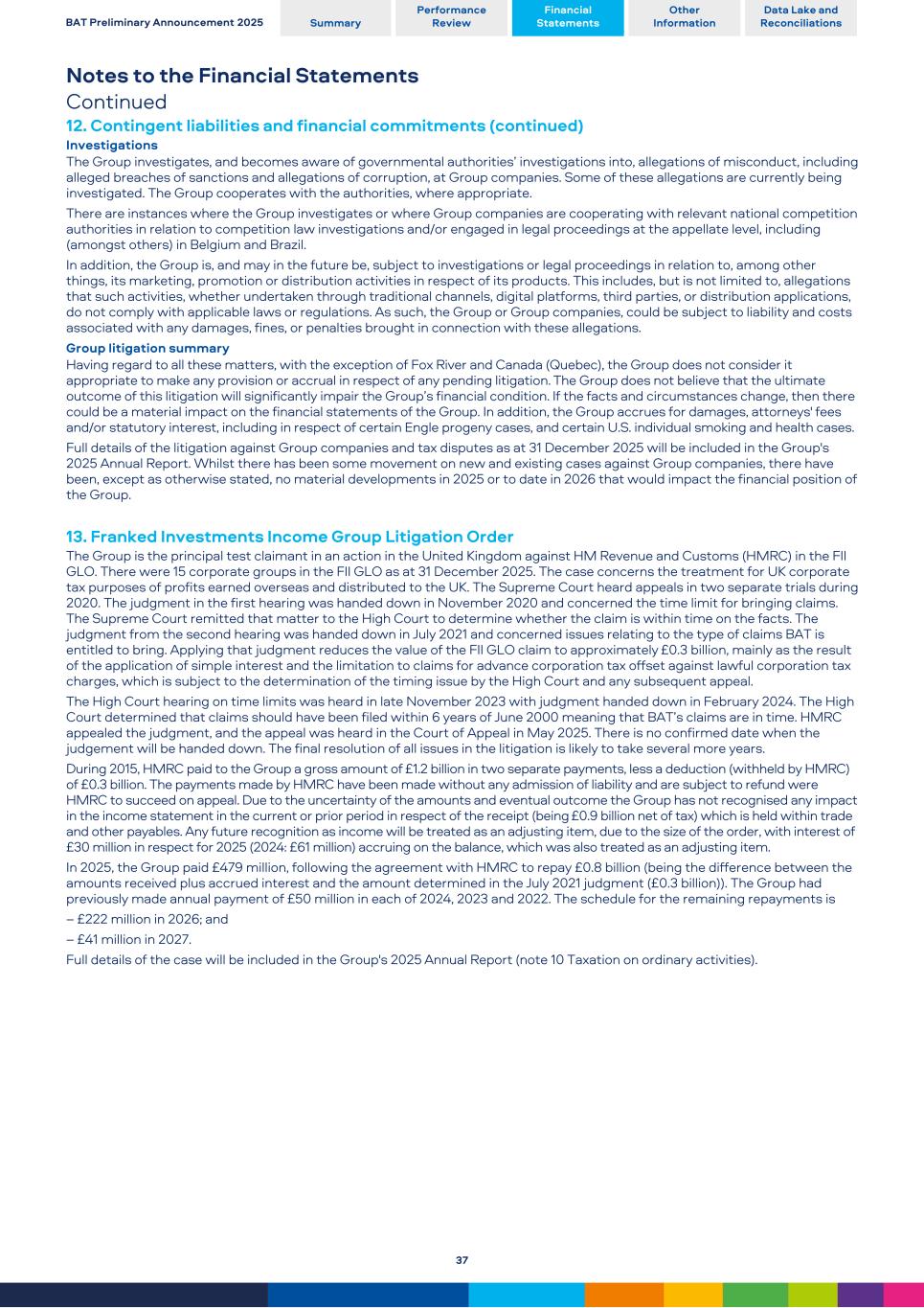 Notes to the Financial Statements Continued 12. Contingent liabilities and financial commitments (continued) Investigations The Group investigates, and becomes aware of governmental authorities’ investigations into, allegations of misconduct, including alleged breaches of sanctions and allegations of corruption, at Group companies. Some of these allegations are currently being investigated. The Group cooperates with the authorities, where appropriate. There are instances where the Group investigates or where Group companies are cooperating with relevant national competition authorities in relation to competition law investigations and/or engaged in legal proceedings at the appellate level, including (amongst others) in Belgium and Brazil. In addition, the Group is, and may in the future be, subject to investigations or legal proceedings in relation to, among other things, its marketing, promotion or distribution activities in respect of its products. This includes, but is not limited to, allegations that such activities, whether undertaken through traditional channels, digital platforms, third parties, or distribution applications, do not comply with applicable laws or regulations. As such, the Group or Group companies, could be subject to liability and costs associated with any damages, fines, or penalties brought in connection with these allegations. Group litigation summary Having regard to all these matters, with the exception of Fox River and Canada (Quebec), the Group does not consider it appropriate to make any provision or accrual in respect of any pending litigation. The Group does not believe that the ultimate outcome of this litigation will significantly impair the Group’s financial condition. If the facts and circumstances change, then there could be a material impact on the financial statements of the Group. In addition, the Group accrues for damages, attorneys' fees and/or statutory interest, including in respect of certain Engle progeny cases, and certain U.S. individual smoking and health cases. Full details of the litigation against Group companies and tax disputes as at 31 December 2025 will be included in the Group's 2025 Annual Report. Whilst there has been some movement on new and existing cases against Group companies, there have been, except as otherwise stated, no material developments in 2025 or to date in 2026 that would impact the financial position of the Group. 13. Franked Investments Income Group Litigation Order The Group is the principal test claimant in an action in the United Kingdom against HM Revenue and Customs (HMRC) in the FII GLO. There were 15 corporate groups in the FII GLO as at 31 December 2025. The case concerns the treatment for UK corporate tax purposes of profits earned overseas and distributed to the UK. The Supreme Court heard appeals in two separate trials during 2020. The judgment in the first hearing was handed down in November 2020 and concerned the time limit for bringing claims. The Supreme Court remitted that matter to the High Court to determine whether the claim is within time on the facts. The judgment from the second hearing was handed down in July 2021 and concerned issues relating to the type of claims BAT is entitled to bring. Applying that judgment reduces the value of the FII GLO claim to approximately £0.3 billion, mainly as the result of the application of simple interest and the limitation to claims for advance corporation tax offset against lawful corporation tax charges, which is subject to the determination of the timing issue by the High Court and any subsequent appeal. The High Court hearing on time limits was heard in late November 2023 with judgment handed down in February 2024. The High Court determined that claims should have been filed within 6 years of June 2000 meaning that BAT’s claims are in time. HMRC appealed the judgment, and the appeal was heard in the Court of Appeal in May 2025. There is no confirmed date when the judgement will be handed down. The final resolution of all issues in the litigation is likely to take several more years. During 2015, HMRC paid to the Group a gross amount of £1.2 billion in two separate payments, less a deduction (withheld by HMRC) of £0.3 billion. The payments made by HMRC have been made without any admission of liability and are subject to refund were HMRC to succeed on appeal. Due to the uncertainty of the amounts and eventual outcome the Group has not recognised any impact in the income statement in the current or prior period in respect of the receipt (being £0.9 billion net of tax) which is held within trade and other payables. Any future recognition as income will be treated as an adjusting item, due to the size of the order, with interest of £30 million in respect for 2025 (2024: £61 million) accruing on the balance, which was also treated as an adjusting item. In 2025, the Group paid £479 million, following the agreement with HMRC to repay £0.8 billion (being the difference between the amounts received plus accrued interest and the amount determined in the July 2021 judgment (£0.3 billion)). The Group had previously made annual payment of £50 million in each of 2024, 2023 and 2022. The schedule for the remaining repayments is – £222 million in 2026; and – £41 million in 2027. Full details of the case will be included in the Group's 2025 Annual Report (note 10 Taxation on ordinary activities). BAT Preliminary Announcement 2025 Summary Performance Review Financial Statements Other Information Data Lake and Reconciliations 37