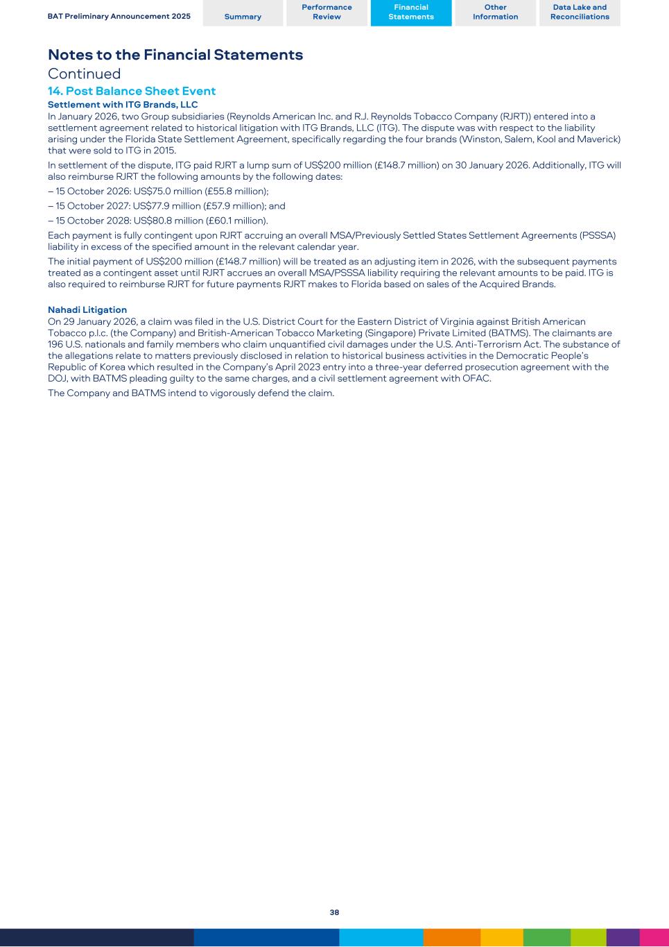Notes to the Financial Statements Continued 14. Post Balance Sheet Event Settlement with ITG Brands, LLC In January 2026, two Group subsidiaries (Reynolds American Inc. and R.J. Reynolds Tobacco Company (RJRT)) entered into a settlement agreement related to historical litigation with ITG Brands, LLC (ITG). The dispute was with respect to the liability arising under the Florida State Settlement Agreement, specifically regarding the four brands (Winston, Salem, Kool and Maverick) that were sold to ITG in 2015. In settlement of the dispute, ITG paid RJRT a lump sum of US$200 million (£148.7 million) on 30 January 2026. Additionally, ITG will also reimburse RJRT the following amounts by the following dates: – 15 October 2026: US$75.0 million (£55.8 million); – 15 October 2027: US$77.9 million (£57.9 million); and – 15 October 2028: US$80.8 million (£60.1 million). Each payment is fully contingent upon RJRT accruing an overall MSA/Previously Settled States Settlement Agreements (PSSSA) liability in excess of the specified amount in the relevant calendar year. The initial payment of US$200 million (£148.7 million) will be treated as an adjusting item in 2026, with the subsequent payments treated as a contingent asset until RJRT accrues an overall MSA/PSSSA liability requiring the relevant amounts to be paid. ITG is also required to reimburse RJRT for future payments RJRT makes to Florida based on sales of the Acquired Brands. Nahadi Litigation On 29 January 2026, a claim was filed in the U.S. District Court for the Eastern District of Virginia against British American Tobacco p.l.c. (the Company) and British-American Tobacco Marketing (Singapore) Private Limited (BATMS). The claimants are 196 U.S. nationals and family members who claim unquantified civil damages under the U.S. Anti-Terrorism Act. The substance of the allegations relate to matters previously disclosed in relation to historical business activities in the Democratic People’s Republic of Korea which resulted in the Company’s April 2023 entry into a three-year deferred prosecution agreement with the DOJ, with BATMS pleading guilty to the same charges, and a civil settlement agreement with OFAC. The Company and BATMS intend to vigorously defend the claim. BAT Preliminary Announcement 2025 Summary Performance Review Financial Statements Other Information Data Lake and Reconciliations 38