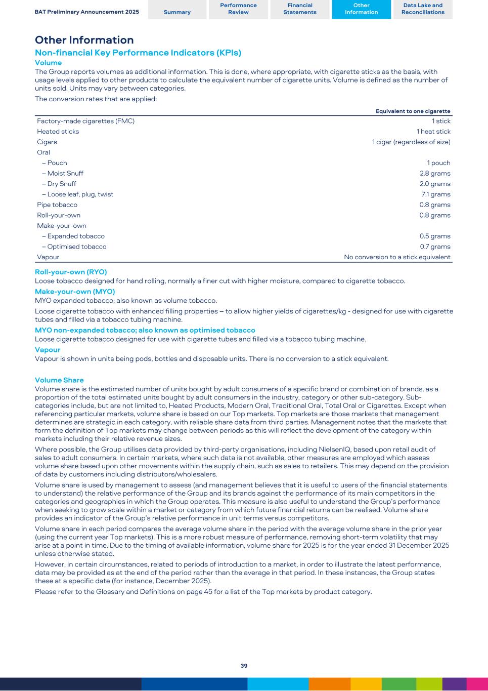 Other Information Non-financial Key Performance Indicators (KPIs) Volume The Group reports volumes as additional information. This is done, where appropriate, with cigarette sticks as the basis, with usage levels applied to other products to calculate the equivalent number of cigarette units. Volume is defined as the number of units sold. Units may vary between categories. The conversion rates that are applied: Equivalent to one cigarette Factory-made cigarettes (FMC) 1 stick Heated sticks 1 heat stick Cigars 1 cigar (regardless of size) Oral – Pouch 1 pouch – Moist Snuff 2.8 grams – Dry Snuff 2.0 grams – Loose leaf, plug, twist 7.1 grams Pipe tobacco 0.8 grams Roll-your-own 0.8 grams Make-your-own – Expanded tobacco 0.5 grams – Optimised tobacco 0.7 grams Vapour No conversion to a stick equivalent Roll-your-own (RYO) Loose tobacco designed for hand rolling, normally a finer cut with higher moisture, compared to cigarette tobacco. Make-your-own (MYO) MYO expanded tobacco; also known as volume tobacco. Loose cigarette tobacco with enhanced filling properties – to allow higher yields of cigarettes/kg - designed for use with cigarette tubes and filled via a tobacco tubing machine. MYO non-expanded tobacco; also known as optimised tobacco Loose cigarette tobacco designed for use with cigarette tubes and filled via a tobacco tubing machine. Vapour Vapour is shown in units being pods, bottles and disposable units. There is no conversion to a stick equivalent. Volume Share Volume share is the estimated number of units bought by adult consumers of a specific brand or combination of brands, as a proportion of the total estimated units bought by adult consumers in the industry, category or other sub-category. Sub- categories include, but are not limited to, Heated Products, Modern Oral, Traditional Oral, Total Oral or Cigarettes. Except when referencing particular markets, volume share is based on our Top markets. Top markets are those markets that management determines are strategic in each category, with reliable share data from third parties. Management notes that the markets that form the definition of Top markets may change between periods as this will reflect the development of the category within markets including their relative revenue sizes. Where possible, the Group utilises data provided by third-party organisations, including NielsenIQ, based upon retail audit of sales to adult consumers. In certain markets, where such data is not available, other measures are employed which assess volume share based upon other movements within the supply chain, such as sales to retailers. This may depend on the provision of data by customers including distributors/wholesalers. Volume share is used by management to assess (and management believes that it is useful to users of the financial statements to understand) the relative performance of the Group and its brands against the performance of its main competitors in the categories and geographies in which the Group operates. This measure is also useful to understand the Group’s performance when seeking to grow scale within a market or category from which future financial returns can be realised. Volume share provides an indicator of the Group’s relative performance in unit terms versus competitors. Volume share in each period compares the average volume share in the period with the average volume share in the prior year (using the current year Top markets). This is a more robust measure of performance, removing short-term volatility that may arise at a point in time. Due to the timing of available information, volume share for 2025 is for the year ended 31 December 2025 unless otherwise stated. However, in certain circumstances, related to periods of introduction to a market, in order to illustrate the latest performance, data may be provided as at the end of the period rather than the average in that period. In these instances, the Group states these at a specific date (for instance, December 2025). Please refer to the Glossary and Definitions on page 45 for a list of the Top markets by product category. BAT Preliminary Announcement 2025 Summary Performance Review Financial Statements Other Information Data Lake and Reconciliations 39