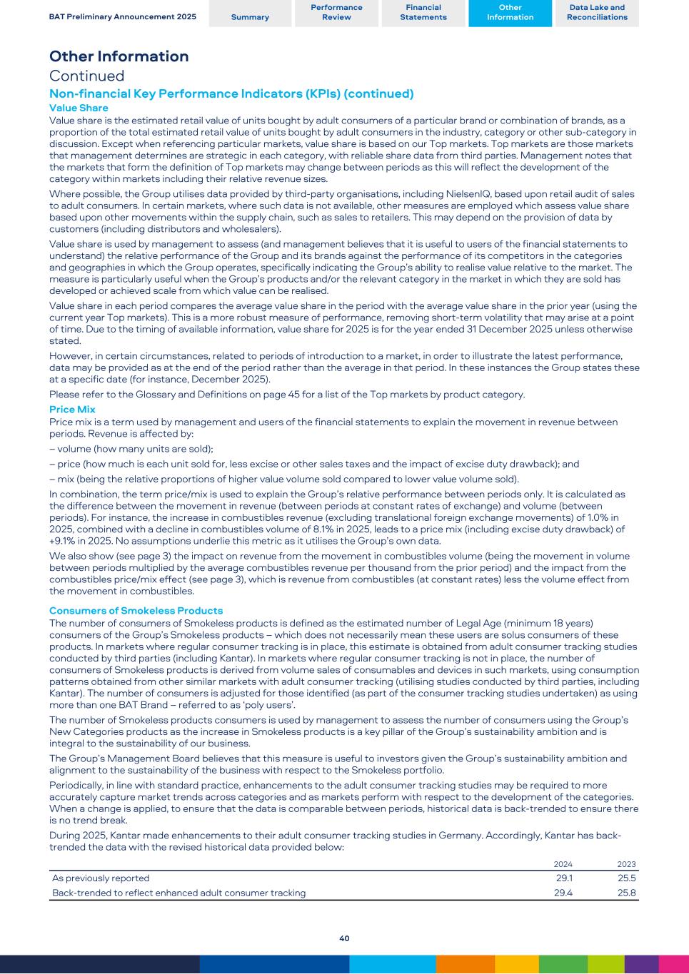 Other Information Continued Non-financial Key Performance Indicators (KPIs) (continued) Value Share Value share is the estimated retail value of units bought by adult consumers of a particular brand or combination of brands, as a proportion of the total estimated retail value of units bought by adult consumers in the industry, category or other sub-category in discussion. Except when referencing particular markets, value share is based on our Top markets. Top markets are those markets that management determines are strategic in each category, with reliable share data from third parties. Management notes that the markets that form the definition of Top markets may change between periods as this will reflect the development of the category within markets including their relative revenue sizes. Where possible, the Group utilises data provided by third-party organisations, including NielsenIQ, based upon retail audit of sales to adult consumers. In certain markets, where such data is not available, other measures are employed which assess value share based upon other movements within the supply chain, such as sales to retailers. This may depend on the provision of data by customers (including distributors and wholesalers). Value share is used by management to assess (and management believes that it is useful to users of the financial statements to understand) the relative performance of the Group and its brands against the performance of its competitors in the categories and geographies in which the Group operates, specifically indicating the Group’s ability to realise value relative to the market. The measure is particularly useful when the Group’s products and/or the relevant category in the market in which they are sold has developed or achieved scale from which value can be realised. Value share in each period compares the average value share in the period with the average value share in the prior year (using the current year Top markets). This is a more robust measure of performance, removing short-term volatility that may arise at a point of time. Due to the timing of available information, value share for 2025 is for the year ended 31 December 2025 unless otherwise stated. However, in certain circumstances, related to periods of introduction to a market, in order to illustrate the latest performance, data may be provided as at the end of the period rather than the average in that period. In these instances the Group states these at a specific date (for instance, December 2025). Please refer to the Glossary and Definitions on page 45 for a list of the Top markets by product category. Price Mix Price mix is a term used by management and users of the financial statements to explain the movement in revenue between periods. Revenue is affected by: – volume (how many units are sold); – price (how much is each unit sold for, less excise or other sales taxes and the impact of excise duty drawback); and – mix (being the relative proportions of higher value volume sold compared to lower value volume sold). In combination, the term price/mix is used to explain the Group’s relative performance between periods only. It is calculated as the difference between the movement in revenue (between periods at constant rates of exchange) and volume (between periods). For instance, the increase in combustibles revenue (excluding translational foreign exchange movements) of 1.0% in 2025, combined with a decline in combustibles volume of 8.1% in 2025, leads to a price mix (including excise duty drawback) of +9.1% in 2025. No assumptions underlie this metric as it utilises the Group’s own data. We also show (see page 3) the impact on revenue from the movement in combustibles volume (being the movement in volume between periods multiplied by the average combustibles revenue per thousand from the prior period) and the impact from the combustibles price/mix effect (see page 3), which is revenue from combustibles (at constant rates) less the volume effect from the movement in combustibles. Consumers of Smokeless Products The number of consumers of Smokeless products is defined as the estimated number of Legal Age (minimum 18 years) consumers of the Group’s Smokeless products – which does not necessarily mean these users are solus consumers of these products. In markets where regular consumer tracking is in place, this estimate is obtained from adult consumer tracking studies conducted by third parties (including Kantar). In markets where regular consumer tracking is not in place, the number of consumers of Smokeless products is derived from volume sales of consumables and devices in such markets, using consumption patterns obtained from other similar markets with adult consumer tracking (utilising studies conducted by third parties, including Kantar). The number of consumers is adjusted for those identified (as part of the consumer tracking studies undertaken) as using more than one BAT Brand – referred to as ‘poly users’. The number of Smokeless products consumers is used by management to assess the number of consumers using the Group’s New Categories products as the increase in Smokeless products is a key pillar of the Group’s sustainability ambition and is integral to the sustainability of our business. The Group’s Management Board believes that this measure is useful to investors given the Group’s sustainability ambition and alignment to the sustainability of the business with respect to the Smokeless portfolio. Periodically, in line with standard practice, enhancements to the adult consumer tracking studies may be required to more accurately capture market trends across categories and as markets perform with respect to the development of the categories. When a change is applied, to ensure that the data is comparable between periods, historical data is back-trended to ensure there is no trend break. During 2025, Kantar made enhancements to their adult consumer tracking studies i