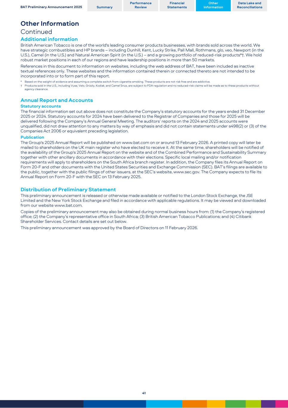 Other Information Continued Additional information British American Tobacco is one of the world's leading consumer products businesses, with brands sold across the world. We have strategic combustibles and HP brands – including Dunhill, Kent, Lucky Strike, Pall Mall, Rothmans, glo, veo, Newport (in the U.S.), Camel (in the U.S.) and Natural American Spirit (in the U.S.) – and a growing portfolio of reduced-risk products*†. We hold robust market positions in each of our regions and have leadership positions in more than 50 markets. References in this document to information on websites, including the web address of BAT, have been included as inactive textual references only. These websites and the information contained therein or connected thereto are not intended to be incorporated into or to form part of this report. * Based on the weight of evidence and assuming a complete switch from cigarette smoking. These products are not risk free and are addictive. † Products sold in the U.S., including Vuse, Velo, Grizzly, Kodiak, and Camel Snus, are subject to FDA regulation and no reduced-risk claims will be made as to these products without agency clearance. Annual Report and Accounts Statutory accounts The financial information set out above does not constitute the Company’s statutory accounts for the years ended 31 December 2025 or 2024. Statutory accounts for 2024 have been delivered to the Registrar of Companies and those for 2025 will be delivered following the Company’s Annual General Meeting. The auditors’ reports on the 2024 and 2025 accounts were unqualified, did not draw attention to any matters by way of emphasis and did not contain statements under s498(2) or (3) of the Companies Act 2006 or equivalent preceding legislation. Publication The Group's 2025 Annual Report will be published on www.bat.com on or around 13 February 2026. A printed copy will later be mailed to shareholders on the UK main register who have elected to receive it. At the same time, shareholders will be notified of the availability of the Group's 2025 Annual Report on the website and of the Combined Performance and Sustainability Summary together with other ancillary documents in accordance with their elections. Specific local mailing and/or notification requirements will apply to shareholders on the South Africa branch register. In addition, the Company files its Annual Report on Form 20-F and other documents with the United States Securities and Exchange Commission (SEC). BAT’s filings are available to the public, together with the public filings of other issuers, at the SEC’s website, www.sec.gov. The Company expects to file its Annual Report on Form 20-F with the SEC on 13 February 2025. Distribution of Preliminary Statement This preliminary announcement is released or otherwise made available or notified to the London Stock Exchange, the JSE Limited and the New York Stock Exchange and filed in accordance with applicable regulations. It may be viewed and downloaded from our website www.bat.com. Copies of the preliminary announcement may also be obtained during normal business hours from: (1) the Company’s registered office; (2) the Company’s representative office in South Africa; (3) British American Tobacco Publications; and (4) Citibank Shareholder Services. Contact details are set out below. This preliminary announcement was approved by the Board of Directors on 11 February 2026. BAT Preliminary Announcement 2025 Summary Performance Review Financial Statements Other Information Data Lake and Reconciliations 41