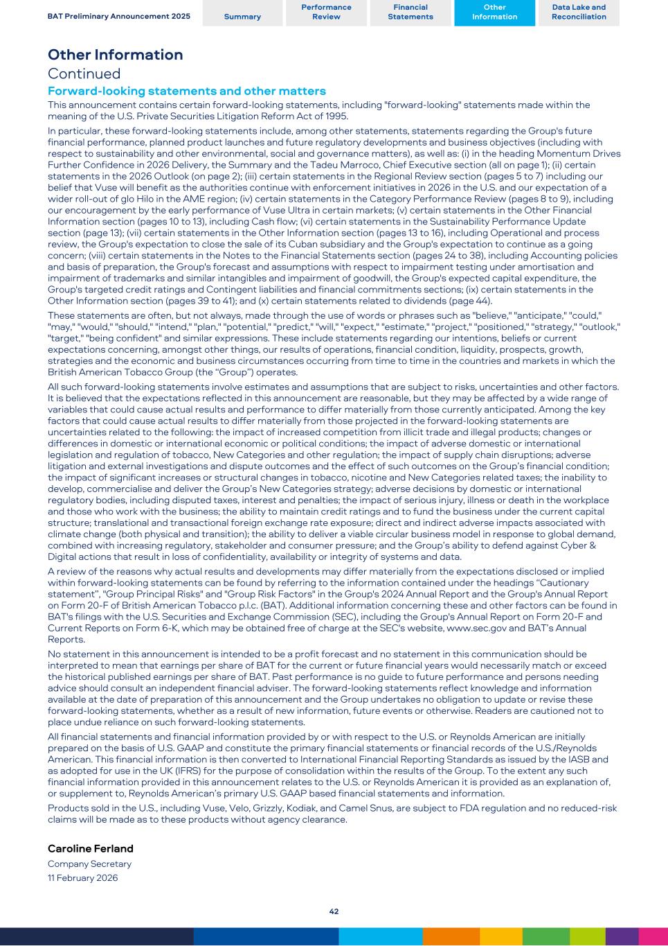 Other Information Continued Forward-looking statements and other matters This announcement contains certain forward-looking statements, including "forward-looking" statements made within the meaning of the U.S. Private Securities Litigation Reform Act of 1995. In particular, these forward-looking statements include, among other statements, statements regarding the Group's future financial performance, planned product launches and future regulatory developments and business objectives (including with respect to sustainability and other environmental, social and governance matters), as well as: (i) in the heading Momentum Drives Further Confidence in 2026 Delivery, the Summary and the Tadeu Marroco, Chief Executive section (all on page 1); (ii) certain statements in the 2026 Outlook (on page 2); (iii) certain statements in the Regional Review section (pages 5 to 7) including our belief that Vuse will benefit as the authorities continue with enforcement initiatives in 2026 in the U.S. and our expectation of a wider roll-out of glo Hilo in the AME region; (iv) certain statements in the Category Performance Review (pages 8 to 9), including our encouragement by the early performance of Vuse Ultra in certain markets; (v) certain statements in the Other Financial Information section (pages 10 to 13), including Cash flow; (vi) certain statements in the Sustainability Performance Update section (page 13); (vii) certain statements in the Other Information section (pages 13 to 16), including Operational and process review, the Group's expectation to close the sale of its Cuban subsidiary and the Group's expectation to continue as a going concern; (viii) certain statements in the Notes to the Financial Statements section (pages 24 to 38), including Accounting policies and basis of preparation, the Group's forecast and assumptions with respect to impairment testing under amortisation and impairment of trademarks and similar intangibles and impairment of goodwill, the Group's expected capital expenditure, the Group's targeted credit ratings and Contingent liabilities and financial commitments sections; (ix) certain statements in the Other Information section (pages 39 to 41); and (x) certain statements related to dividends (page 44). These statements are often, but not always, made through the use of words or phrases such as "believe," "anticipate," "could," "may," "would," "should," "intend," "plan," "potential," "predict," "will," "expect," "estimate," "project," "positioned," "strategy," "outlook," "target," "being confident" and similar expressions. These include statements regarding our intentions, beliefs or current expectations concerning, amongst other things, our results of operations, financial condition, liquidity, prospects, growth, strategies and the economic and business circumstances occurring from time to time in the countries and markets in which the British American Tobacco Group (the “Group”) operates. All such forward-looking statements involve estimates and assumptions that are subject to risks, uncertainties and other factors. It is believed that the expectations reflected in this announcement are reasonable, but they may be affected by a wide range of variables that could cause actual results and performance to differ materially from those currently anticipated. Among the key factors that could cause actual results to differ materially from those projected in the forward-looking statements are uncertainties related to the following: the impact of increased competition from illicit trade and illegal products; changes or differences in domestic or international economic or political conditions; the impact of adverse domestic or international legislation and regulation of tobacco, New Categories and other regulation; the impact of supply chain disruptions; adverse litigation and external investigations and dispute outcomes and the effect of such outcomes on the Group’s financial condition; the impact of significant increases or structural changes in tobacco, nicotine and New Categories related taxes; the inability to develop, commercialise and deliver the Group’s New Categories strategy; adverse decisions by domestic or international regulatory bodies, including disputed taxes, interest and penalties; the impact of serious injury, illness or death in the workplace and those who work with the business; the ability to maintain credit ratings and to fund the business under the current capital structure; translational and transactional foreign exchange rate exposure; direct and indirect adverse impacts associated with climate change (both physical and transition); the ability to deliver a viable circular business model in response to global demand, combined with increasing regulatory, stakeholder and consumer pressure; and the Group’s ability to defend against Cyber & Digital actions that result in loss of confidentiality, availability or integrity of systems and data. A review of the reasons why actual results and developments may differ materially from the expectations disclosed or implied within forward-looking statements can be found by referring to the information contained under the headings “Cautionary statement”, "Group Principal Risks" and "Group Risk Factors" in the Group's 2024 Annual Report and the Group's Annual Report on Form 20-F of British American Tobacco p.l.c. (BAT). Additional information concerning these and other factors can be found in BAT's filings with the U.S. Securities and Exchange Commission (SEC), including the Group's Annual Report on Form 20-F and Current Reports on Form 6-K, which may be obtained free of charge at the SEC's website, www.sec.gov and BAT’s Annual Reports. No statement in this announcement is intended to be a profit forecast and no statement in this communication should be interpreted to mean that earnings per share of BAT for the current or future financial years would necessarily match or exceed the historical published ea
