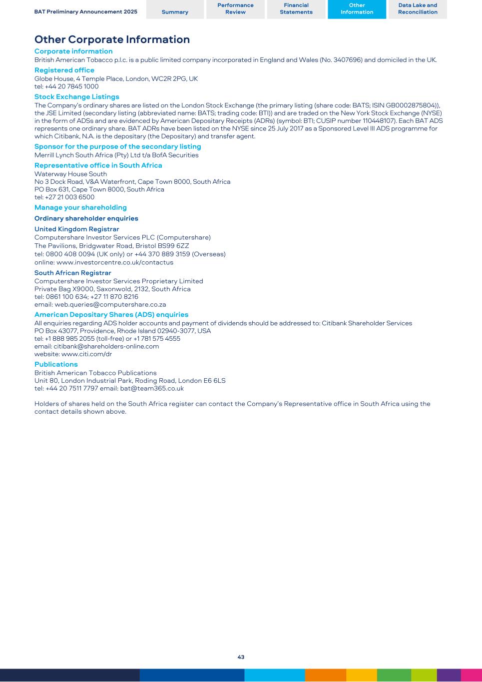 Other Corporate Information Corporate information British American Tobacco p.l.c. is a public limited company incorporated in England and Wales (No. 3407696) and domiciled in the UK. Registered office Globe House, 4 Temple Place, London, WC2R 2PG, UK tel: +44 20 7845 1000 Stock Exchange Listings The Company’s ordinary shares are listed on the London Stock Exchange (the primary listing (share code: BATS; ISIN GB0002875804)), the JSE Limited (secondary listing (abbreviated name: BATS; trading code: BTI)) and are traded on the New York Stock Exchange (NYSE) in the form of ADSs and are evidenced by American Depositary Receipts (ADRs) (symbol: BTI; CUSIP number 110448107). Each BAT ADS represents one ordinary share. BAT ADRs have been listed on the NYSE since 25 July 2017 as a Sponsored Level III ADS programme for which Citibank, N.A. is the depositary (the Depositary) and transfer agent. Sponsor for the purpose of the secondary listing Merrill Lynch South Africa (Pty) Ltd t/a BofA Securities Representative office in South Africa Waterway House South No 3 Dock Road, V&A Waterfront, Cape Town 8000, South Africa PO Box 631, Cape Town 8000, South Africa tel: +27 21 003 6500 Manage your shareholding Ordinary shareholder enquiries United Kingdom Registrar Computershare Investor Services PLC (Computershare) The Pavilions, Bridgwater Road, Bristol BS99 6ZZ tel: 0800 408 0094 (UK only) or +44 370 889 3159 (Overseas) online: www.investorcentre.co.uk/contactus South African Registrar Computershare Investor Services Proprietary Limited Private Bag X9000, Saxonwold, 2132, South Africa tel: 0861 100 634; +27 11 870 8216 email: web.queries@computershare.co.za American Depositary Shares (ADS) enquiries All enquiries regarding ADS holder accounts and payment of dividends should be addressed to: Citibank Shareholder Services PO Box 43077, Providence, Rhode Island 02940-3077, USA tel: +1 888 985 2055 (toll-free) or +1 781 575 4555 email: citibank@shareholders-online.com website: www.citi.com/dr Publications British American Tobacco Publications Unit 80, London Industrial Park, Roding Road, London E6 6LS tel: +44 20 7511 7797 email: bat@team365.co.uk Holders of shares held on the South Africa register can contact the Company’s Representative office in South Africa using the contact details shown above. BAT Preliminary Announcement 2025 Summary Performance Review Financial Statements Other Information Data Lake and Reconciliation 43
