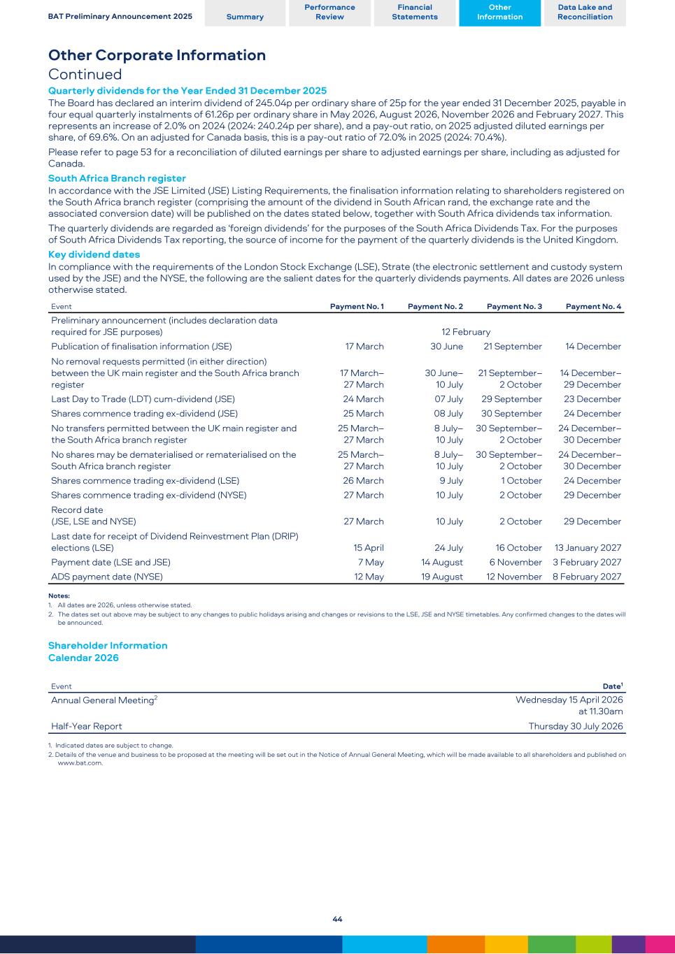Other Corporate Information Continued Quarterly dividends for the Year Ended 31 December 2025 The Board has declared an interim dividend of 245.04p per ordinary share of 25p for the year ended 31 December 2025, payable in four equal quarterly instalments of 61.26p per ordinary share in May 2026, August 2026, November 2026 and February 2027. This represents an increase of 2.0% on 2024 (2024: 240.24p per share), and a pay-out ratio, on 2025 adjusted diluted earnings per share, of 69.6%. On an adjusted for Canada basis, this is a pay-out ratio of 72.0% in 2025 (2024: 70.4%). Please refer to page 53 for a reconciliation of diluted earnings per share to adjusted earnings per share, including as adjusted for Canada. South Africa Branch register In accordance with the JSE Limited (JSE) Listing Requirements, the finalisation information relating to shareholders registered on the South Africa branch register (comprising the amount of the dividend in South African rand, the exchange rate and the associated conversion date) will be published on the dates stated below, together with South Africa dividends tax information. The quarterly dividends are regarded as ‘foreign dividends’ for the purposes of the South Africa Dividends Tax. For the purposes of South Africa Dividends Tax reporting, the source of income for the payment of the quarterly dividends is the United Kingdom. Key dividend dates In compliance with the requirements of the London Stock Exchange (LSE), Strate (the electronic settlement and custody system used by the JSE) and the NYSE, the following are the salient dates for the quarterly dividends payments. All dates are 2026 unless otherwise stated. Event Payment No. 1 Payment No. 2 Payment No. 3 Payment No. 4 Preliminary announcement (includes declaration data required for JSE purposes) 12 February Publication of finalisation information (JSE) 17 March 30 June 21 September 14 December No removal requests permitted (in either direction) between the UK main register and the South Africa branch register 17 March– 27 March 30 June– 10 July 21 September– 2 October 14 December– 29 December Last Day to Trade (LDT) cum-dividend (JSE) 24 March 07 July 29 September 23 December Shares commence trading ex-dividend (JSE) 25 March 08 July 30 September 24 December No transfers permitted between the UK main register and the South Africa branch register 25 March– 27 March 8 July– 10 July 30 September– 2 October 24 December– 30 December No shares may be dematerialised or rematerialised on the South Africa branch register 25 March– 27 March 8 July– 10 July 30 September– 2 October 24 December– 30 December Shares commence trading ex-dividend (LSE) 26 March 9 July 1 October 24 December Shares commence trading ex-dividend (NYSE) 27 March 10 July 2 October 29 December Record date (JSE, LSE and NYSE) 27 March 10 July 2 October 29 December Last date for receipt of Dividend Reinvestment Plan (DRIP) elections (LSE) 15 April 24 July 16 October 13 January 2027 Payment date (LSE and JSE) 7 May 14 August 6 November 3 February 2027 ADS payment date (NYSE) 12 May 19 August 12 November 8 February 2027 Notes: 1. All dates are 2026, unless otherwise stated. 2. The dates set out above may be subject to any changes to public holidays arising and changes or revisions to the LSE, JSE and NYSE timetables. Any confirmed changes to the dates will be announced. Shareholder Information Calendar 2026 Event Date1 Annual General Meeting2 Wednesday 15 April 2026 at 11.30am Half-Year Report Thursday 30 July 2026 1. Indicated dates are subject to change. 2. Details of the venue and business to be proposed at the meeting will be set out in the Notice of Annual General Meeting, which will be made available to all shareholders and published on www.bat.com. BAT Preliminary Announcement 2025 Summary Performance Review Financial Statements Other Information Data Lake and Reconciliation 44