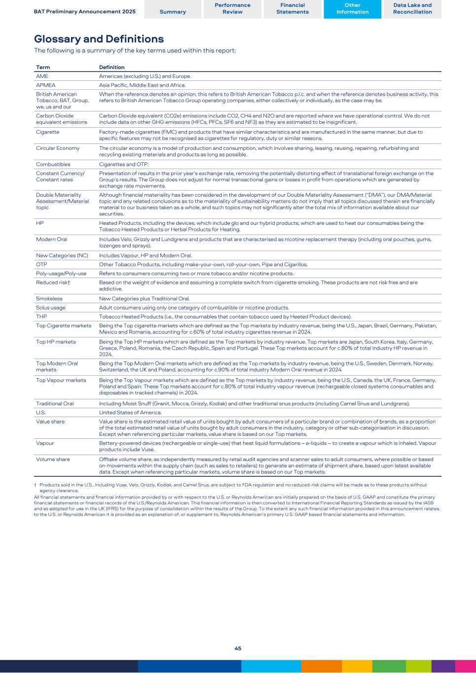 Glossary and Definitions The following is a summary of the key terms used within this report: Term Definition AME Americas (excluding U.S.) and Europe. APMEA Asia Pacific, Middle East and Africa. British American Tobacco, BAT, Group, we, us and our When the reference denotes an opinion, this refers to British American Tobacco p.l.c. and when the reference denotes business activity, this refers to British American Tobacco Group operating companies, either collectively or individually, as the case may be. Carbon Dioxide equivalent emissions Carbon Dioxide equivalent (CO2e) emissions include CO2, CH4 and N2O and are reported where we have operational control. We do not include data on other GHG emissions (HFCs, PFCs, SF6 and NF3) as they are estimated to be insignificant. Cigarette Factory-made cigarettes (FMC) and products that have similar characteristics and are manufactured in the same manner, but due to specific features may not be recognised as cigarettes for regulatory, duty or similar reasons. Circular Economy The circular economy is a model of production and consumption, which involves sharing, leasing, reusing, repairing, refurbishing and recycling existing materials and products as long as possible. Combustibles Cigarettes and OTP. Constant Currency/ Constant rates Presentation of results in the prior year’s exchange rate, removing the potentially distorting effect of translational foreign exchange on the Group’s results. The Group does not adjust for normal transactional gains or losses in profit from operations which are generated by exchange rate movements. Double Materiality Assessment/Material topic Although financial materiality has been considered in the development of our Double Materiality Assessment (“DMA”), our DMA/Material topic and any related conclusions as to the materiality of sustainability matters do not imply that all topics discussed therein are financially material to our business taken as a whole, and such topics may not significantly alter the total mix of information available about our securities. HP Heated Products, including the devices, which include glo and our hybrid products, which are used to heat our consumables being the Tobacco Heated Products or Herbal Products for Heating. Modern Oral Includes Velo, Grizzly and Lundgrens and products that are characterised as nicotine replacement therapy (including oral pouches, gums, lozenges and sprays). New Categories (NC) Includes Vapour, HP and Modern Oral. OTP Other Tobacco Products, including make-your-own, roll-your-own, Pipe and Cigarillos. Poly-usage/Poly-use Refers to consumers consuming two or more tobacco and/or nicotine products. Reduced risk† Based on the weight of evidence and assuming a complete switch from cigarette smoking. These products are not risk free and are addictive. Smokeless New Categories plus Traditional Oral. Solus usage Adult consumers using only one category of combustible or nicotine products. THP Tobacco Heated Products (i.e., the consumables that contain tobacco used by Heated Product devices). Top Cigarette markets Being the Top cigarette markets which are defined as the Top markets by industry revenue, being the U.S., Japan, Brazil, Germany, Pakistan, Mexico and Romania, accounting for c.60% of total industry cigarettes revenue in 2024. Top HP markets Being the Top HP markets which are defined as the Top markets by industry revenue. Top markets are Japan, South Korea, Italy, Germany, Greece, Poland, Romania, the Czech Republic, Spain and Portugal. These Top markets account for c.80% of total industry HP revenue in 2024. Top Modern Oral markets Being the Top Modern Oral markets which are defined as the Top markets by industry revenue, being the U.S., Sweden, Denmark, Norway, Switzerland, the UK and Poland, accounting for c.90% of total industry Modern Oral revenue in 2024. Top Vapour markets Being the Top Vapour markets which are defined as the Top markets by industry revenue, being the U.S., Canada, the UK, France, Germany, Poland and Spain. These Top markets account for c.80% of total industry vapour revenue (rechargeable closed systems consumables and disposables in tracked channels) in 2024. Traditional Oral Including Moist Snuff (Granit, Mocca, Grizzly, Kodiak) and other traditional snus products (including Camel Snus and Lundgrens). U.S. United States of America. Value share Value share is the estimated retail value of units bought by adult consumers of a particular brand or combination of brands, as a proportion of the total estimated retail value of units bought by adult consumers in the industry, category or other sub-categorisation in discussion. Except when referencing particular markets, value share is based on our Top markets. Vapour Battery-powered devices (rechargeable or single-use) that heat liquid formulations – e-liquids – to create a vapour which is inhaled. Vapour products include Vuse. Volume share Offtake volume share, as independently measured by retail audit agencies and scanner sales to adult consumers, where possible or based on movements within the supply chain (such as sales to retailers) to generate an estimate of shipment share, based upon latest available data. Except when referencing particular markets, volume share is based on our Top markets. † Products sold in the U.S., including Vuse, Velo, Grizzly, Kodiak, and Camel Snus, are subject to FDA regulation and no reduced-risk claims will be made as to these products without agency clearance. All financial statements and financial information provided by or with respect to the U.S. or Reynolds American are initially prepared on the basis of U.S. GAAP and constitute the primary financial statements or financial records of the U.S./Reynolds American. This financial information is then converted to International Financial Reporting Standards as issued by the IASB and as adopted for use in the UK (IFRS) for the purpose of consolidation within the results of the Group. To the exte