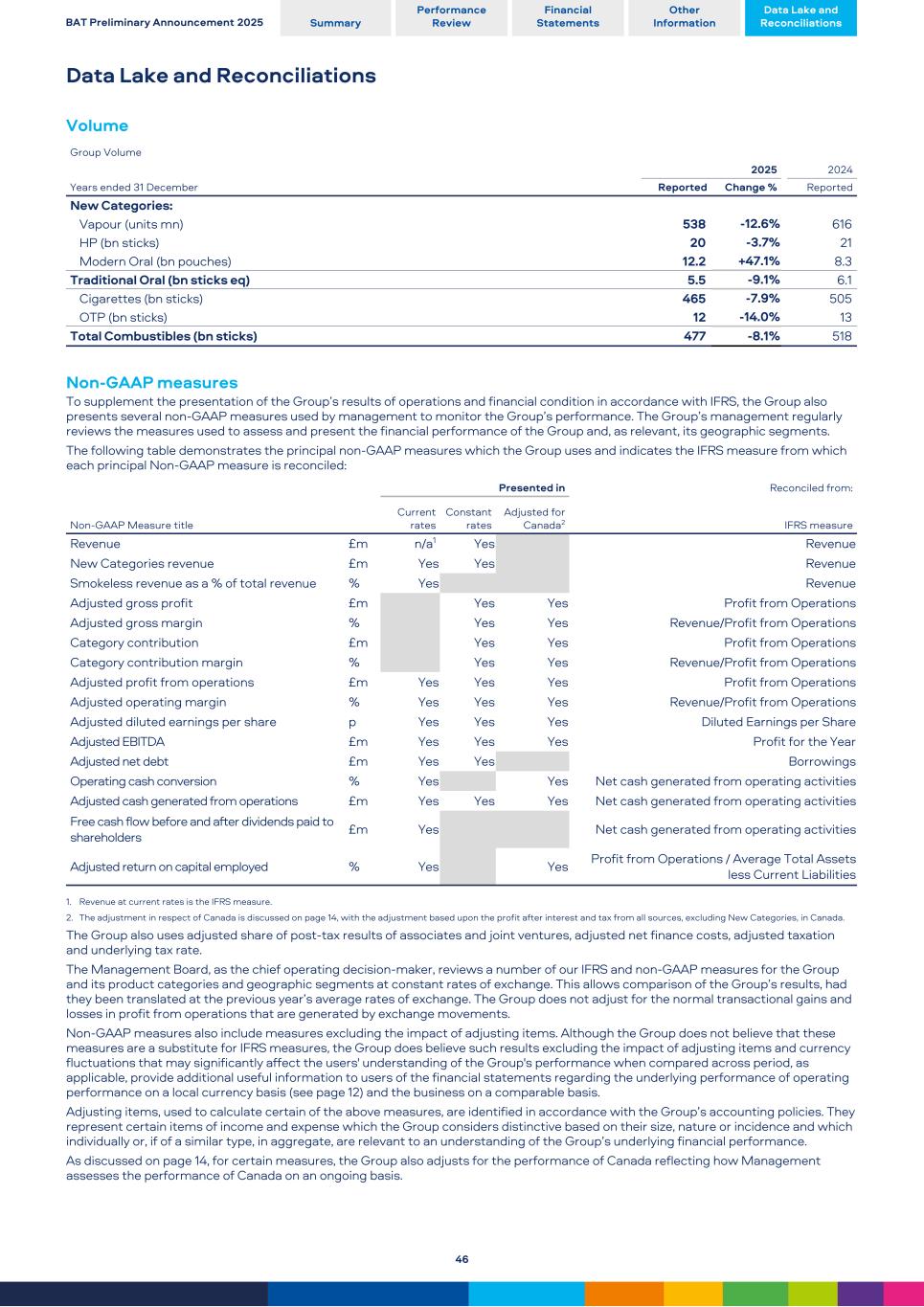 Data Lake and Reconciliations Volume Group Volume Years ended 31 December 2025 2024 Reported Change % Reported New Categories: Vapour (units mn) 538 -12.6 % 616 HP (bn sticks) 20 -3.7 % 21 Modern Oral (bn pouches) 12.2 +47.1 % 8.3 Traditional Oral (bn sticks eq) 5.5 -9.1 % 6.1 Cigarettes (bn sticks) 465 -7.9 % 505 OTP (bn sticks) 12 -14.0 % 13 Total Combustibles (bn sticks) 477 -8.1 % 518 Non-GAAP measures To supplement the presentation of the Group’s results of operations and financial condition in accordance with IFRS, the Group also presents several non-GAAP measures used by management to monitor the Group’s performance. The Group’s management regularly reviews the measures used to assess and present the financial performance of the Group and, as relevant, its geographic segments. The following table demonstrates the principal non-GAAP measures which the Group uses and indicates the IFRS measure from which each principal Non-GAAP measure is reconciled: Non-GAAP Measure title Presented in Reconciled from: Current rates Constant rates Adjusted for Canada2 IFRS measure Revenue £m n/a1 Yes Revenue New Categories revenue £m Yes Yes Revenue Smokeless revenue as a % of total revenue % Yes Revenue Adjusted gross profit £m Yes Yes Profit from Operations Adjusted gross margin % Yes Yes Revenue/Profit from Operations Category contribution £m Yes Yes Profit from Operations Category contribution margin % Yes Yes Revenue/Profit from Operations Adjusted profit from operations £m Yes Yes Yes Profit from Operations Adjusted operating margin % Yes Yes Yes Revenue/Profit from Operations Adjusted diluted earnings per share p Yes Yes Yes Diluted Earnings per Share Adjusted EBITDA £m Yes Yes Yes Profit for the Year Adjusted net debt £m Yes Yes Borrowings Operating cash conversion % Yes Yes Net cash generated from operating activities Adjusted cash generated from operations £m Yes Yes Yes Net cash generated from operating activities Free cash flow before and after dividends paid to shareholders £m Yes Net cash generated from operating activities Adjusted return on capital employed % Yes Yes Profit from Operations / Average Total Assets less Current Liabilities 1. Revenue at current rates is the IFRS measure. 2. The adjustment in respect of Canada is discussed on page 14, with the adjustment based upon the profit after interest and tax from all sources, excluding New Categories, in Canada. The Group also uses adjusted share of post-tax results of associates and joint ventures, adjusted net finance costs, adjusted taxation and underlying tax rate. The Management Board, as the chief operating decision-maker, reviews a number of our IFRS and non-GAAP measures for the Group and its product categories and geographic segments at constant rates of exchange. This allows comparison of the Group’s results, had they been translated at the previous year’s average rates of exchange. The Group does not adjust for the normal transactional gains and losses in profit from operations that are generated by exchange movements. Non-GAAP measures also include measures excluding the impact of adjusting items. Although the Group does not believe that these measures are a substitute for IFRS measures, the Group does believe such results excluding the impact of adjusting items and currency fluctuations that may significantly affect the users' understanding of the Group's performance when compared across period, as applicable, provide additional useful information to users of the financial statements regarding the underlying performance of operating performance on a local currency basis (see page 12) and the business on a comparable basis. Adjusting items, used to calculate certain of the above measures, are identified in accordance with the Group’s accounting policies. They represent certain items of income and expense which the Group considers distinctive based on their size, nature or incidence and which individually or, if of a similar type, in aggregate, are relevant to an understanding of the Group’s underlying financial performance. As discussed on page 14, for certain measures, the Group also adjusts for the performance of Canada reflecting how Management assesses the performance of Canada on an ongoing basis. BAT Preliminary Announcement 2025 Summary Performance Review Financial Statements Other Information Data Lake and Reconciliations 46