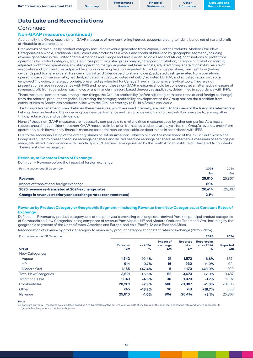 Data Lake and Reconciliations Continued Non-GAAP measures (continued) Additionally, the Group uses the non-GAAP measures of non-controlling interest, coupons relating to hybrid bonds net of tax and profit attributable to shareholders. Breakdowns of revenues by product category (including revenue generated from Vapour, Heated Products, Modern Oral, New Categories as a whole, Traditional Oral, Smokeless products as a whole and combustibles) and by geographic segment (including revenue generated in the United States, Americas and Europe and Asia-Pacific, Middle East and Africa), contributions to profit from operations by product category, adjusted gross profit, adjusted gross margin, category contribution, category contribution margin, adjusted profit from operations, adjusted operating margin, adjusted net finance costs, adjusted group share of post-tax results of associates and joint ventures, adjusted taxation, underlying taxation, adjusted diluted earnings per share, free cash flow (before dividends paid to shareholders), free cash flow (after dividends paid to shareholders), adjusted cash generated from operations, operating cash conversion ratio, net debt, adjusted net debt, adjusted net debt / adjusted EBITDA, and adjusted return on capital employed (including, where appropriate, presented as adjusted for Canada) have limitations as analytical tools. They are not presentations made in accordance with IFRS and none of these non-GAAP measures should be considered as an alternative measure of revenue, profit from operations, cash flows or any financial measure based thereon, as applicable, determined in accordance with IFRS. These measures demonstrate, among other things, the Group's profitability (before adjusting items and translational foreign exchange) from the principal product categories, illustrating the category profitability development as the Group realises the transition from combustibles to Smokeless products in line with the Group's strategy to Build a Smokeless World. The Group’s Management Board believes these measures, which are used internally, are useful to the users of the financial statements in helping them understand the underlying business performance and can provide insights into the cash flow available to, among other things, reduce debt and pay dividends. None of these non-GAAP measures are necessarily comparable to similarly titled measures used by other companies. As a result, readers should not consider these non-GAAP measures in isolation from, or as a substitute analysis for, the Group’s revenue, profit from operations, cash flows or any financial measure based thereon, as applicable, as determined in accordance with IFRS. Due to the secondary listing of the ordinary shares of British American Tobacco p.l.c. on the main board of the JSE in South Africa, the Group is required to present headline earnings per share and diluted headline earnings per share, as alternative measures of earnings per share, calculated in accordance with Circular 1/2023 ‘Headline Earnings’ issued by the South African Institute of Chartered Accountants. These are shown on page 32. Revenue, at Constant Rates of Exchange Definition – Revenue before the impact of foreign exchange. For the year ended 31 December 2025 2024 £m £m Revenue 25,610 25,867 Impact of translational foreign exchange 804 2025 revenue re-translated at 2024 exchange rates 26,414 25,867 Change in revenue at prior year’s exchange rates (constant rates) 2.1% Revenue by Product Category or Geographic Segment – Including Revenue from New Categories, at Constant Rates of Exchange Definition – Revenue by product category, and at the prior year’s prevailing exchange rate, derived from the principal product categories of Combustibles, New Categories (being comprised of revenue from Vapour, HP and Modern Oral), and Traditional Oral, including by the geographic segments of the United States, Americas and Europe, and Asia-Pacific, Middle East and Africa. Reconciliation of revenue by product category to revenue by product category at constant rates of exchange (2025 - 2024) For the year ended 31 December 2025 2024 Group Reported £m vs 2024 % Impact of exchange £m Reported at cc £m Reported at cc vs 2024 % Reported £m New Categories: Vapour 1,542 -10.4% 31 1,573 -8.6% 1,721 HP 914 -0.7% 16 930 +1.0% 921 Modern Oral 1,165 +47.4% 5 1,170 +48.0% 790 Total New Categories 3,621 +5.5% 52 3,673 +7.0% 3,432 Traditional Oral 1,043 -4.5% 30 1,073 -1.7% 1,092 Combustibles 20,201 -2.3% 686 20,887 +1.0% 20,685 Other 745 +13.2% 36 781 +18.7% 658 Revenue 25,610 -1.0% 804 26,414 +2.1% 25,867 Note: cc: constant currency – measures are calculated based on a re-translation of the current year’s results of the Group at the prior year’s exchange rates and, where applicable, its geographical segments or product categories. BAT Preliminary Announcement 2025 Summary Performance Review Financial Statements Other Information Data Lake and Reconciliations 47