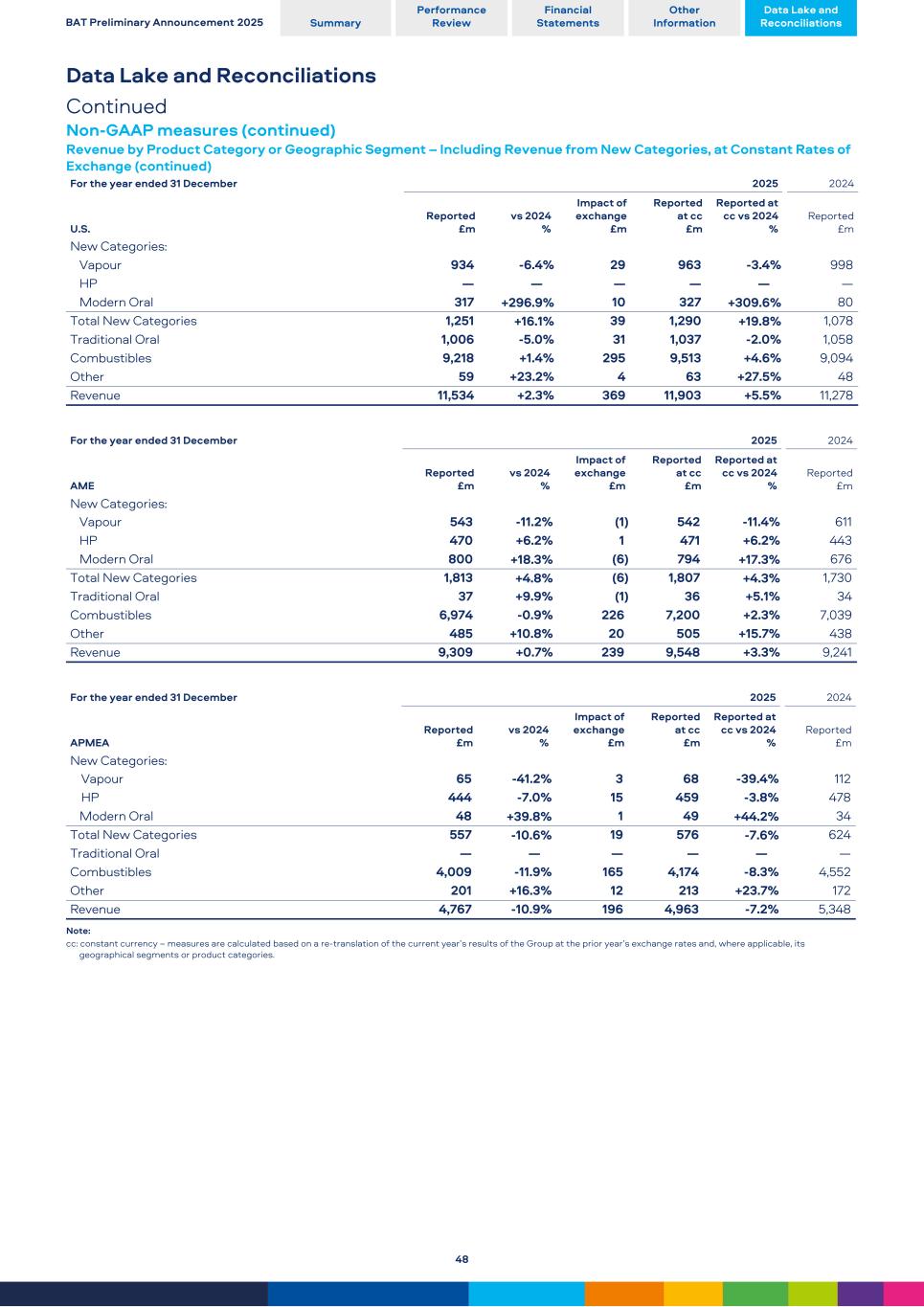Data Lake and Reconciliations Continued Non-GAAP measures (continued) Revenue by Product Category or Geographic Segment – Including Revenue from New Categories, at Constant Rates of Exchange (continued) For the year ended 31 December 2025 2024 U.S. Reported £m vs 2024 % Impact of exchange £m Reported at cc £m Reported at cc vs 2024 % Reported £m New Categories: Vapour 934 -6.4 % 29 963 -3.4 % 998 HP — — — — — — Modern Oral 317 +296.9 % 10 327 +309.6 % 80 Total New Categories 1,251 +16.1 % 39 1,290 +19.8 % 1,078 Traditional Oral 1,006 -5.0 % 31 1,037 -2.0 % 1,058 Combustibles 9,218 +1.4 % 295 9,513 +4.6 % 9,094 Other 59 +23.2 % 4 63 +27.5 % 48 Revenue 11,534 +2.3 % 369 11,903 +5.5 % 11,278 For the year ended 31 December 2025 2024 AME Reported £m vs 2024 % Impact of exchange £m Reported at cc £m Reported at cc vs 2024 % Reported £m New Categories: Vapour 543 -11.2 % (1) 542 -11.4 % 611 HP 470 +6.2 % 1 471 +6.2 % 443 Modern Oral 800 +18.3 % (6) 794 +17.3 % 676 Total New Categories 1,813 +4.8 % (6) 1,807 +4.3 % 1,730 Traditional Oral 37 +9.9 % (1) 36 +5.1 % 34 Combustibles 6,974 -0.9 % 226 7,200 +2.3 % 7,039 Other 485 +10.8 % 20 505 +15.7 % 438 Revenue 9,309 +0.7 % 239 9,548 +3.3 % 9,241 For the year ended 31 December 2025 2024 APMEA Reported £m vs 2024 % Impact of exchange £m Reported at cc £m Reported at cc vs 2024 % Reported £m New Categories: Vapour 65 -41.2 % 3 68 -39.4 % 112 HP 444 -7.0 % 15 459 -3.8 % 478 Modern Oral 48 +39.8 % 1 49 +44.2 % 34 Total New Categories 557 -10.6 % 19 576 -7.6 % 624 Traditional Oral — — — — — — Combustibles 4,009 -11.9 % 165 4,174 -8.3 % 4,552 Other 201 +16.3 % 12 213 +23.7 % 172 Revenue 4,767 -10.9 % 196 4,963 -7.2 % 5,348 Note: cc: constant currency – measures are calculated based on a re-translation of the current year’s results of the Group at the prior year’s exchange rates and, where applicable, its geographical segments or product categories. BAT Preliminary Announcement 2025 Summary Performance Review Financial Statements Other Information Data Lake and Reconciliations 48