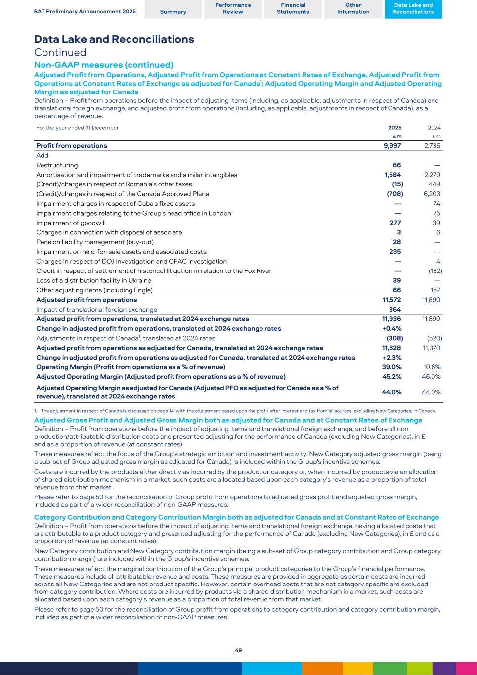 Data Lake and Reconciliations Continued Non-GAAP measures (continued) Adjusted Profit from Operations, Adjusted Profit from Operations at Constant Rates of Exchange, Adjusted Profit from Operations at Constant Rates of Exchange as adjusted for Canada1; Adjusted Operating Margin and Adjusted Operating Margin as adjusted for Canada Definition – Profit from operations before the impact of adjusting items (including, as applicable, adjustments in respect of Canada) and translational foreign exchange; and adjusted profit from operations (including, as applicable, adjustments in respect of Canada), as a percentage of revenue. For the year ended 31 December 2025 2024 £m £m Profit from operations 9,997 2,736 Add: Restructuring 66 — Amortisation and impairment of trademarks and similar intangibles 1,584 2,279 (Credit)/charges in respect of Romania's other taxes (15) 449 (Credit)/charges in respect of the Canada Approved Plans (708) 6,203 Impairment charges in respect of Cuba's fixed assets — 74 Impairment charges relating to the Group's head office in London — 75 Impairment of goodwill 277 39 Charges in connection with disposal of associate 3 6 Pension liability management (buy-out) 28 — Impairment on held-for-sale assets and associated costs 235 — Charges in respect of DOJ investigation and OFAC investigation — 4 Credit in respect of settlement of historical litigation in relation to the Fox River — (132) Loss of a distribution facility in Ukraine 39 — Other adjusting items (including Engle) 66 157 Adjusted profit from operations 11,572 11,890 Impact of translational foreign exchange 364 Adjusted profit from operations, translated at 2024 exchange rates 11,936 11,890 Change in adjusted profit from operations, translated at 2024 exchange rates +0.4% Adjustments in respect of Canada1, translated at 2024 rates (308) (520) Adjusted profit from operations as adjusted for Canada, translated at 2024 exchange rates 11,628 11,370 Change in adjusted profit from operations as adjusted for Canada, translated at 2024 exchange rates +2.3% Operating Margin (Profit from operations as a % of revenue) 39.0% 10.6% Adjusted Operating Margin (Adjusted profit from operations as a % of revenue) 45.2% 46.0% Adjusted Operating Margin as adjusted for Canada (Adjusted PFO as adjusted for Canada as a % of revenue), translated at 2024 exchange rates 44.0% 44.0% 1. The adjustment in respect of Canada is discussed on page 14, with the adjustment based upon the profit after interest and tax from all sources, excluding New Categories, in Canada. Adjusted Gross Profit and Adjusted Gross Margin both as adjusted for Canada and at Constant Rates of Exchange Definition – Profit from operations before the impact of adjusting items and translational foreign exchange, and before all non production/attributable distribution costs and presented adjusting for the performance of Canada (excluding New Categories), in £ and as a proportion of revenue (at constant rates). These measures reflect the focus of the Group's strategic ambition and investment activity. New Category adjusted gross margin (being a sub-set of Group adjusted gross margin as adjusted for Canada) is included within the Group's incentive schemes. Costs are incurred by the products either directly as incurred by the product or category or, when incurred by products via an allocation of shared distribution mechanism in a market, such costs are allocated based upon each category’s revenue as a proportion of total revenue from that market. Please refer to page 50 for the reconciliation of Group profit from operations to adjusted gross profit and adjusted gross margin, included as part of a wider reconciliation of non-GAAP measures. Category Contribution and Category Contribution Margin both as adjusted for Canada and at Constant Rates of Exchange Definition – Profit from operations before the impact of adjusting items and translational foreign exchange, having allocated costs that are attributable to a product category and presented adjusting for the performance of Canada (excluding New Categories), in £ and as a proportion of revenue (at constant rates). New Category contribution and New Category contribution margin (being a sub-set of Group category contribution and Group category contribution margin) are included within the Group's incentive schemes. These measures reflect the marginal contribution of the Group’s principal product categories to the Group’s financial performance. These measures include all attributable revenue and costs. These measures are provided in aggregate as certain costs are incurred across all New Categories and are not product specific. However, certain overhead costs that are not category specific are excluded from category contribution. Where costs are incurred by products via a shared distribution mechanism in a market, such costs are allocated based upon each category’s revenue as a proportion of total revenue from that market. Please refer to page 50 for the reconciliation of Group profit from operations to category contribution and category contribution margin, included as part of a wider reconciliation of non-GAAP measures. BAT Preliminary Announcement 2025 Summary Performance Review Financial Statements Other Information Data Lake and Reconciliations 49