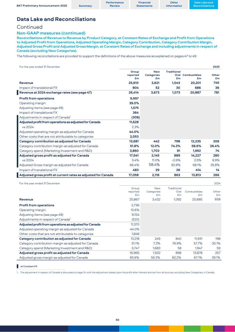 Data Lake and Reconciliations Continued Non-GAAP measures (continued) Reconciliations of Revenue to Revenue by Product Category, at Constant Rates of Exchange and Profit from Operations to Adjusted Profit from Operations, Adjusted Operating Margin, Category Contribution, Category Contribution Margin, Adjusted Gross Profit and Adjusted Gross Margin, at Constant Rates of Exchange and including adjustments in respect of Canada (excluding New Categories). The following reconciliations are provided to support the definitions of the above measures as explained on pages 47 to 49. For the year ended 31 December 2025 Group reported £m New Categories £m Traditional Oral £m Combustibles £m Other £m Revenue 25,610 3,621 1,043 20,201 745 Impact of translational FX 804 52 30 686 36 Revenue at 2024 exchange rates (see page 47) 26,414 3,673 1,073 20,887 781 Profit from operations 9,997 Operating margin 39.0% Adjusting items (see page 49) 1,575 Impact of translational FX 364 Adjustments in respect of Canada1 (308) Adjusted profit from operations as adjusted for Canada 11,628 vs 2024 2.3% Adjusted operating margin as adjusted for Canada 44.0% Other costs that are not attributable to categories 2,053 Category contribution as adjusted for Canada 13,681 442 798 12,235 206 Category contribution margin as adjusted for Canada 51.8% 12.0% 74.3% 58.6% 26.4% Category spend (Marketing Investment and R&D) 3,860 1,703 91 1,992 74 Adjusted gross profit as adjusted for Canada 17,541 2,145 889 14,227 280 vs 2024 3.4% 11.0% -0.9% 2.5% 8.9% Adjusted Gross margin as adjusted for Canada 66.4% 58.4% 82.8% 68.1% 35.8% Impact of translational FX 483 29 26 414 14 Adjusted gross profit at current rates as adjusted for Canada 17,058 2,116 863 13,813 266 For the year ended 31 December 2024 Group reported £m New Categories £m Traditional Oral £m Combustibles £m Other £m Revenue 25,867 3,432 1,092 20,685 658 Profit from operations 2,736 Operating margin 10.6% Adjusting items (see page 49) 9,154 Adjustments in respect of Canada1 (520) Adjusted profit from operations as adjusted for Canada 11,370 Adjusted operating margin as adjusted for Canada 44.0% Other costs that are not attributable to categories 1,848 Category contribution as adjusted for Canada 13,218 249 840 11,931 198 Category contribution margin as adjusted for Canada 51.1% 7.3% 76.9% 57.7% 30.1% Category spend (Marketing Investment and R&D) 3,747 1,683 58 1,947 59 Adjusted gross profit as adjusted for Canada 16,965 1,932 898 13,878 257 Adjusted gross margin as adjusted for Canada 65.6% 56.3% 82.2% 67.1% 39.1% at Constant FX 1. The adjustment in respect of Canada is discussed on page 14, with the adjustment based upon the profit after interest and tax from all sources, excluding New Categories, in Canada. BAT Preliminary Announcement 2025 Summary Performance Review Financial Statements Other Information Data Lake and Reconciliations 50