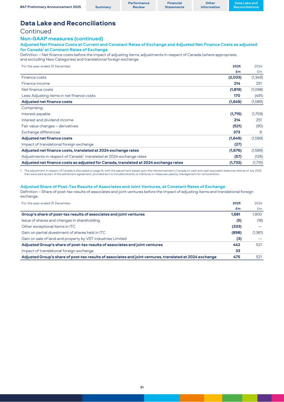 Data Lake and Reconciliations Continued Non-GAAP measures (continued) Adjusted Net Finance Costs at Current and Constant Rates of Exchange and Adjusted Net Finance Costs as adjusted for Canada1 at Constant Rates of Exchange Definition – Net finance costs before the impact of adjusting items, adjustments in respect of Canada (where appropriate, and excluding New Categories) and translational foreign exchange. For the year ended 31 December 2025 2024 £m £m Finance costs (2,033) (1,349) Finance income 214 251 Net finance costs (1,819) (1,098) Less: Adjusting items in net finance costs 170 (491) Adjusted net finance costs (1,649) (1,589) Comprising: Interest payable (1,715) (1,759) Interest and dividend income 214 251 Fair value changes – derivatives (521) (90) Exchange differences 373 9 Adjusted net finance costs (1,649) (1,589) Impact of translational foreign exchange (27) Adjusted net finance costs, translated at 2024 exchange rates (1,676) (1,589) Adjustments in respect of Canada1, translated at 2024 exchange rates (57) (126) Adjusted net finance costs as adjusted for Canada, translated at 2024 exchange rates (1,733) (1,715) 1. The adjustment in respect of Canada is discussed on page 14, with the adjustment based upon the interest earned in Canada on cash and cash equivalent balances held as of July 2025 that were paid as part of the settlement agreement, provided as it is included directly or indirectly in measures used by management for remuneration. Adjusted Share of Post-Tax Results of Associates and Joint Ventures, at Constant Rates of Exchange Definition – Share of post-tax results of associates and joint ventures before the impact of adjusting items and translational foreign exchange. For the year ended 31 December 2025 2024 £m £m Group’s share of post-tax results of associates and joint ventures 1,681 1,900 Issue of shares and changes in shareholding (5) (18) Other exceptional items in ITC (333) — Gain on partial divestment of shares held in ITC (898) (1,361) Gain on sale of land and property by VST industries Limited (3) — Adjusted Group’s share of post-tax results of associates and joint ventures 442 521 Impact of translational foreign exchange 33 Adjusted Group’s share of post-tax results of associates and joint ventures, translated at 2024 exchange 475 521 BAT Preliminary Announcement 2025 Summary Performance Review Financial Statements Other Information Data Lake and Reconciliations 51