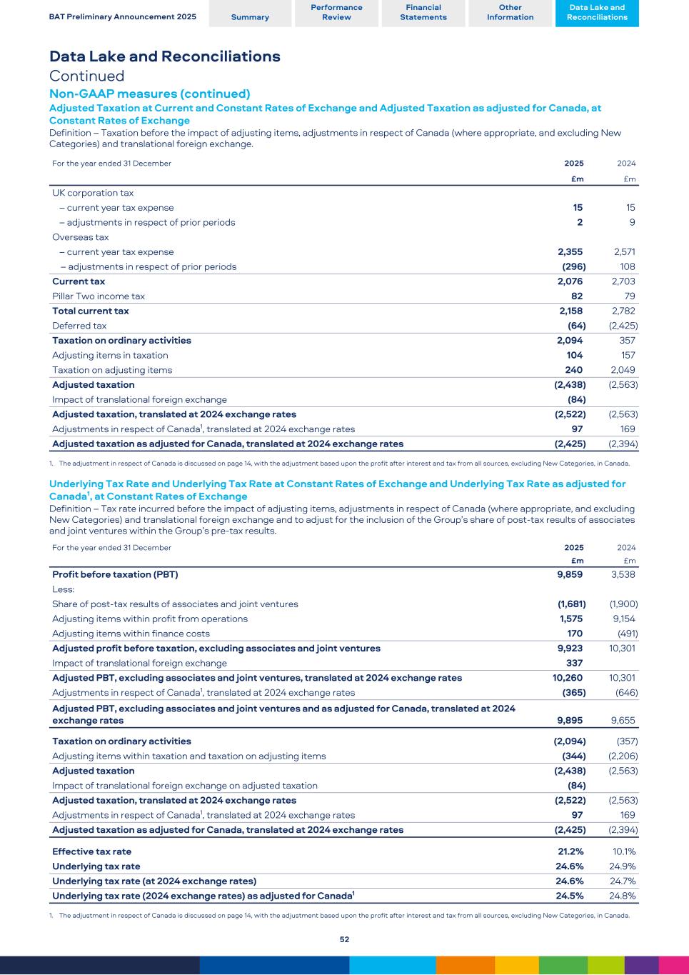Data Lake and Reconciliations Continued Non-GAAP measures (continued) Adjusted Taxation at Current and Constant Rates of Exchange and Adjusted Taxation as adjusted for Canada, at Constant Rates of Exchange Definition – Taxation before the impact of adjusting items, adjustments in respect of Canada (where appropriate, and excluding New Categories) and translational foreign exchange. For the year ended 31 December 2025 2024 £m £m UK corporation tax – current year tax expense 15 15 – adjustments in respect of prior periods 2 9 Overseas tax – current year tax expense 2,355 2,571 – adjustments in respect of prior periods (296) 108 Current tax 2,076 2,703 Pillar Two income tax 82 79 Total current tax 2,158 2,782 Deferred tax (64) (2,425) Taxation on ordinary activities 2,094 357 Adjusting items in taxation 104 157 Taxation on adjusting items 240 2,049 Adjusted taxation (2,438) (2,563) Impact of translational foreign exchange (84) Adjusted taxation, translated at 2024 exchange rates (2,522) (2,563) Adjustments in respect of Canada1, translated at 2024 exchange rates 97 169 Adjusted taxation as adjusted for Canada, translated at 2024 exchange rates (2,425) (2,394) 1. The adjustment in respect of Canada is discussed on page 14, with the adjustment based upon the profit after interest and tax from all sources, excluding New Categories, in Canada. Underlying Tax Rate and Underlying Tax Rate at Constant Rates of Exchange and Underlying Tax Rate as adjusted for Canada1, at Constant Rates of Exchange Definition – Tax rate incurred before the impact of adjusting items, adjustments in respect of Canada (where appropriate, and excluding New Categories) and translational foreign exchange and to adjust for the inclusion of the Group’s share of post-tax results of associates and joint ventures within the Group’s pre-tax results. For the year ended 31 December 2025 2024 £m £m Profit before taxation (PBT) 9,859 3,538 Less: Share of post-tax results of associates and joint ventures (1,681) (1,900) Adjusting items within profit from operations 1,575 9,154 Adjusting items within finance costs 170 (491) Adjusted profit before taxation, excluding associates and joint ventures 9,923 10,301 Impact of translational foreign exchange 337 Adjusted PBT, excluding associates and joint ventures, translated at 2024 exchange rates 10,260 10,301 Adjustments in respect of Canada1, translated at 2024 exchange rates (365) (646) Adjusted PBT, excluding associates and joint ventures and as adjusted for Canada, translated at 2024 exchange rates 9,895 9,655 Taxation on ordinary activities (2,094) (357) Adjusting items within taxation and taxation on adjusting items (344) (2,206) Adjusted taxation (2,438) (2,563) Impact of translational foreign exchange on adjusted taxation (84) Adjusted taxation, translated at 2024 exchange rates (2,522) (2,563) Adjustments in respect of Canada1, translated at 2024 exchange rates 97 169 Adjusted taxation as adjusted for Canada, translated at 2024 exchange rates (2,425) (2,394) Effective tax rate 21.2% 10.1% Underlying tax rate 24.6% 24.9% Underlying tax rate (at 2024 exchange rates) 24.6% 24.7% Underlying tax rate (2024 exchange rates) as adjusted for Canada1 24.5% 24.8% 1. The adjustment in respect of Canada is discussed on page 14, with the adjustment based upon the profit after interest and tax from all sources, excluding New Categories, in Canada. BAT Preliminary Announcement 2025 Summary Performance Review Financial Statements Other Information Data Lake and Reconciliations 52