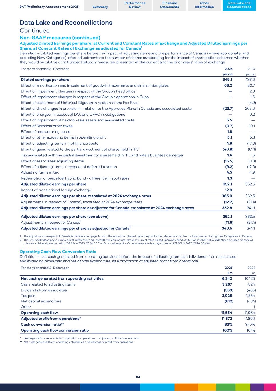 Data Lake and Reconciliations Continued Non-GAAP measures (continued) Adjusted Diluted Earnings per Share, at Current and Constant Rates of Exchange and Adjusted Diluted Earnings per Share, at Constant Rates of Exchange as adjusted for Canada1 Definition – Diluted earnings per share before the impact of adjusting items and the performance of Canada (where appropriate, and excluding New Categories), after adjustments to the number of shares outstanding for the impact of share option schemes whether they would be dilutive or not under statutory measures, presented at the current and the prior years’ rates of exchange. For the year ended 31 December 2025 2024 pence pence Diluted earnings per share 349.1 136.0 Effect of amortisation and impairment of goodwill, trademarks and similar intangibles 68.2 80.7 Effect of impairment charges in respect of the Group's head office — 2.9 Effect of impairment charges in respect of the Group's operations in Cuba — 1.6 Effect of settlement of historical litigation in relation to the Fox River — (4.9) Effect of the changes in provision in relation to the Approved Plans in Canada and associated costs (23.7) 205.0 Effect of charges in respect of DOJ and OFAC investigations — 0.2 Effect of impairment of held-for-sale assets and associated costs 5.5 — Effect of Romania other taxes (0.7) 20.1 Effect of restructuring costs 1.8 — Effect of other adjusting items in operating profit 5.1 5.3 Effect of adjusting items in net finance costs 4.9 (17.0) Effect of gains related to the partial divestment of shares held in ITC (40.8) (61.1) Tax associated with the partial divestment of shares held in ITC and hotels business demerger 1.6 1.6 Effect of associates’ adjusting items (15.5) (0.8) Effect of adjusting items in respect of deferred taxation (9.2) (12.0) Adjusting items in tax 4.5 4.9 Redemption of perpetual hybrid bond - difference in spot rates 1.3 — Adjusted diluted earnings per share 352.1 362.5 Impact of translational foreign exchange 12.9 Adjusted diluted earnings per share, translated at 2024 exchange rates 365.0 362.5 Adjustments in respect of Canada1, translated at 2024 exchange rates (12.2) (21.4) Adjusted diluted earnings per share as adjusted for Canada, translated at 2024 exchange rates 352.8 341.1 Adjusted diluted earnings per share (see above) 352.1 362.5 Adjustments in respect of Canada1 (11.6) (21.4) Adjusted diluted earnings per share as adjusted for Canada2 340.5 341.1 1. The adjustment in respect of Canada is discussed on page 14, with the adjustment based upon the profit after interest and tax from all sources, excluding New Categories, in Canada. 2. The Group’s dividend pay-out ratio is with reference to adjusted diluted earnings per share, at current rates. Based upon a dividend of 245.04p in 2025 (2024: 240.24p), discussed on page 44, this was a dividend pay-out ratio of 69.6% in 2025 (2024: 66.3%). On an adjusted for Canada basis, this is a pay-out ratio of 72.0% in 2025 (2024: 70.4%). Operating Cash Flow Conversion Ratio Definition – Net cash generated from operating activities before the impact of adjusting items and dividends from associates and excluding taxes paid and net capital expenditure, as a proportion of adjusted profit from operations. For the year ended 31 December 2025 2024 £m £m Net cash generated from operating activities 6,342 10,125 Cash related to adjusting items 3,267 824 Dividends from associates (369) (406) Tax paid 2,926 1,854 Net capital expenditure (612) (434) Other — 1 Operating cash flow 11,554 11,964 Adjusted profit from operations* 11,572 11,890 Cash conversion ratio** 63% 370% Operating cash flow conversion ratio 100% 101% * See page 49 for a reconciliation of profit from operations to adjusted profit from operations. ** Net cash generated from operating activities as a percentage of profit from operations. BAT Preliminary Announcement 2025 Summary Performance Review Financial Statements Other Information Data Lake and Reconciliations 53