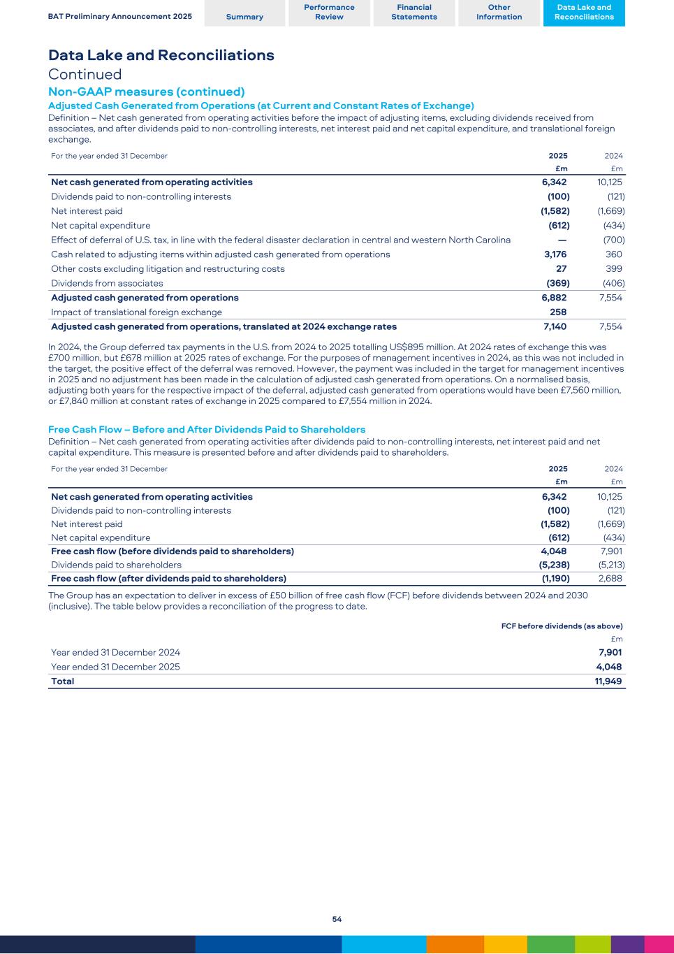Data Lake and Reconciliations Continued Non-GAAP measures (continued) Adjusted Cash Generated from Operations (at Current and Constant Rates of Exchange) Definition – Net cash generated from operating activities before the impact of adjusting items, excluding dividends received from associates, and after dividends paid to non-controlling interests, net interest paid and net capital expenditure, and translational foreign exchange. For the year ended 31 December 2025 2024 £m £m Net cash generated from operating activities 6,342 10,125 Dividends paid to non-controlling interests (100) (121) Net interest paid (1,582) (1,669) Net capital expenditure (612) (434) Effect of deferral of U.S. tax, in line with the federal disaster declaration in central and western North Carolina — (700) Cash related to adjusting items within adjusted cash generated from operations 3,176 360 Other costs excluding litigation and restructuring costs 27 399 Dividends from associates (369) (406) Adjusted cash generated from operations 6,882 7,554 Impact of translational foreign exchange 258 Adjusted cash generated from operations, translated at 2024 exchange rates 7,140 7,554 In 2024, the Group deferred tax payments in the U.S. from 2024 to 2025 totalling US$895 million. At 2024 rates of exchange this was £700 million, but £678 million at 2025 rates of exchange. For the purposes of management incentives in 2024, as this was not included in the target, the positive effect of the deferral was removed. However, the payment was included in the target for management incentives in 2025 and no adjustment has been made in the calculation of adjusted cash generated from operations. On a normalised basis, adjusting both years for the respective impact of the deferral, adjusted cash generated from operations would have been £7,560 million, or £7,840 million at constant rates of exchange in 2025 compared to £7,554 million in 2024. Free Cash Flow – Before and After Dividends Paid to Shareholders Definition – Net cash generated from operating activities after dividends paid to non-controlling interests, net interest paid and net capital expenditure. This measure is presented before and after dividends paid to shareholders. For the year ended 31 December 2025 2024 £m £m Net cash generated from operating activities 6,342 10,125 Dividends paid to non-controlling interests (100) (121) Net interest paid (1,582) (1,669) Net capital expenditure (612) (434) Free cash flow (before dividends paid to shareholders) 4,048 7,901 Dividends paid to shareholders (5,238) (5,213) Free cash flow (after dividends paid to shareholders) (1,190) 2,688 The Group has an expectation to deliver in excess of £50 billion of free cash flow (FCF) before dividends between 2024 and 2030 (inclusive). The table below provides a reconciliation of the progress to date. FCF before dividends (as above) £m Year ended 31 December 2024 7,901 Year ended 31 December 2025 4,048 Total 11,949 BAT Preliminary Announcement 2025 Summary Performance Review Financial Statements Other Information Data Lake and Reconciliations 54