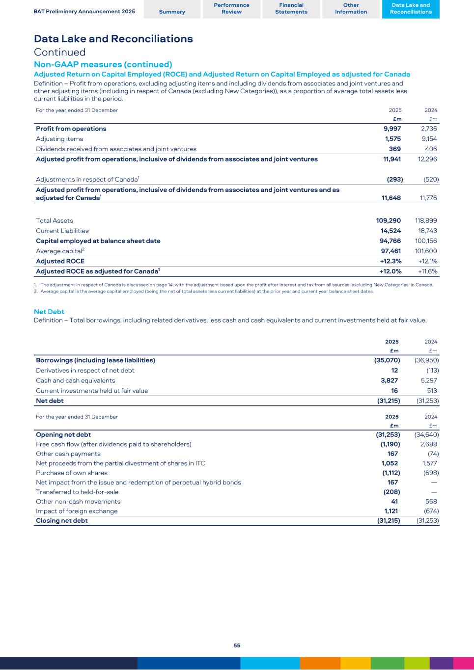 Data Lake and Reconciliations Continued Non-GAAP measures (continued) Adjusted Return on Capital Employed (ROCE) and Adjusted Return on Capital Employed as adjusted for Canada Definition – Profit from operations, excluding adjusting items and including dividends from associates and joint ventures and other adjusting items (including in respect of Canada (excluding New Categories)), as a proportion of average total assets less current liabilities in the period. For the year ended 31 December 2025 2024 £m £m Profit from operations 9,997 2,736 Adjusting items 1,575 9,154 Dividends received from associates and joint ventures 369 406 Adjusted profit from operations, inclusive of dividends from associates and joint ventures 11,941 12,296 Adjustments in respect of Canada1 (293) (520) Adjusted profit from operations, inclusive of dividends from associates and joint ventures and as adjusted for Canada1 11,648 11,776 Total Assets 109,290 118,899 Current Liabilities 14,524 18,743 Capital employed at balance sheet date 94,766 100,156 Average capital2 97,461 101,600 Adjusted ROCE +12.3% +12.1% Adjusted ROCE as adjusted for Canada1 +12.0% +11.6% 1. The adjustment in respect of Canada is discussed on page 14, with the adjustment based upon the profit after interest and tax from all sources, excluding New Categories, in Canada. 2. Average capital is the average capital employed (being the net of total assets less current liabilities) at the prior year and current year balance sheet dates. Net Debt Definition – Total borrowings, including related derivatives, less cash and cash equivalents and current investments held at fair value. 2025 2024 £m £m Borrowings (including lease liabilities) (35,070) (36,950) Derivatives in respect of net debt 12 (113) Cash and cash equivalents 3,827 5,297 Current investments held at fair value 16 513 Net debt (31,215) (31,253) For the year ended 31 December 2025 2024 £m £m Opening net debt (31,253) (34,640) Free cash flow (after dividends paid to shareholders) (1,190) 2,688 Other cash payments 167 (74) Net proceeds from the partial divestment of shares in ITC 1,052 1,577 Purchase of own shares (1,112) (698) Net impact from the issue and redemption of perpetual hybrid bonds 167 — Transferred to held-for-sale (208) — Other non-cash movements 41 568 Impact of foreign exchange 1,121 (674) Closing net debt (31,215) (31,253) BAT Preliminary Announcement 2025 Summary Performance Review Financial Statements Other Information Data Lake and Reconciliations 55