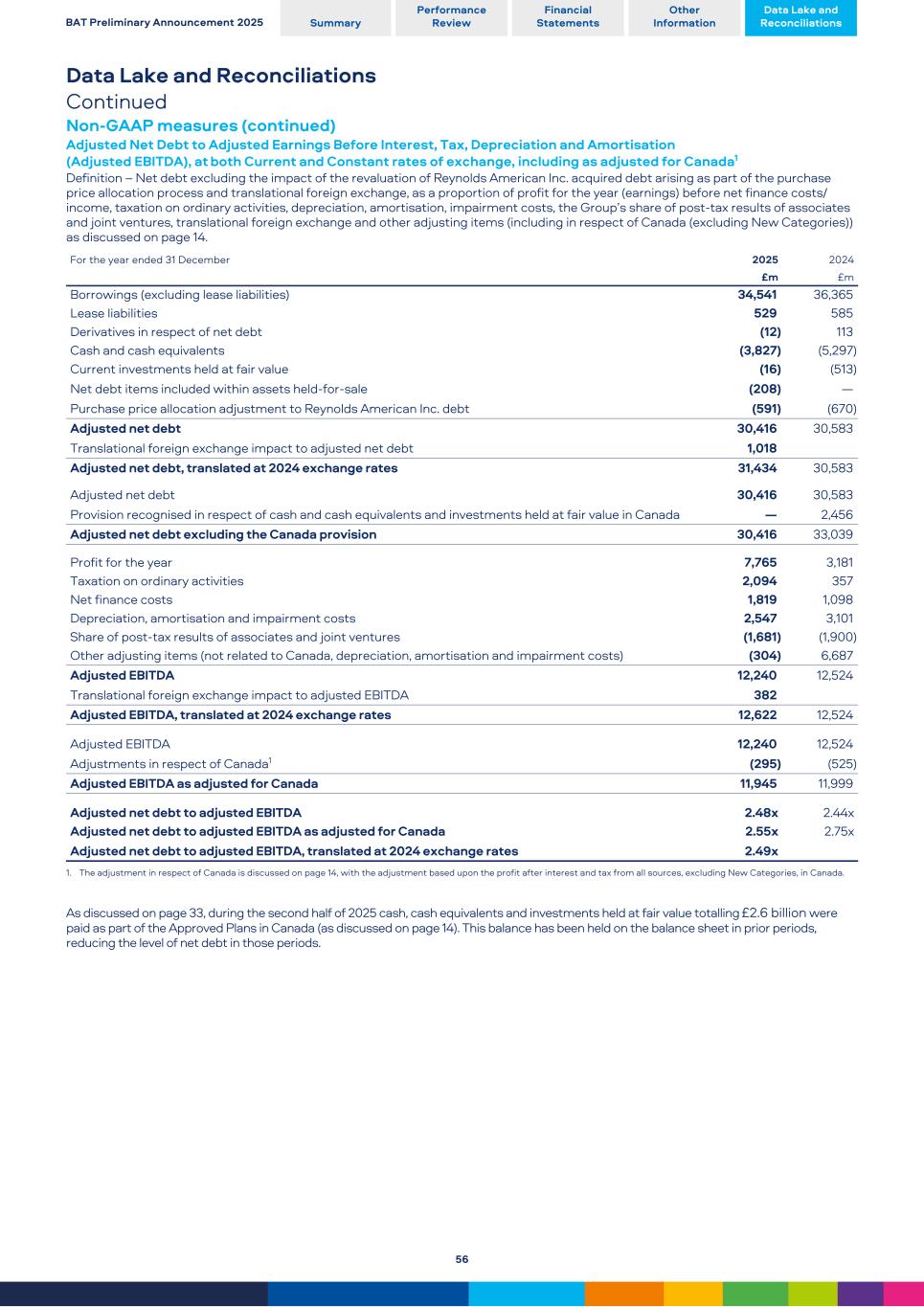 Data Lake and Reconciliations Continued Non-GAAP measures (continued) Adjusted Net Debt to Adjusted Earnings Before Interest, Tax, Depreciation and Amortisation (Adjusted EBITDA), at both Current and Constant rates of exchange, including as adjusted for Canada1 Definition – Net debt excluding the impact of the revaluation of Reynolds American Inc. acquired debt arising as part of the purchase price allocation process and translational foreign exchange, as a proportion of profit for the year (earnings) before net finance costs/ income, taxation on ordinary activities, depreciation, amortisation, impairment costs, the Group’s share of post-tax results of associates and joint ventures, translational foreign exchange and other adjusting items (including in respect of Canada (excluding New Categories)) as discussed on page 14. For the year ended 31 December 2025 2024 £m £m Borrowings (excluding lease liabilities) 34,541 36,365 Lease liabilities 529 585 Derivatives in respect of net debt (12) 113 Cash and cash equivalents (3,827) (5,297) Current investments held at fair value (16) (513) Net debt items included within assets held-for-sale (208) — Purchase price allocation adjustment to Reynolds American Inc. debt (591) (670) Adjusted net debt 30,416 30,583 Translational foreign exchange impact to adjusted net debt 1,018 Adjusted net debt, translated at 2024 exchange rates 31,434 30,583 Adjusted net debt 30,416 30,583 Provision recognised in respect of cash and cash equivalents and investments held at fair value in Canada — 2,456 Adjusted net debt excluding the Canada provision 30,416 33,039 Profit for the year 7,765 3,181 Taxation on ordinary activities 2,094 357 Net finance costs 1,819 1,098 Depreciation, amortisation and impairment costs 2,547 3,101 Share of post-tax results of associates and joint ventures (1,681) (1,900) Other adjusting items (not related to Canada, depreciation, amortisation and impairment costs) (304) 6,687 Adjusted EBITDA 12,240 12,524 Translational foreign exchange impact to adjusted EBITDA 382 Adjusted EBITDA, translated at 2024 exchange rates 12,622 12,524 Adjusted EBITDA 12,240 12,524 Adjustments in respect of Canada1 (295) (525) Adjusted EBITDA as adjusted for Canada 11,945 11,999 Adjusted net debt to adjusted EBITDA 2.48x 2.44x Adjusted net debt to adjusted EBITDA as adjusted for Canada 2.55x 2.75x Adjusted net debt to adjusted EBITDA, translated at 2024 exchange rates 2.49x 1. The adjustment in respect of Canada is discussed on page 14, with the adjustment based upon the profit after interest and tax from all sources, excluding New Categories, in Canada. As discussed on page 33, during the second half of 2025 cash, cash equivalents and investments held at fair value totalling £2.6 billion were paid as part of the Approved Plans in Canada (as discussed on page 14). This balance has been held on the balance sheet in prior periods, reducing the level of net debt in those periods. BAT Preliminary Announcement 2025 Summary Performance Review Financial Statements Other Information Data Lake and Reconciliations 56