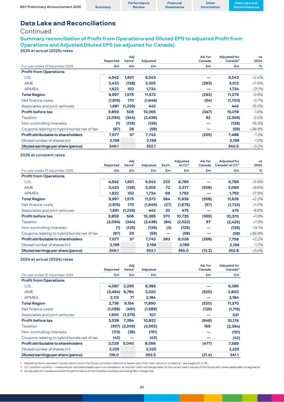 Data Lake and Reconciliations Continued Summary reconciliation of Profit from Operations and Diluted EPS to adjusted Profit from Operations and Adjusted Diluted EPS (as adjusted for Canada) 2025 at actual (2025) rates For year ended 31 December 2025 Reported Adj Items1 Adjusted Ad. for Canada Adjusted for Canada3 vs 2024 £m £m £m £m £m % Profit from Operations U.S. 4,942 1,601 6,543 — 6,543 +2.4 % AME 3,433 (128) 3,305 (293) 3,012 +7.6 % APMEA 1,622 102 1,724 — 1,724 -21.1 % Total Region 9,997 1,575 11,572 (293) 11,279 -0.8 % Net finance costs (1,819) 170 (1,649) (54) (1,703) -0.7 % Associates and joint ventures 1,681 (1,239) 442 — 442 -15.0 % Profit before tax 9,859 506 10,365 (347) 10,018 -1.6 % Taxation (2,094) (344) (2,438) 92 (2,346) -2.0 % Non-controlling interests (1) (125) (126) — (126) -16.3 % Coupons relating to hybrid bonds net of tax (87) 29 (58) — (58) +36.9 % Profit attributable to shareholders 7,677 37 7,743 (255) 7,488 -1.3 % Diluted number of shares (m) 2,199 2,199 2,199 -1.2 % Diluted earnings per share (pence) 349.1 352.1 340.5 -0.2 % 2025 at constant rates For year ended 31 December 2025 Reported Adj Items1 Adjusted Exch. Adjusted at CC2 Ad. for Canada Adjusted for Canada3 at CC2 vs 2024 £m £m £m £m £m £m £m % Profit from Operations U.S. 4,942 1,601 6,543 223 6,766 — 6,766 +5.9 % AME 3,433 (128) 3,305 72 3,377 (308) 3,069 +9.6 % APMEA 1,622 102 1,724 69 1,793 — 1,793 -17.9 % Total Region 9,997 1,575 11,572 364 11,936 (308) 11,628 +2.3 % Net finance costs (1,819) 170 (1,649) (27) (1,676) (57) (1,733) +1.0 % Associates and joint ventures 1,681 (1,239) 442 33 475 — 475 -8.6 % Profit before tax 9,859 506 10,365 370 10,735 (365) 10,370 +1.9 % Taxation (2,094) (344) (2,438) (84) (2,522) 97 (2,425) +1.3 % Non-controlling interests (1) (125) (126) (3) (129) — (129) -14.1 % Coupons relating to hybrid bonds net of tax (87) 29 (58) — (58) — (58) +36.9 % Profit attributable to shareholders 7,677 37 7,743 283 8,026 (268) 7,758 +2.2 % Diluted number of shares (m) 2,199 2,199 2,199 2,199 -1.2 % Diluted earnings per share (pence) 349.1 352.1 365.0 (12.2) 352.8 +3.4 % 2024 at actual (2024) rates For year ended 31 December 2024 Reported Adj Items1 Adjusted Ad. for Canada Adjusted for Canada3 £m £m £m £m £m Profit from Operations U.S. 4,087 2,299 6,386 — 6,386 AME (3,464) 6,784 3,320 (520) 2,800 APMEA 2,113 71 2,184 — 2,184 Total Region 2,736 9,154 11,890 (520) 11,370 Net finance costs (1,098) (491) (1,589) (126) (1,715) Associates and joint ventures 1,900 (1,379) 521 — 521 Profit before tax 3,538 7,284 10,822 (646) 10,176 Taxation (357) (2,206) (2,563) 169 (2,394) Non-controlling interests (113) (38) (151) — (151) Coupons relating to hybrid bonds net of tax (42) — (42) — (42) Profit attributable to shareholders 3,026 5,040 8,066 (477) 7,589 Diluted number of shares (m) 2,225 2,225 2,225 Diluted earnings per share (pence) 136.0 362.5 (21.4) 341.1 1. Adjusting items represent certain items which the Group considers distinctive based upon their size, nature or incidence - see pages 25 to 30. 2. CC: constant currency – measures are calculated based upon a re-translation, at the prior year’s exchange rates, of the current year’s results of the Group and, where applicable, its segments. 3. As adjusted for Canada excludes the performance of the Canadian business (excluding New Categories). BAT Preliminary Announcement 2025 Summary Performance Review Financial Statements Other Information Data Lake and Reconciliations 57