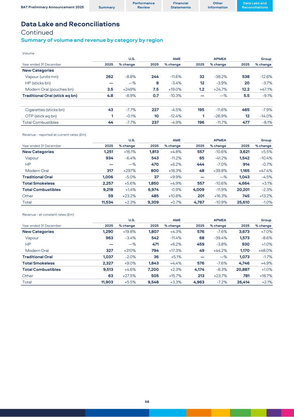 Data Lake and Reconciliations Continued Summary of volume and revenue by category by region Volume Year ended 31 December U.S. AME APMEA Group 2025 % change 2025 % change 2025 % change 2025 % change New Categories Vapour (units mn) 262 -8.8 % 244 -11.6 % 32 -38.2 % 538 -12.6 % HP (sticks bn) — — % 8 -3.4 % 12 -3.9 % 20 -3.7 % Modern Oral (pouches bn) 3.5 +249 % 7.5 +19.0 % 1.2 +24.7 % 12.2 +47.1 % Traditional Oral (stick eq bn) 4.8 -8.9 % 0.7 -10.3 % — — % 5.5 -9.1 % Cigarettes (sticks bn) 43 -7.7 % 227 -4.5 % 195 -11.6 % 465 -7.9 % OTP (stick eq bn) 1 -0.1 % 10 -12.4 % 1 -26.9 % 12 -14.0 % Total Combustibles 44 -7.7 % 237 -4.9 % 196 -11.7 % 477 -8.1 % Revenue - reported at current rates (£m) Year ended 31 December U.S. AME APMEA Group 2025 % change 2025 % change 2025 % change 2025 % change New Categories 1,251 +16.1 % 1,813 +4.8 % 557 -10.6 % 3,621 +5.5 % Vapour 934 -6.4 % 543 -11.2 % 65 -41.2 % 1,542 -10.4 % HP — — % 470 +6.2 % 444 -7.0 % 914 -0.7 % Modern Oral 317 +297 % 800 +18.3 % 48 +39.8 % 1,165 +47.4 % Traditional Oral 1,006 -5.0 % 37 +9.9 % — — % 1,043 -4.5 % Total Smokeless 2,257 +5.6 % 1,850 +4.9 % 557 -10.6 % 4,664 +3.1 % Total Combustibles 9,218 +1.4 % 6,974 -0.9 % 4,009 -11.9 % 20,201 -2.3 % Other 59 +23.2 % 485 +10.8 % 201 +16.3 % 745 +13.2 % Total 11,534 +2.3 % 9,309 +0.7 % 4,767 -10.9 % 25,610 -1.0 % Revenue - at constant rates (£m) Year ended 31 December U.S. AME APMEA Group 2025 % change 2025 % change 2025 % change 2025 % change New Categories 1,290 +19.8 % 1,807 +4.3 % 576 -7.6 % 3,673 +7.0 % Vapour 963 -3.4 % 542 -11.4 % 68 -39.4 % 1,573 -8.6 % HP — — % 471 +6.2 % 459 -3.8 % 930 +1.0 % Modern Oral 327 +310 % 794 +17.3 % 49 +44.2 % 1,170 +48.0 % Traditional Oral 1,037 -2.0 % 36 +5.1 % — — % 1,073 -1.7 % Total Smokeless 2,327 +9.0 % 1,843 +4.4 % 576 -7.6 % 4,746 +4.9 % Total Combustibles 9,513 +4.6 % 7,200 +2.3 % 4,174 -8.3 % 20,887 +1.0 % Other 63 +27.5 % 505 +15.7 % 213 +23.7 % 781 +18.7 % Total 11,903 +5.5 % 9,548 +3.3 % 4,963 -7.2 % 26,414 +2.1 % BAT Preliminary Announcement 2025 Summary Performance Review Financial Statements Other Information Data Lake and Reconciliations 58