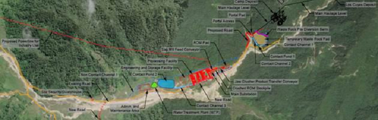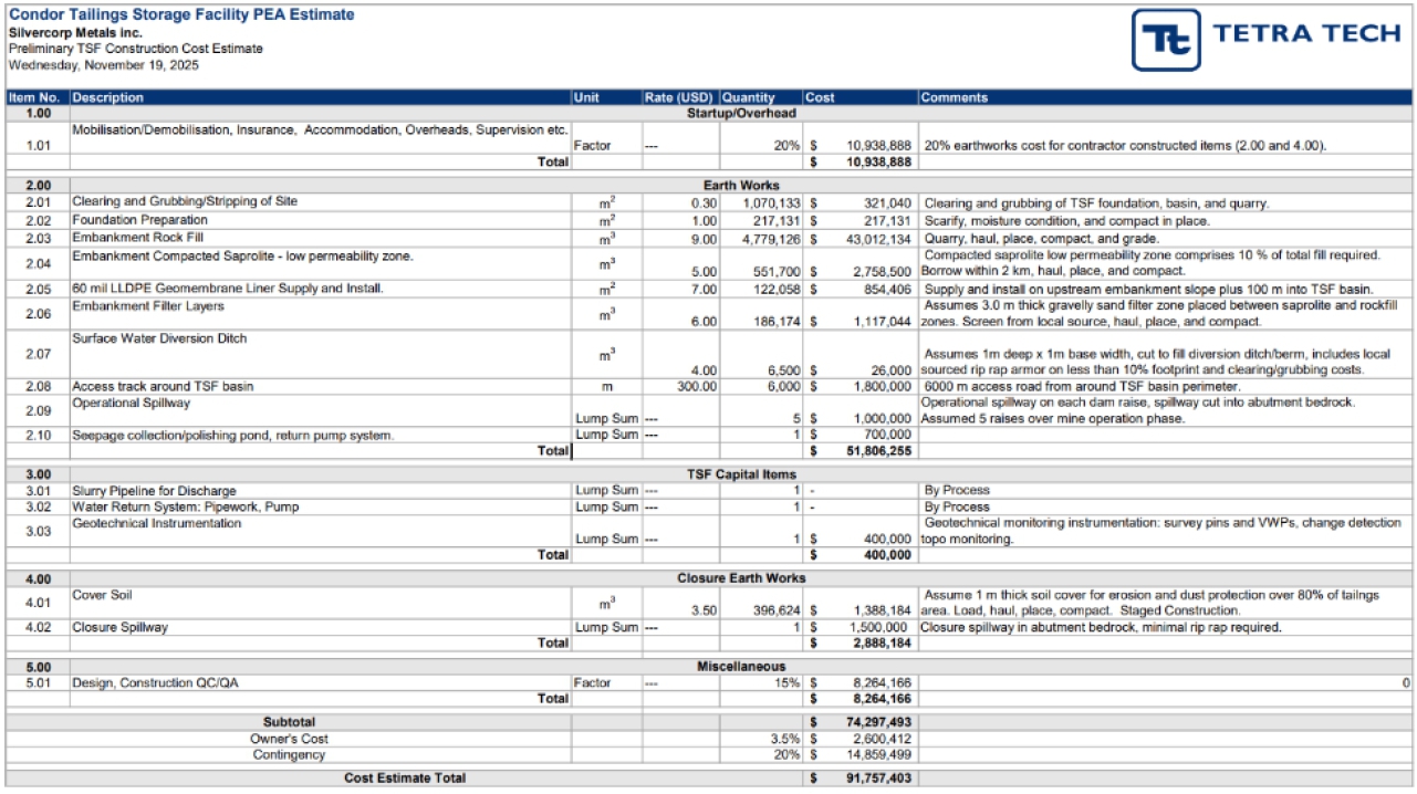 Geotechnical investigation and assessment. The scope of this work will involve characterization of the TSF embankment foundations, basin, and potential borrow areas. Assessment will involve materials characterization, preliminary geological model development, and preliminary stability and seepage modelling for the TSF. US$100k.