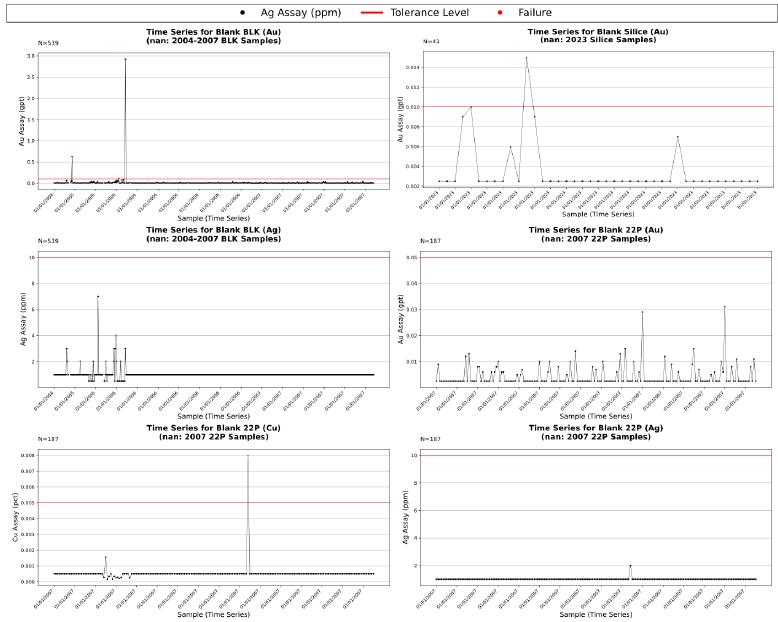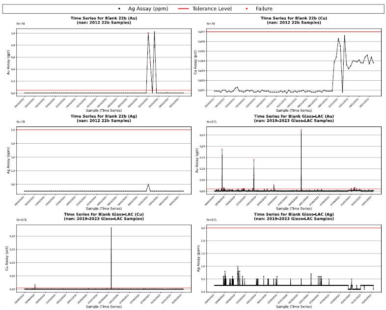 Time Series Plots for Blank Material Samples Assayed Between 2012 and 2023