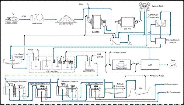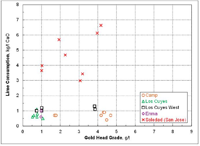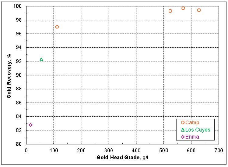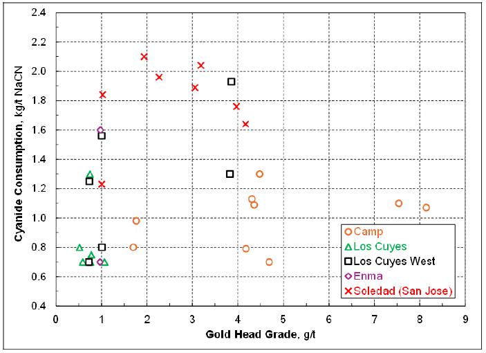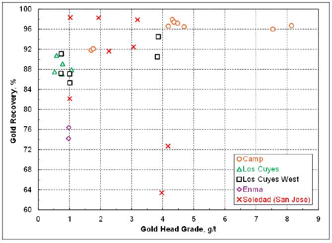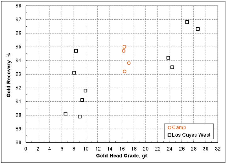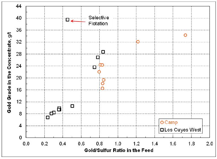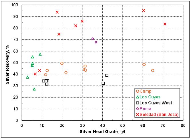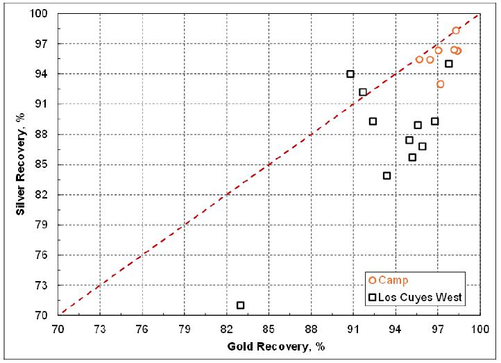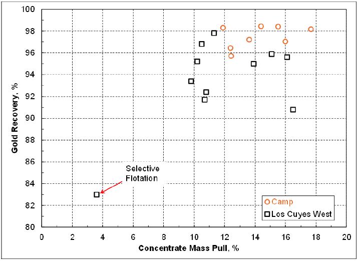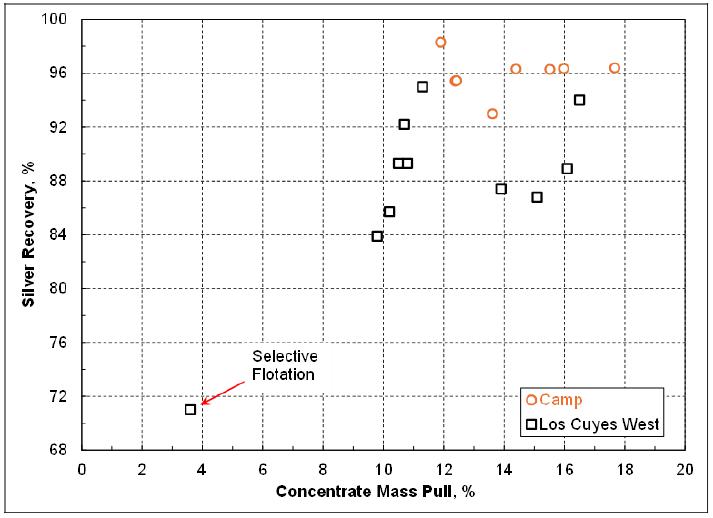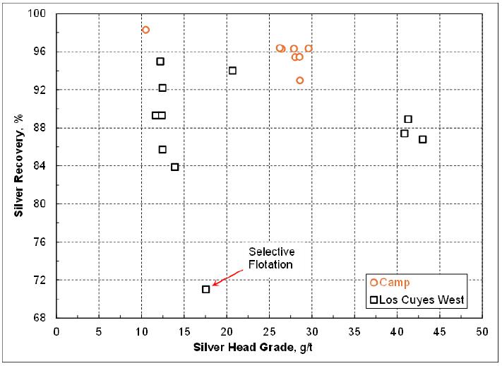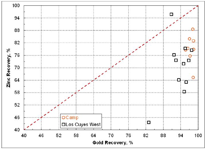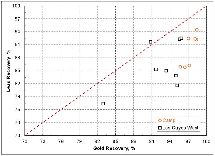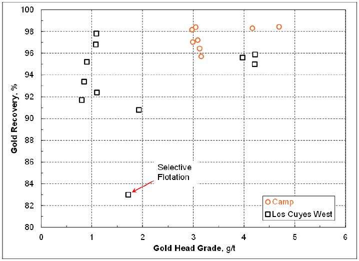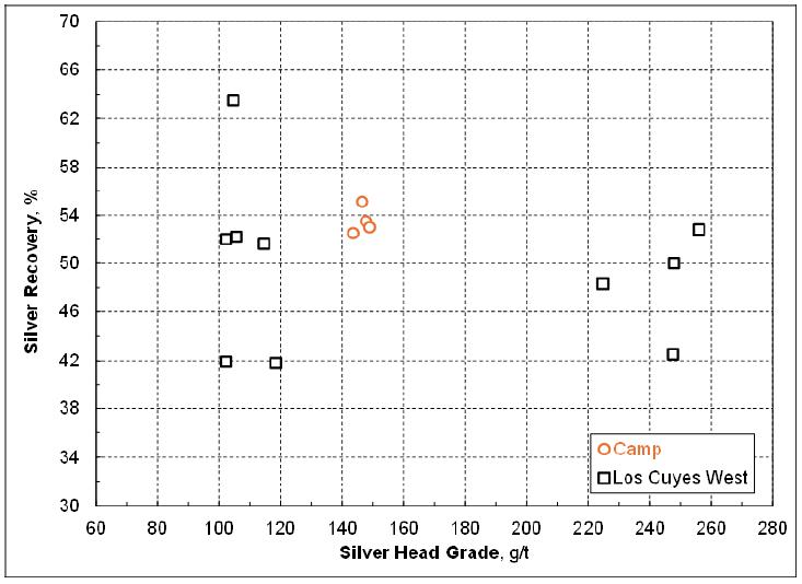 The cyanide leach tail after cyanide destruction has never been tested for the sequential selective flotation to generate the lead/silver concentrate and zinc/silver concentrate. The oxidizing nature during cyanide destruction may deteriorate the subsequent flotation performance. Although the economic contribution by these two flotation concentrates will be marginal, a series of flotation tests are needed to verify the marketable lead/silver concentrate and zinc/silver concentrate can indeed be produced consistently. Previous testwork data showed the concentrates produced from the Los Cuyes West domain contained high levels of arsenic, cadmium and antimony. The assays of these penalty elements plus mercury, chloride and fluoride, etc should be repeated when the representative flotation concentrates become available.