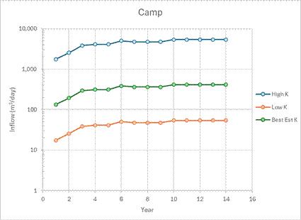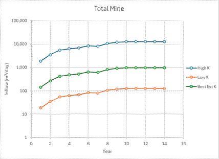 Field data for assessing the hydrogeological system should be collected as part of either exploration or mine geotechnical drilling. This work could consist of packer based injection test to determine hydraulic conductivity (K) and/or installation of monitoring wells for K testing and water quality sampling. Hydraulic testing of geological structures should be carried out when possible as these are likely to be the dominant inflow paths/features. US$500k.