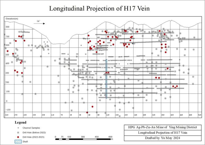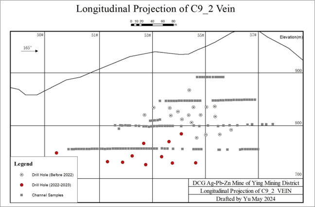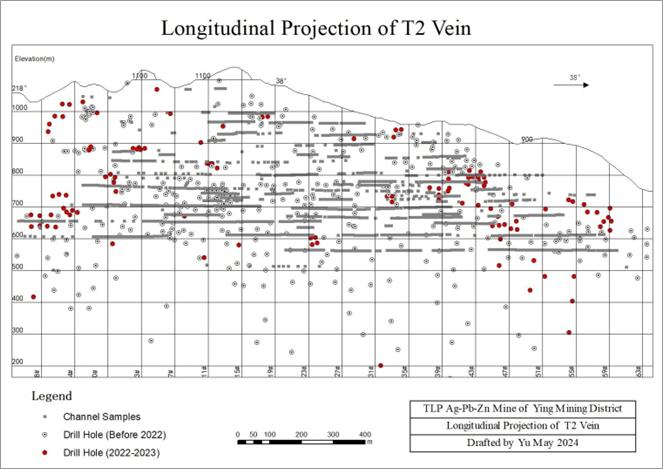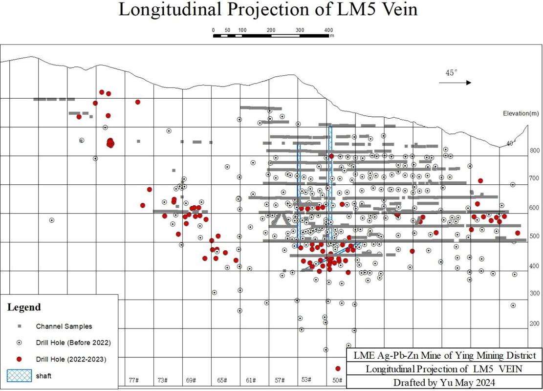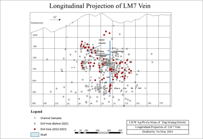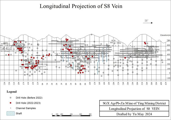 Other than drilling, the mines have been explored primarily from underground workings. The workings follow vein structures along strike, on levels spaced approximately 40 m apart. Channel samples across the structures are collected at 5 m intervals. From 1 January 2022 to 31 December 2023, Silvercorp undertook 116,123 m of tunnelling, and collected 64,573 channel samples. This brings the total number of metres of tunnelling completed on the Property by Silvercorp to 797,997 m with 305,376 channel samples collected.