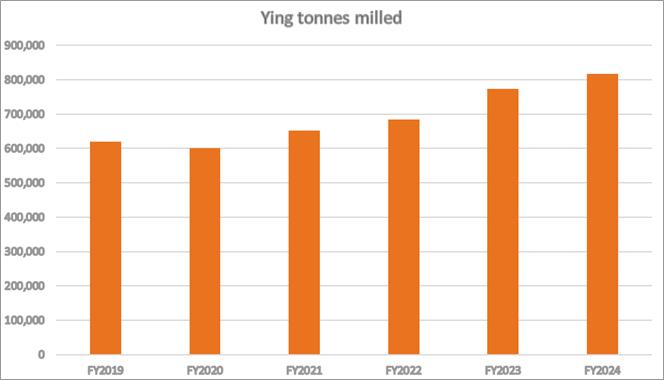 Silver-lead-zinc mineralization in the Ying district has been known and intermittently mined for several hundred years. Silvercorp acquired an interest in the SGX project in 2004, the HPG project in 2006, and the TLP / LMW / LME projects in late 2007. Annual production has risen in recent years, with tonnages close to 650,000 tonnes per annum (tpa) from FY2021 through FY2022, 773,000 tpa in FY2023, and 827,000 in FY2024. The QP notes that the Silvercorp fiscal year (FY) begins in April, thus FY2024 runs from 1 April 2023 to 31 March 2024.